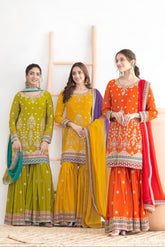 Product Details TOP Heavy Chinon with Embroidery BOTTOM Heavy Chinon with Embroidery DUPATTA Chinon with Embroidery Elegant heavy Chinon top with intricate embroidery, paired with matching plazo and an embroidered Chinon dupatta. Perfect for festive occasions, weddings, and parties. Occasion Festive Wear Wedding Functions...- $132.00