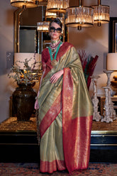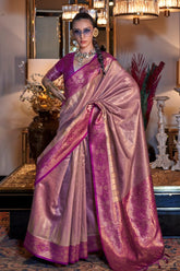 FABRIC DETAILS SAREE: Handwoven Zari Tissue Silk with Contrast Pallu & Blouse Product Details Experience luxury draped in tradition with Zariya Aura, a stunning handwoven zari tissue silk saree. Its subtle shimmer and lightweight texture offer a regal look, beautifully complemented by a rich...- $90.00