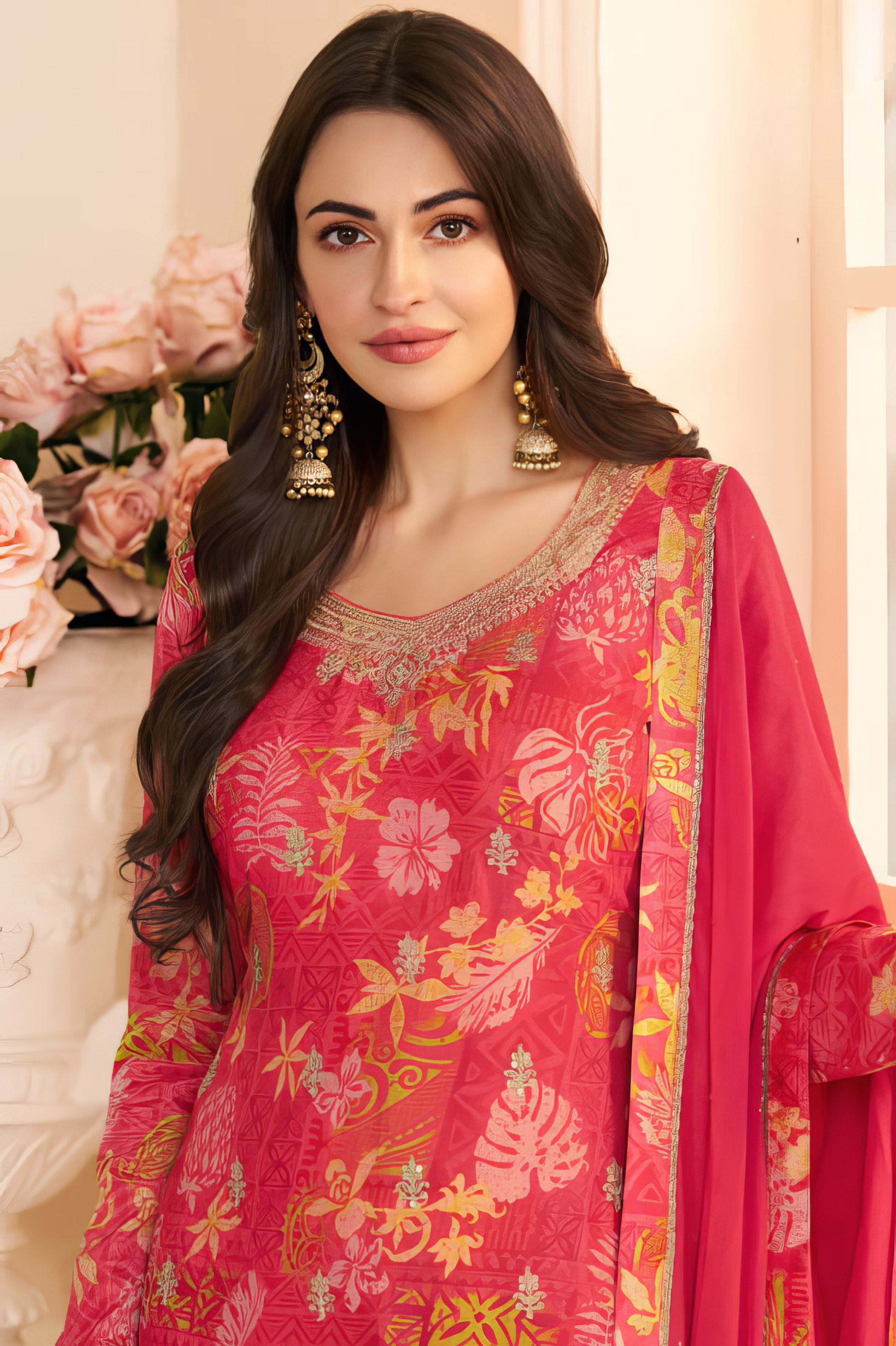 This graceful ensemble features a beautifully embroidered Chinon top enhanced with a stunning digital print for a modern yet traditional appeal. It is paired with a premium soft Santoon bottom for maximum comfort and style. The highlight of the outfit is the Chinon dupatta, adorned with Swarovski work, delicate embroidery, and a four-sided digital print border lace that adds a refined touch of sophistication.