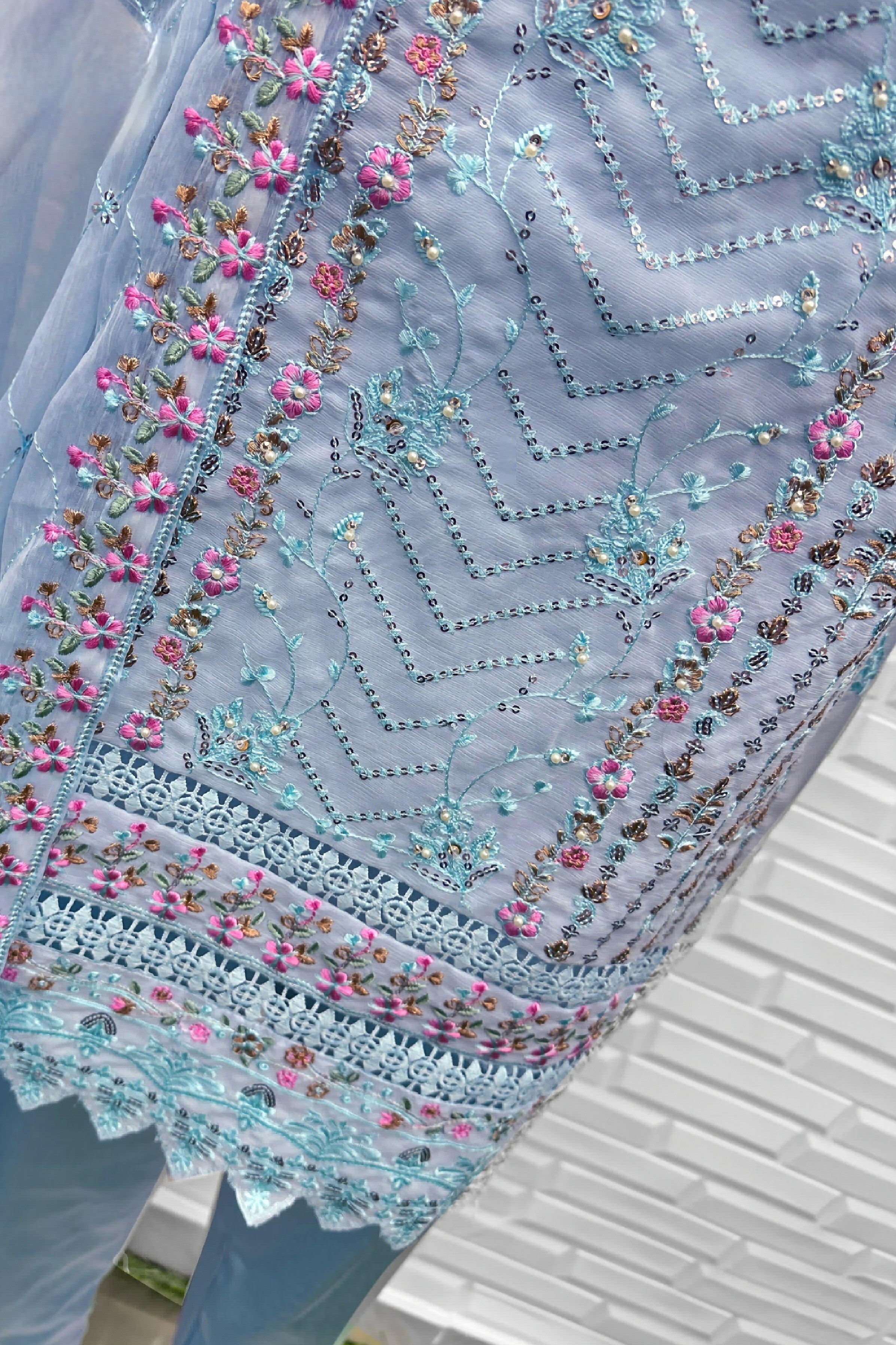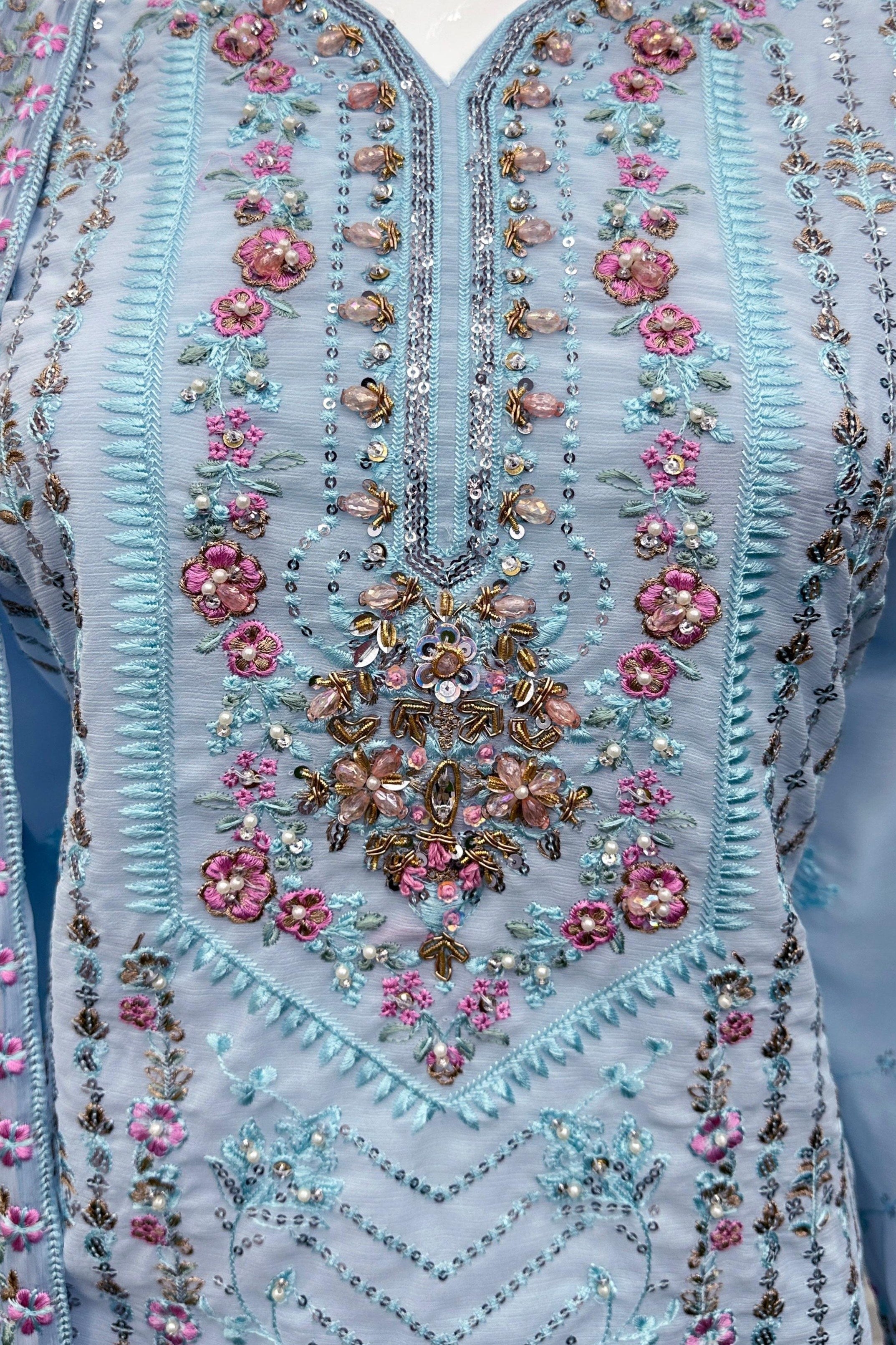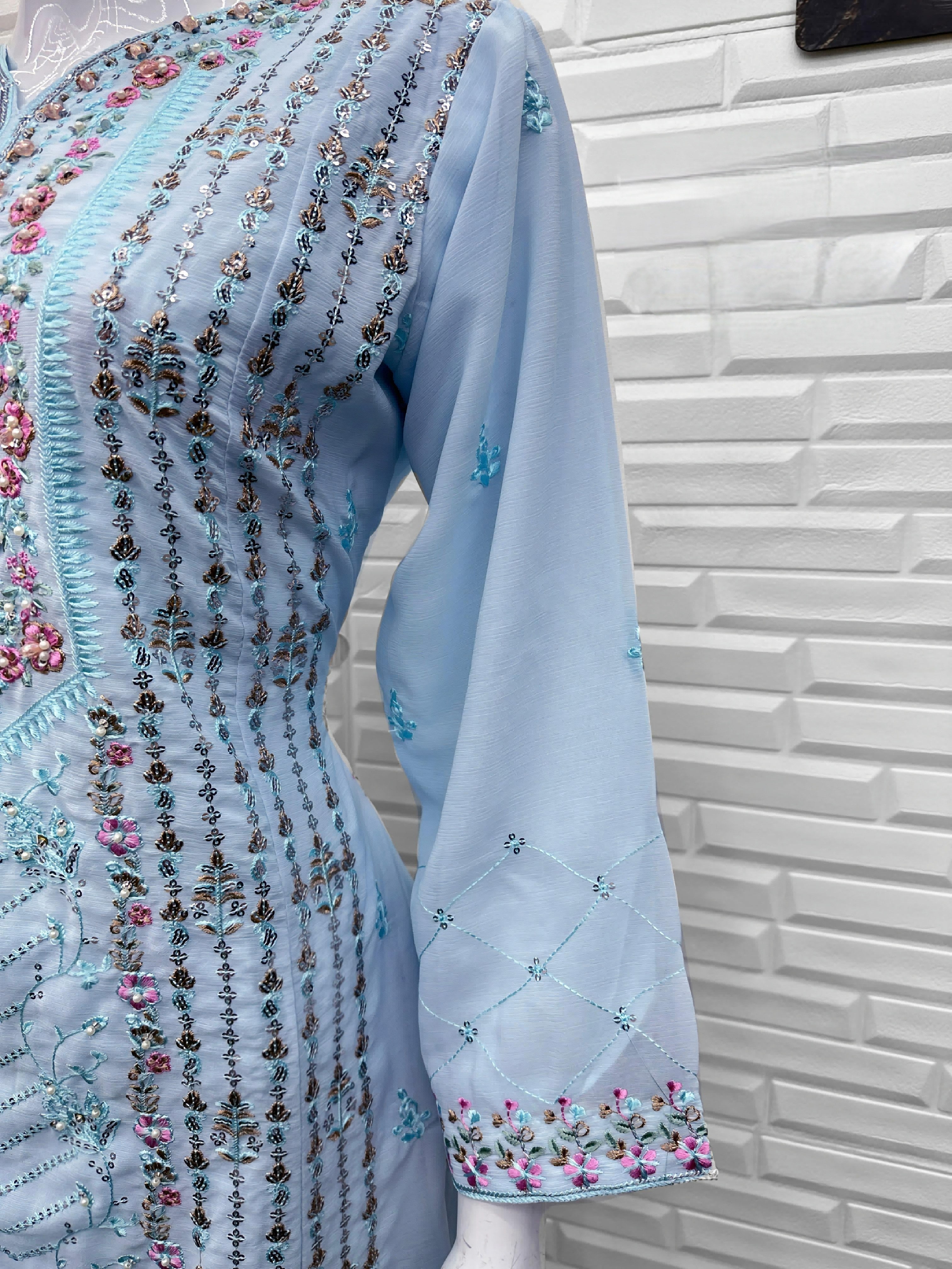 This designer tunic is beautifully embellished with embroidery, sequins work, and delicate handwork on premium chiffon fabric. The top and sleeves are highlighted with lace work and fine sequin detailing, adding a graceful sparkle. It is paired with a classic stretchable cotton pant for comfort and structure. The ensemble is completed with a chiffon dupatta featuring rich embroidery and multi-sequins work for a refined, festive look.