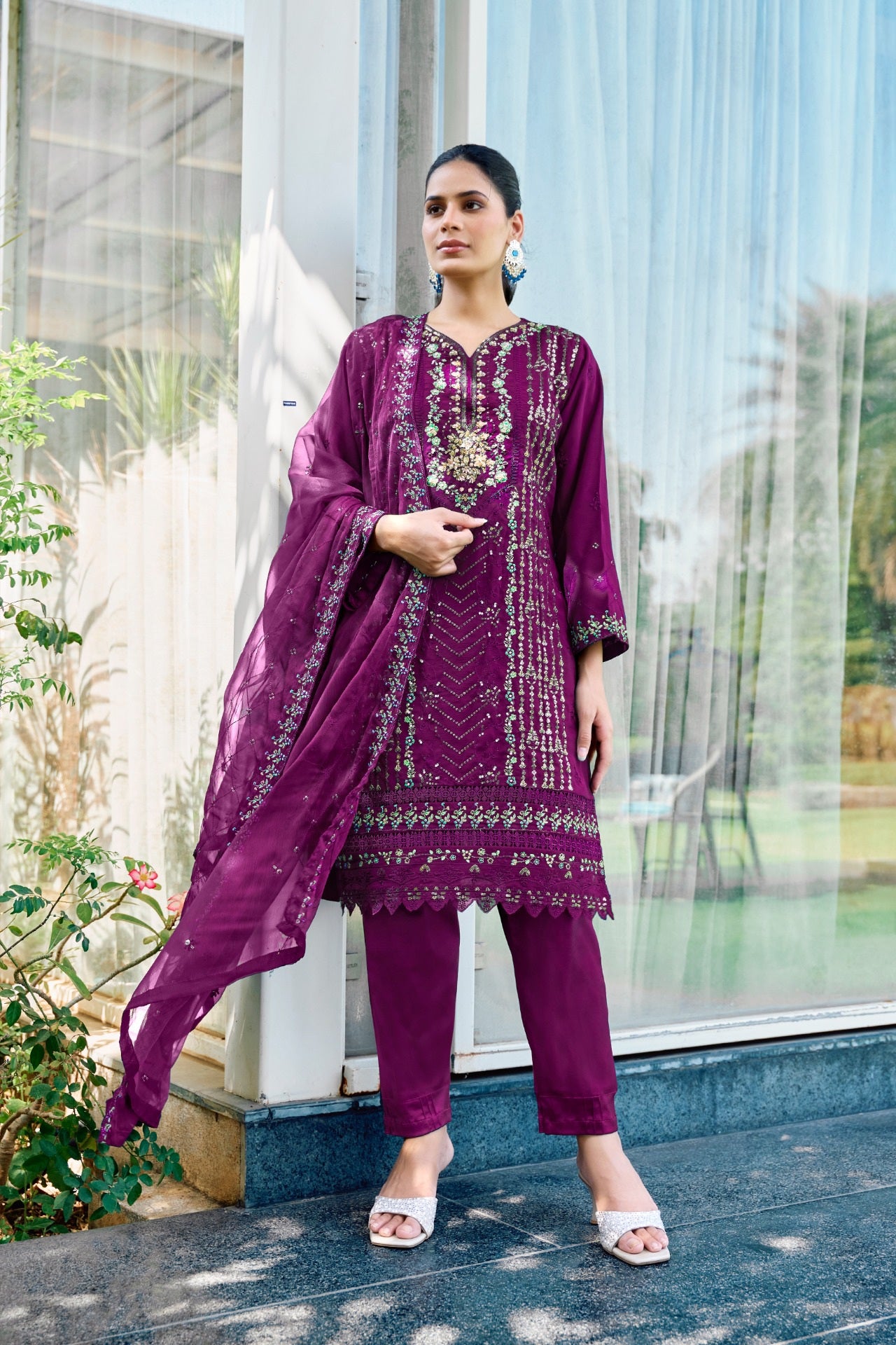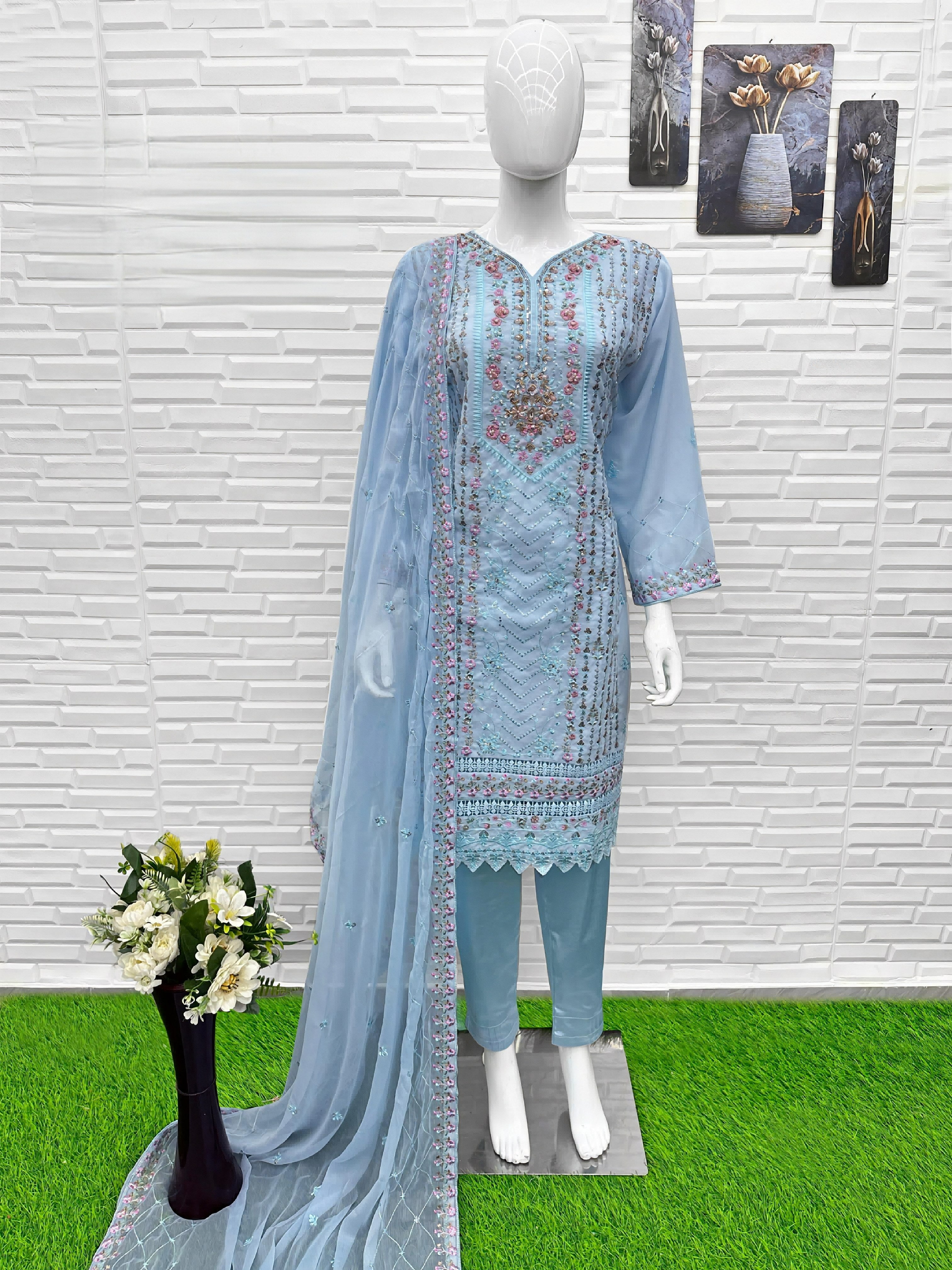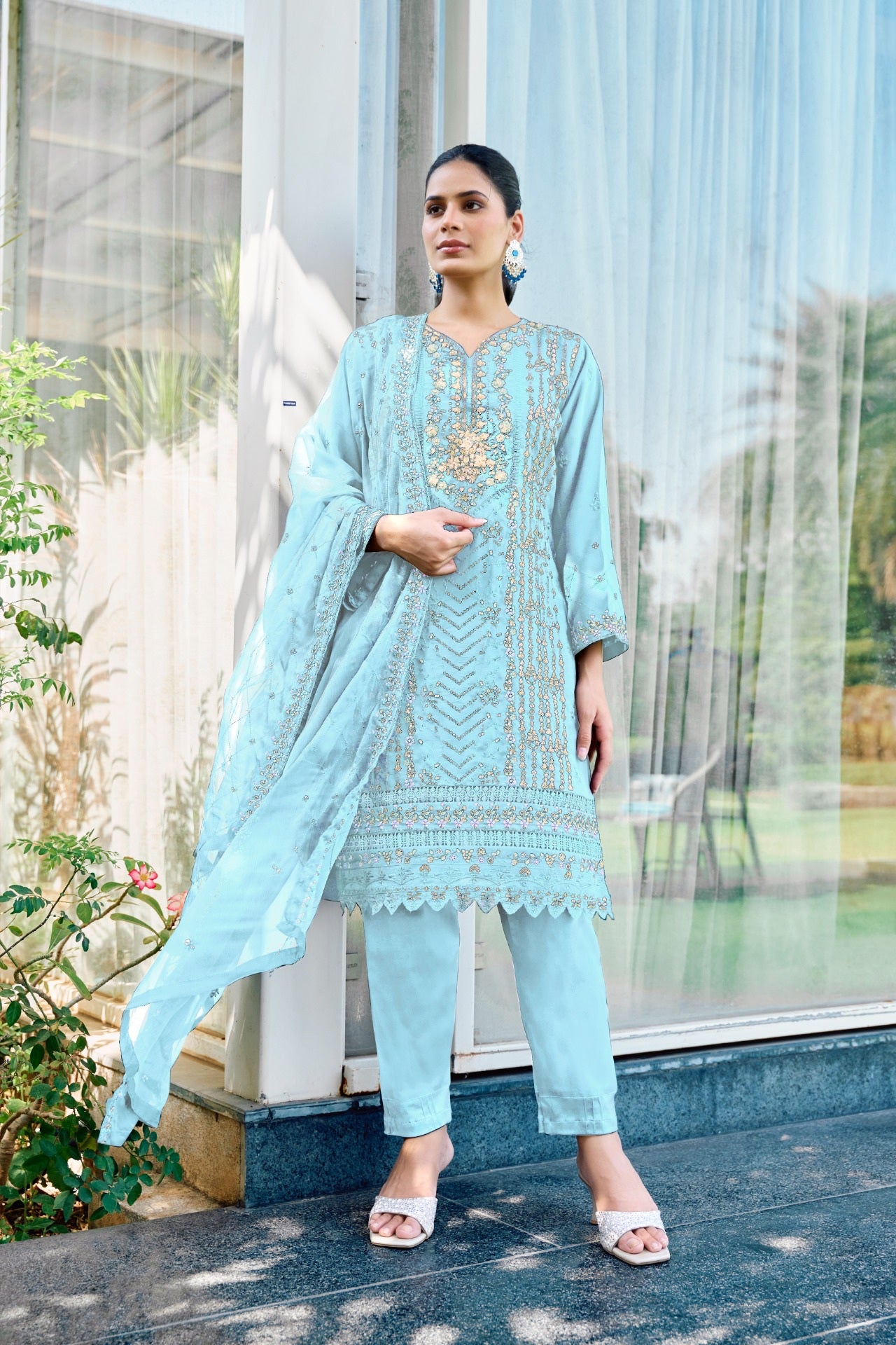 This designer tunic is beautifully embellished with embroidery, sequins work, and delicate handwork on premium chiffon fabric. The top and sleeves are highlighted with lace work and fine sequin detailing, adding a graceful sparkle. It is paired with a classic stretchable cotton pant for comfort and structure. The ensemble is completed with a chiffon dupatta featuring rich embroidery and multi-sequins work for a refined, festive look.