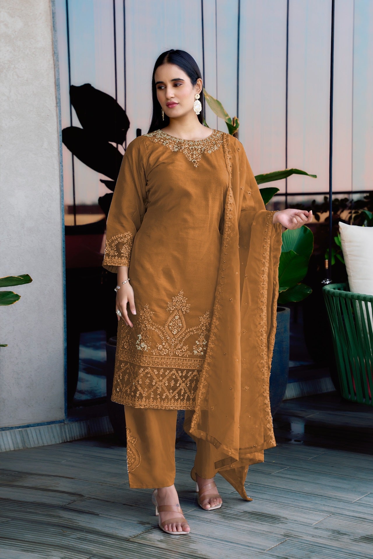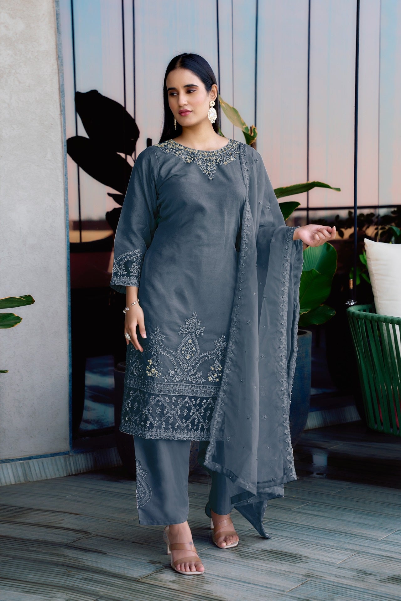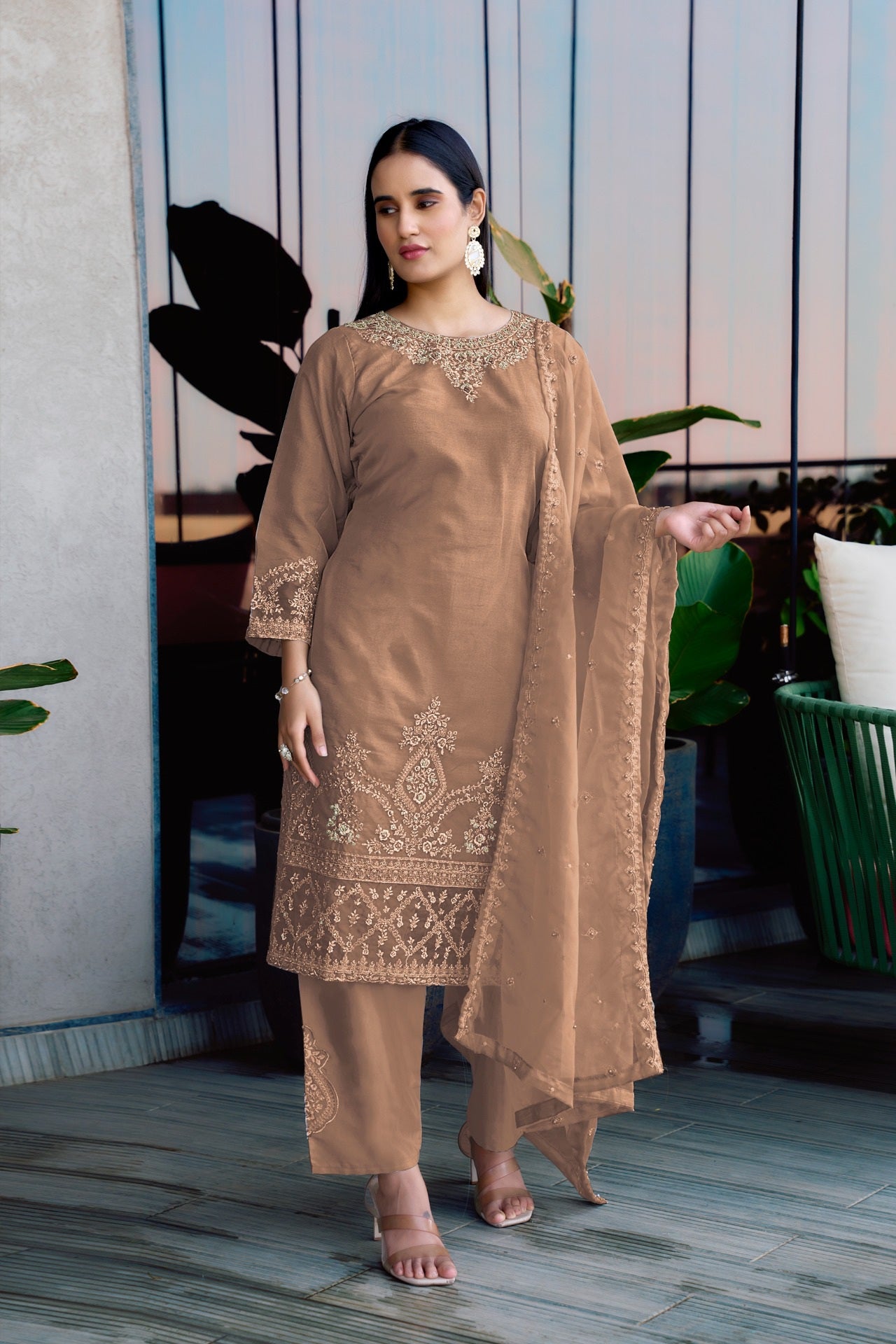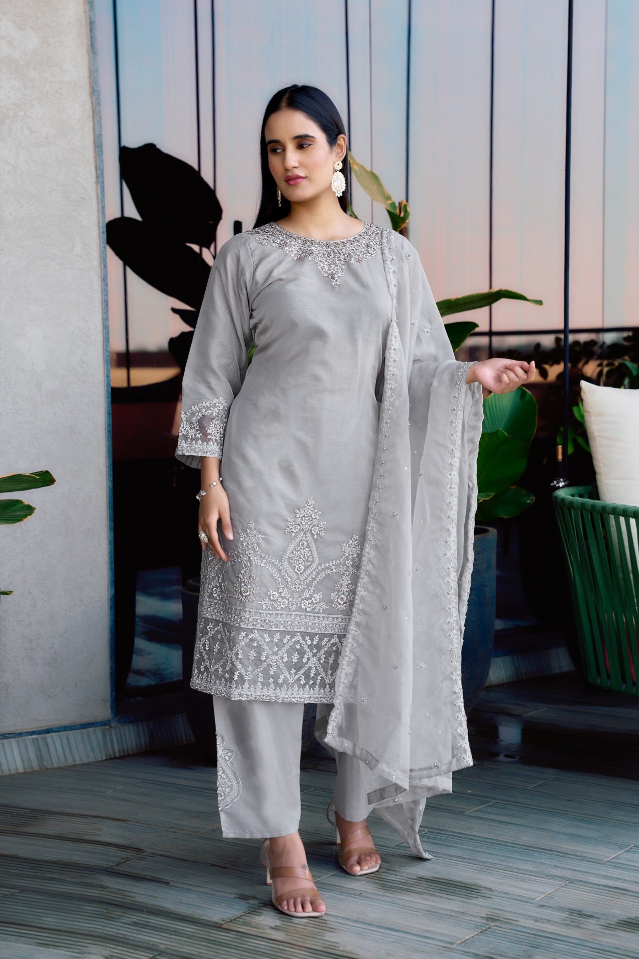 Make a refined statement with this ethereal Organza suit set โ adorned with intricate handwork, moti embellishments, and detailed patchwork, bringing elegance and richness to every celebration.
