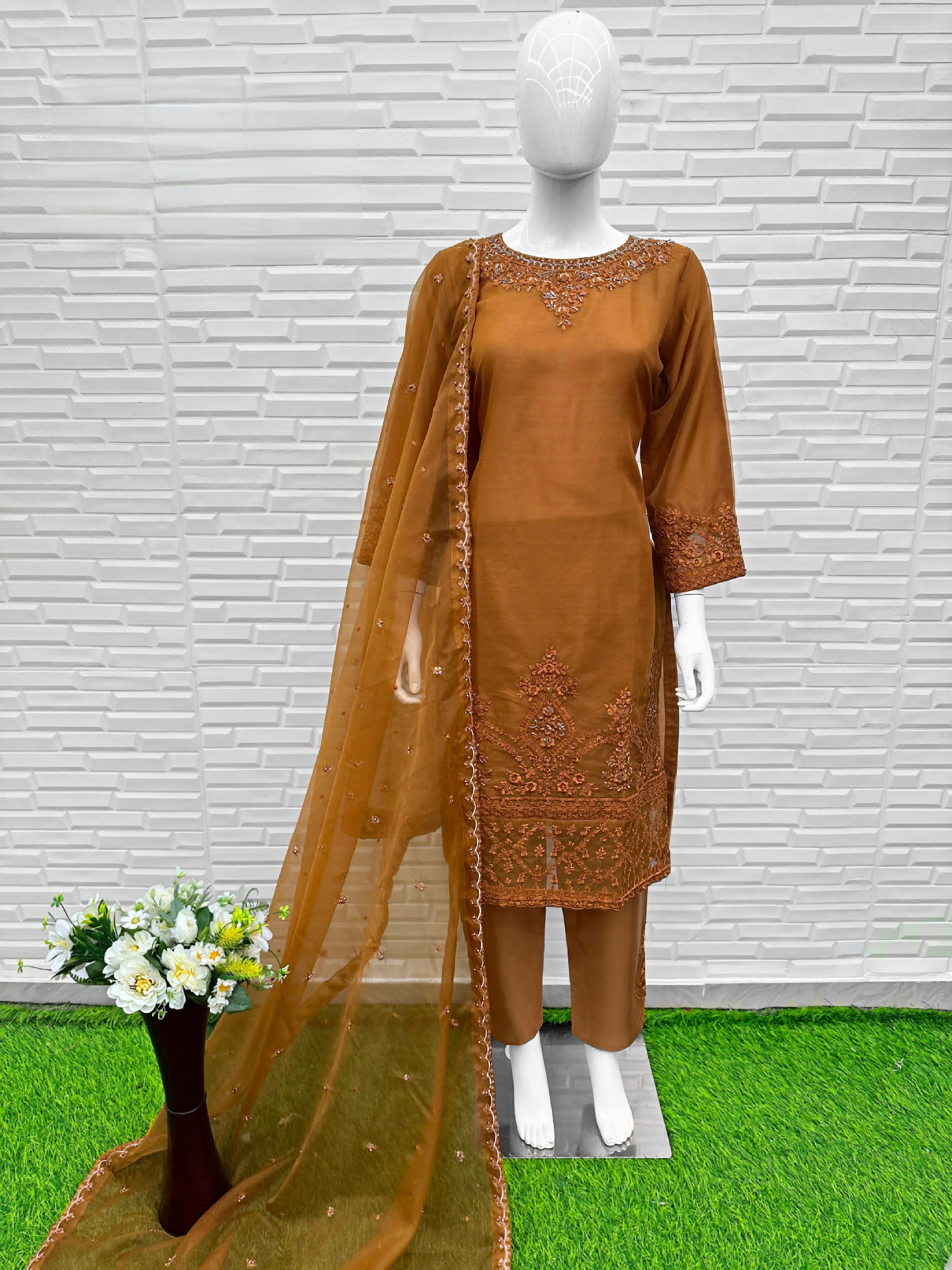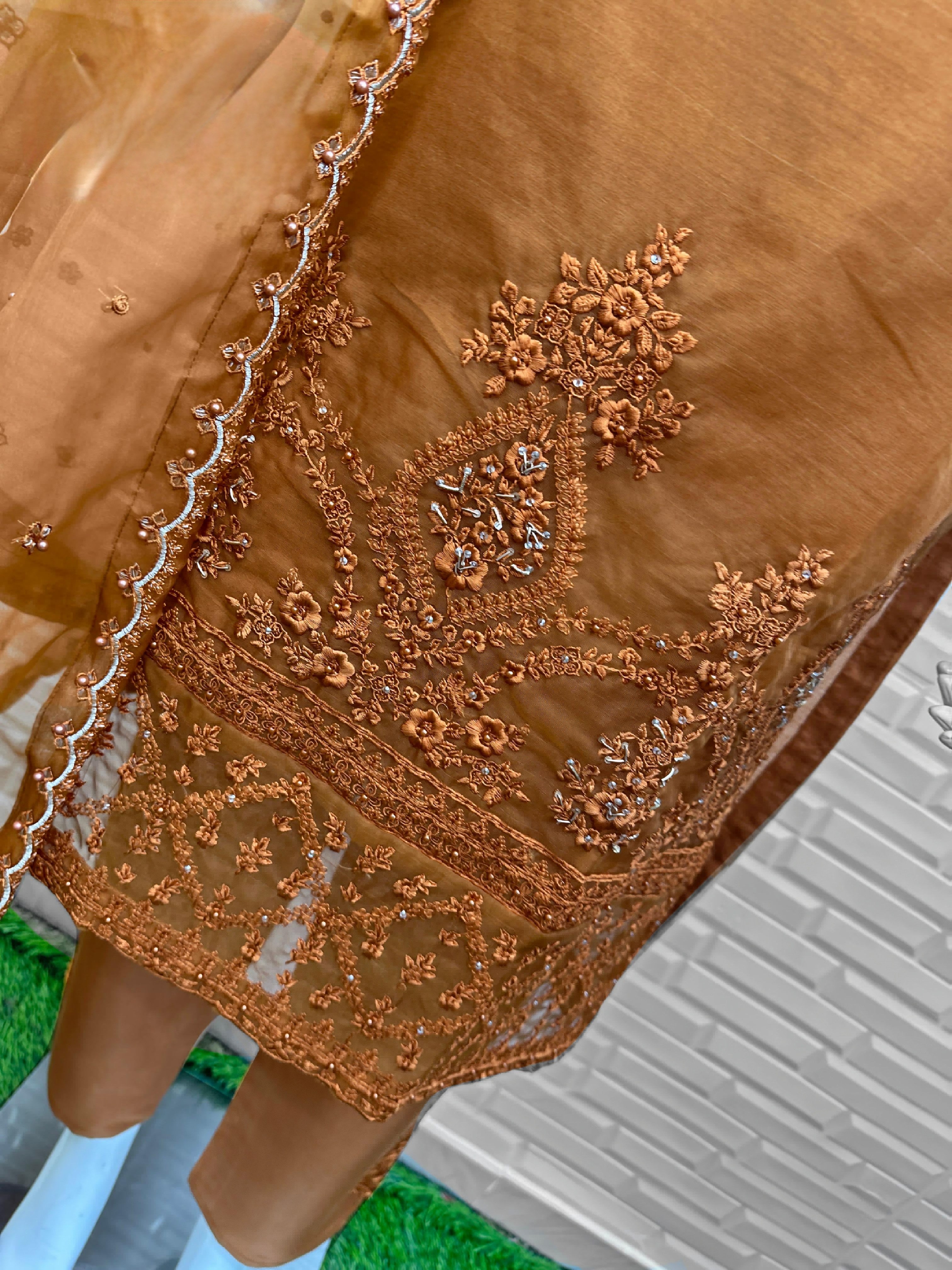 Made in matching Organza, the dupatta features fine embroidery and delicate Moti Work, adding sparkle and charm with every movement.