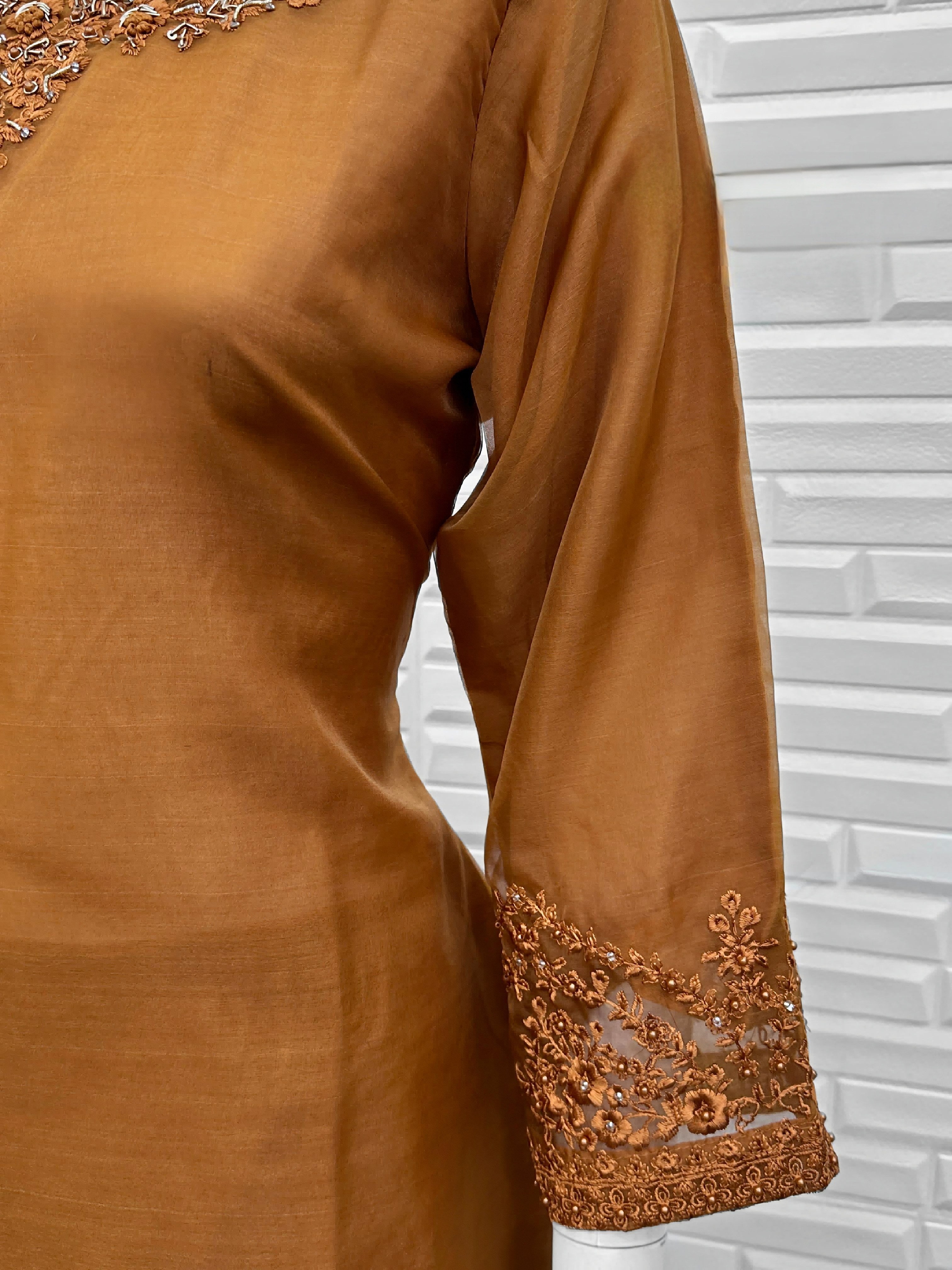 Crafted in premium Organza, the top showcases a graceful sheer texture, offering a lightweight and sophisticated silhouette for festive occasions.