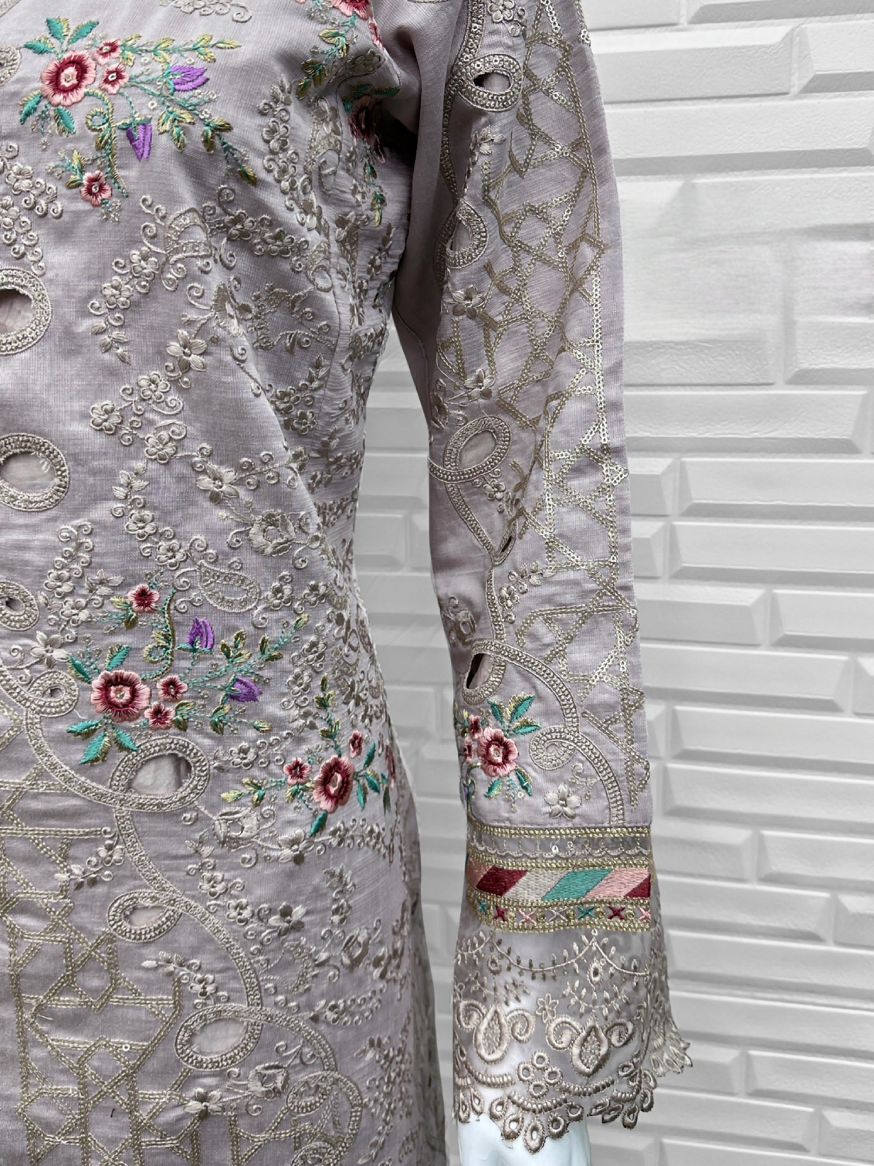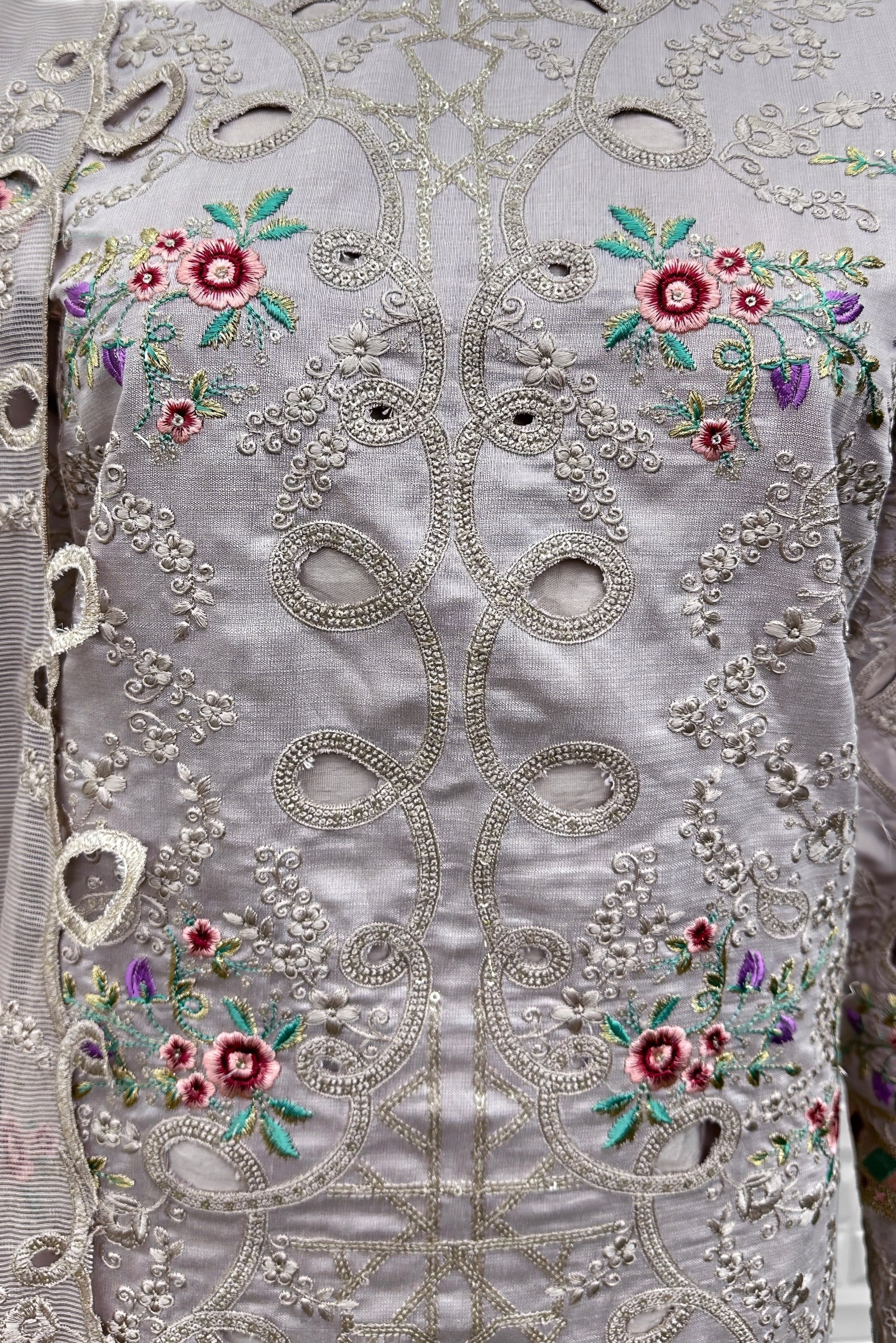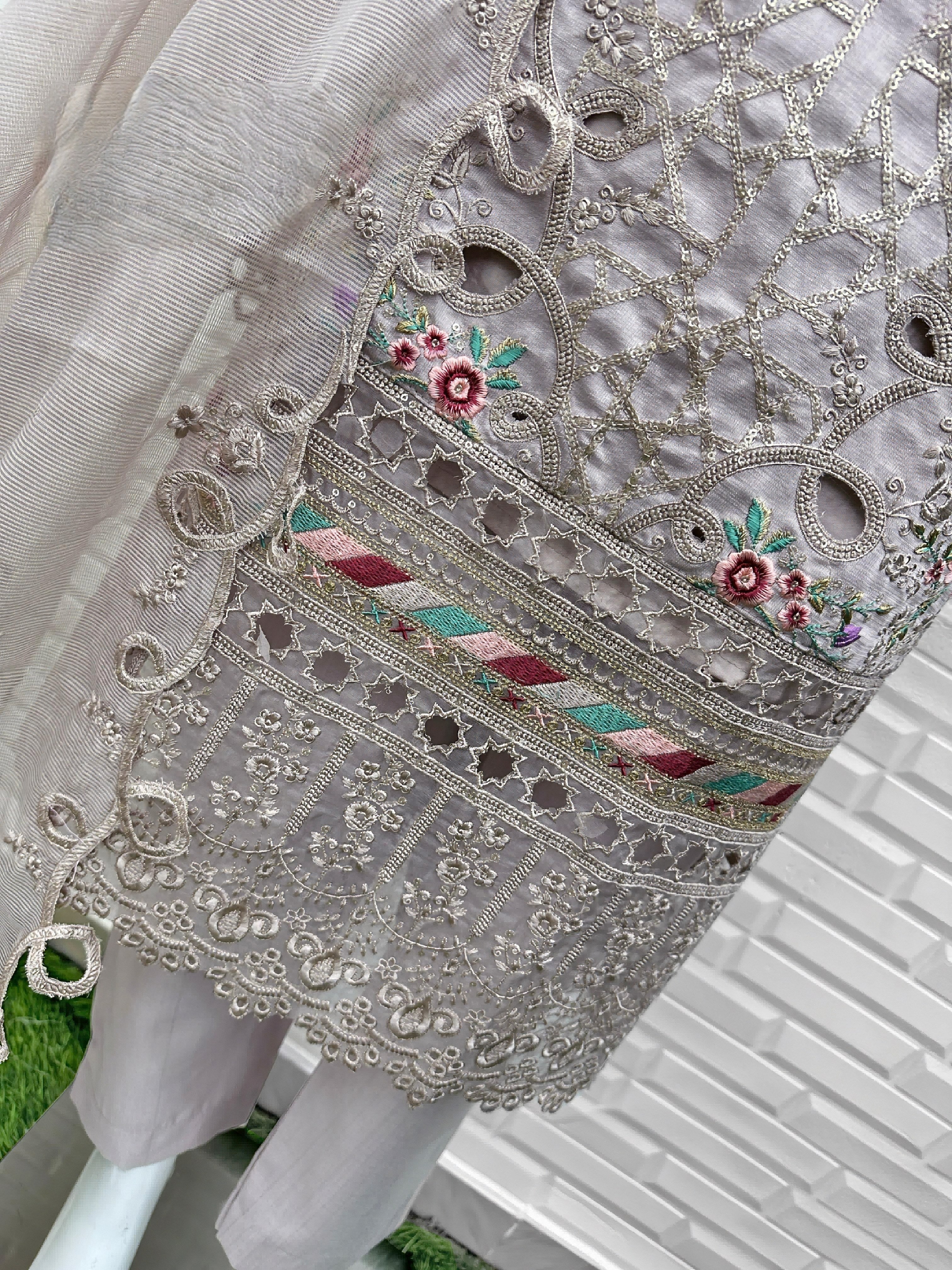 This elegant set features a Vertigan top paired with a matching Vertigan bottom. The inner lining is crafted from soft Viscos for added comfort. The highlight of the outfit is its beautifully embroidered dupatta featuring intricate laser cut work. Matching laser-cut embroidery on the sleeves adds a graceful finishing touch.