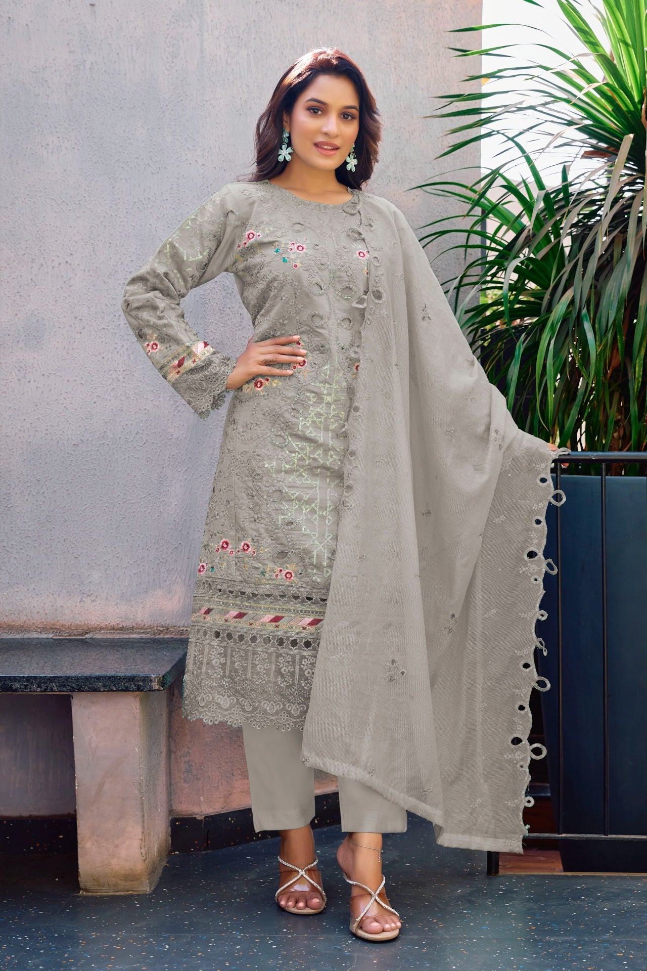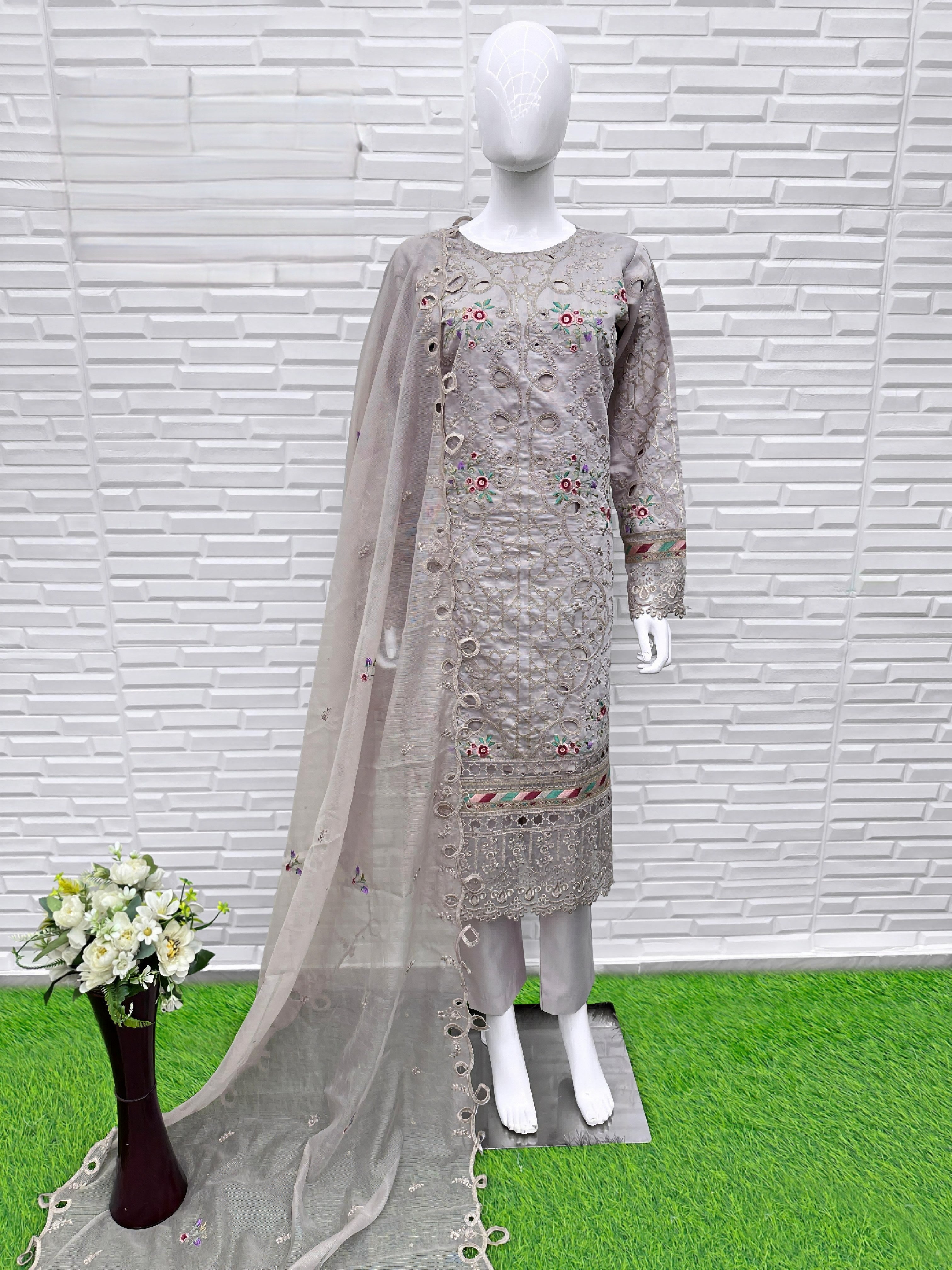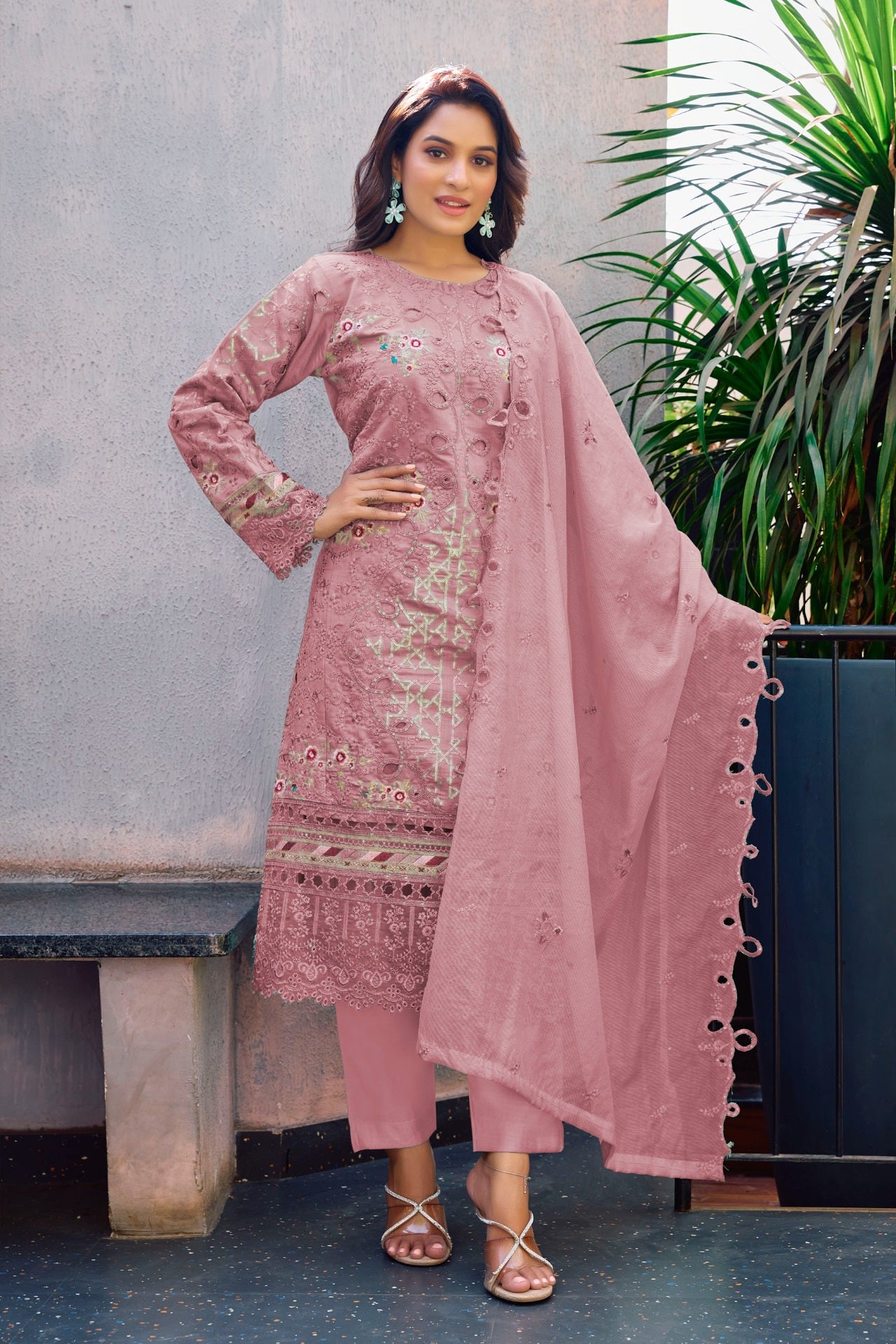 This elegant set features a Vertigan top paired with a matching Vertigan bottom. The inner lining is crafted from soft Viscos for added comfort. The highlight of the outfit is its beautifully embroidered dupatta featuring intricate laser cut work. Matching laser-cut embroidery on the sleeves adds a graceful finishing touch.