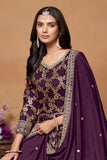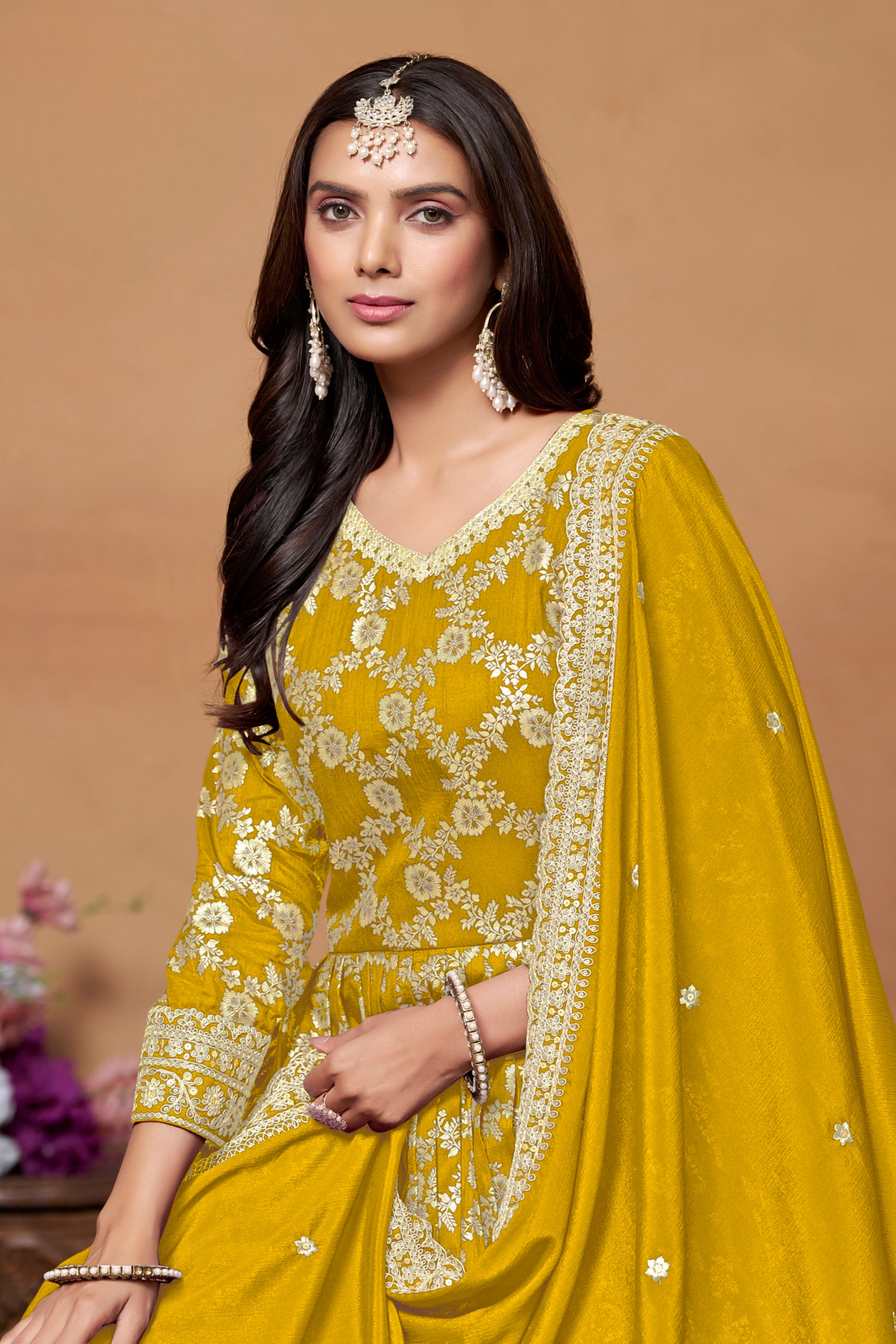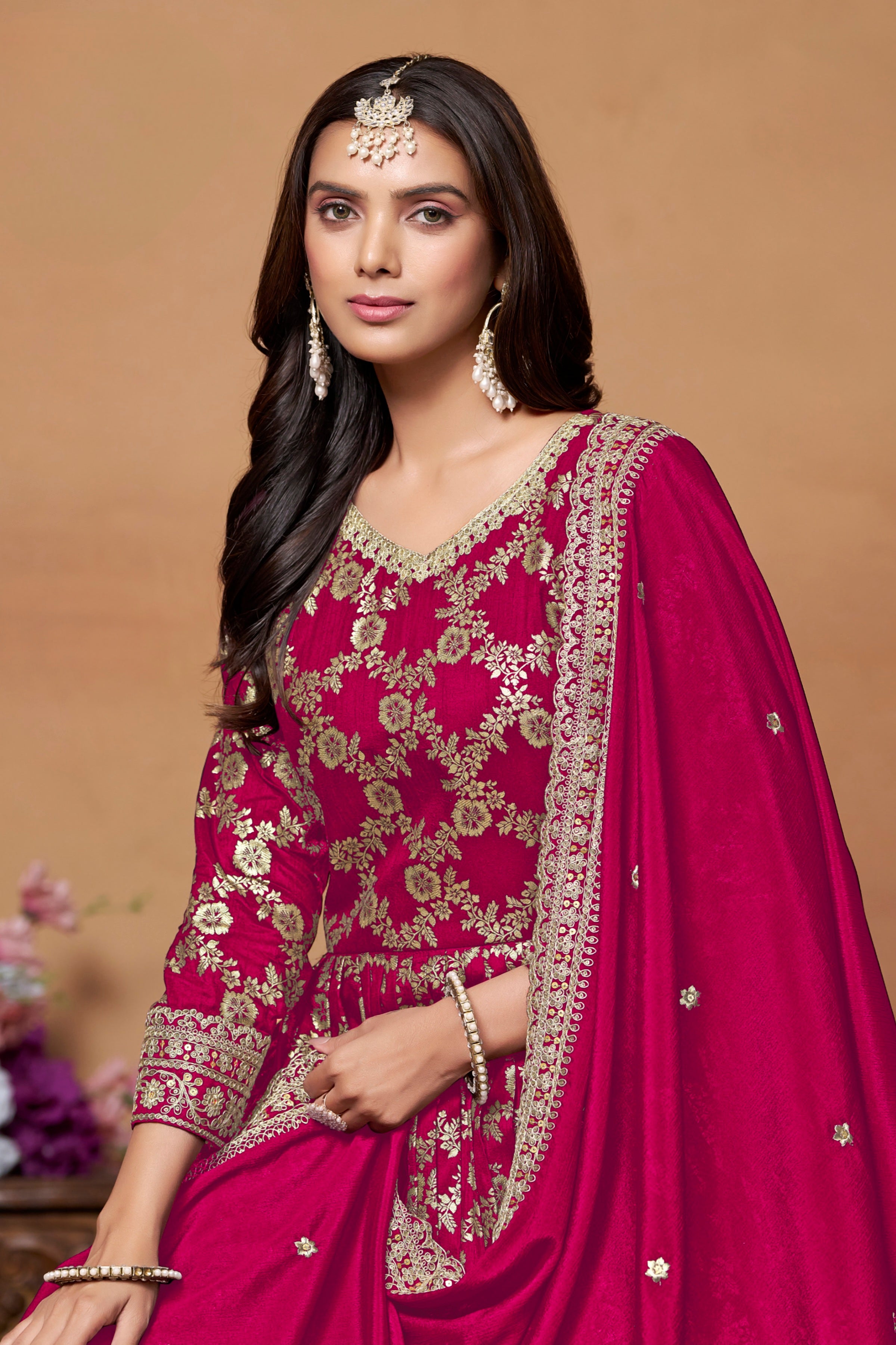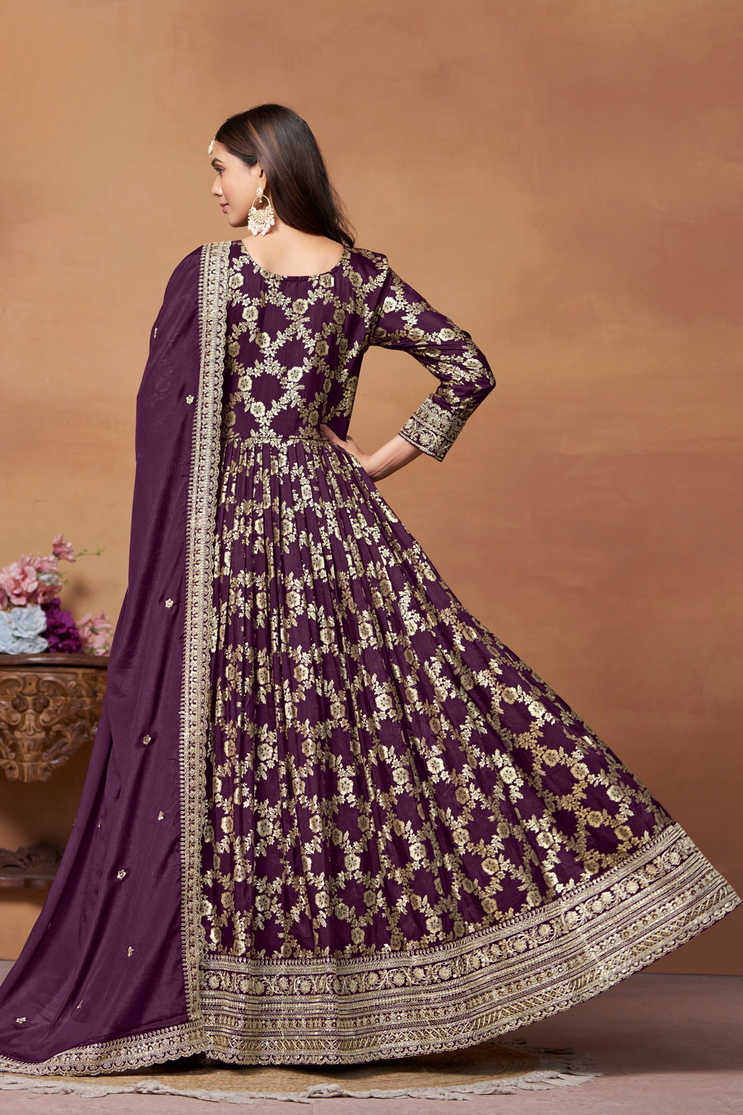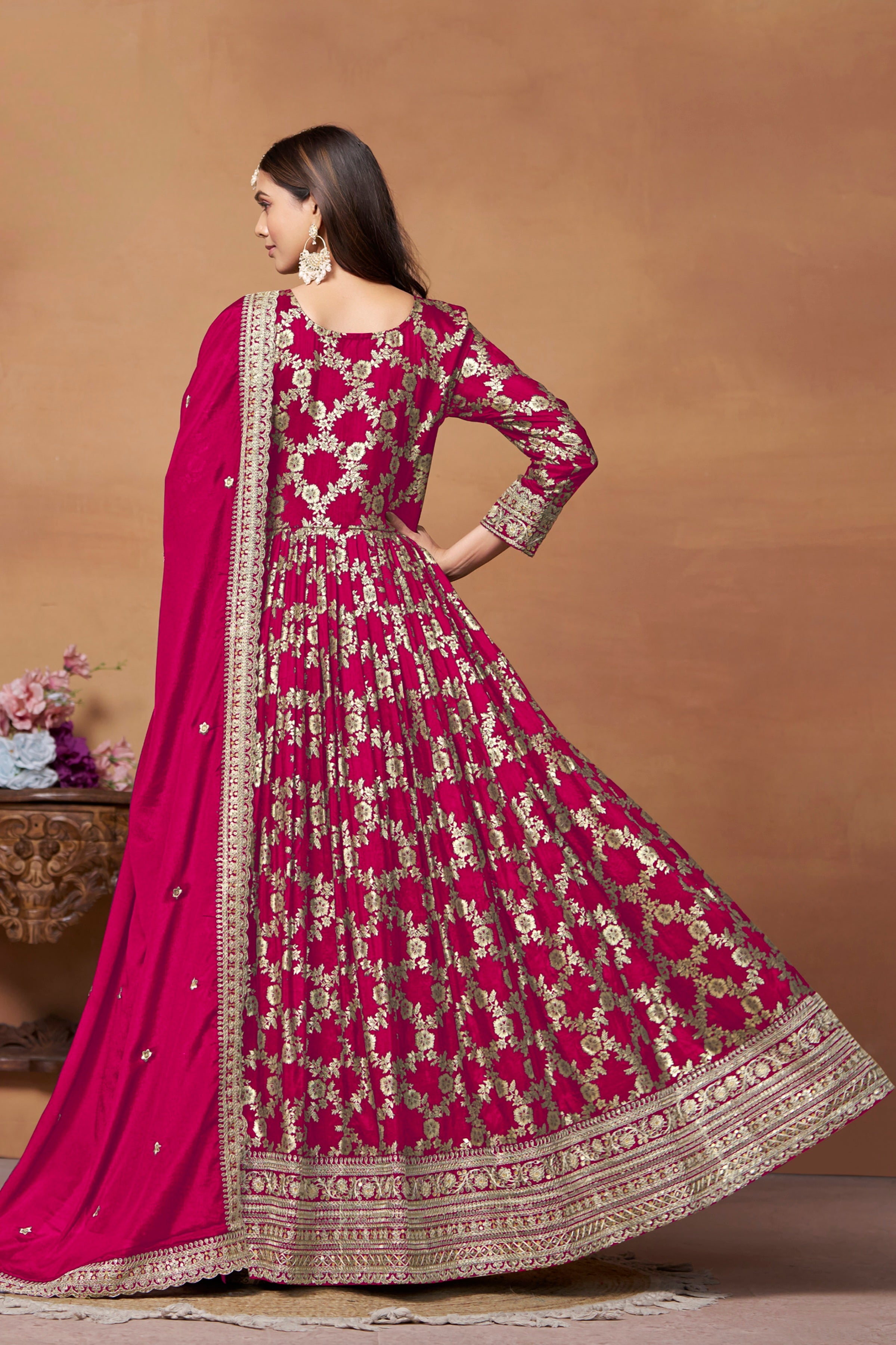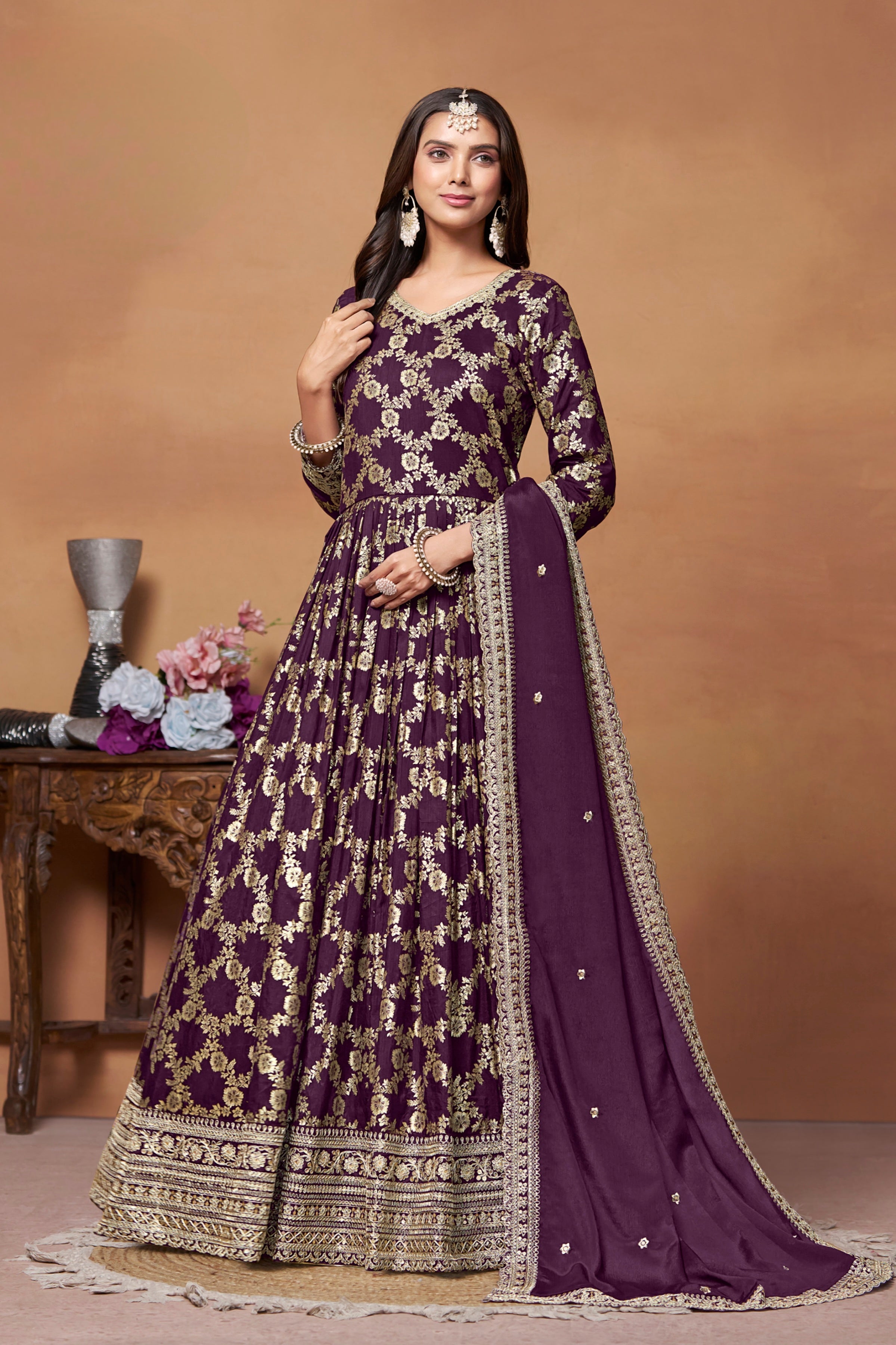 A richly textured designer gown in Dola Jacquard, elegantly paired with a Chinon dupatta and crafted to bring timeless charm to festive and formal occasions.