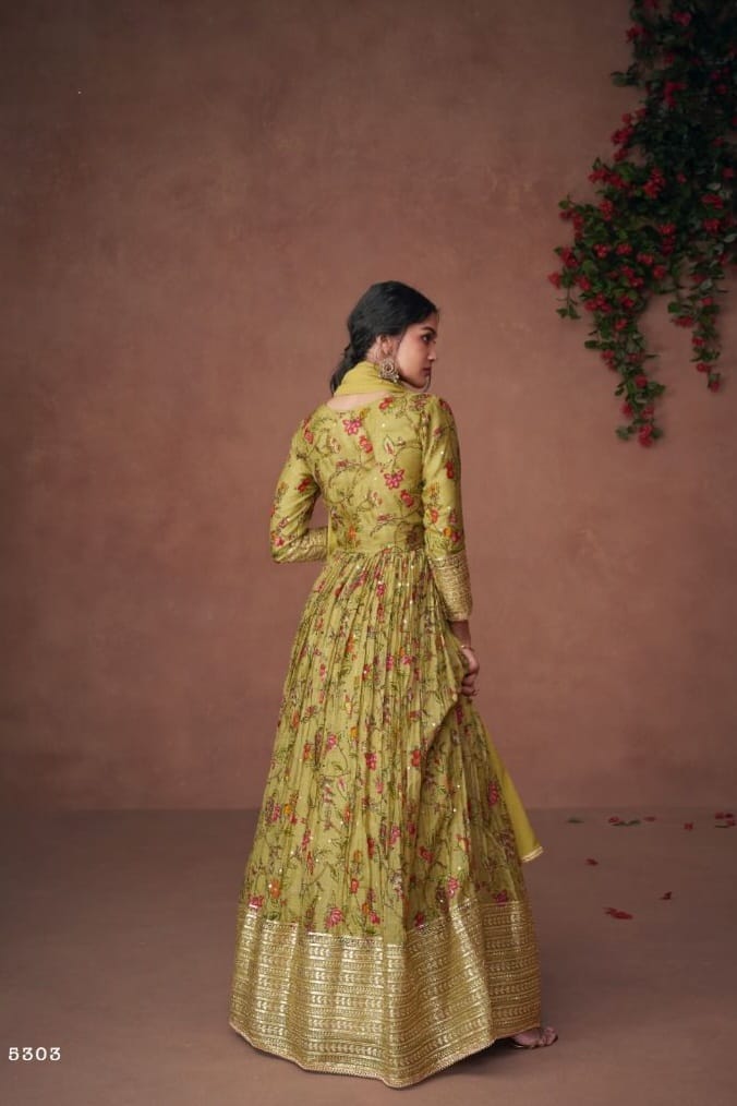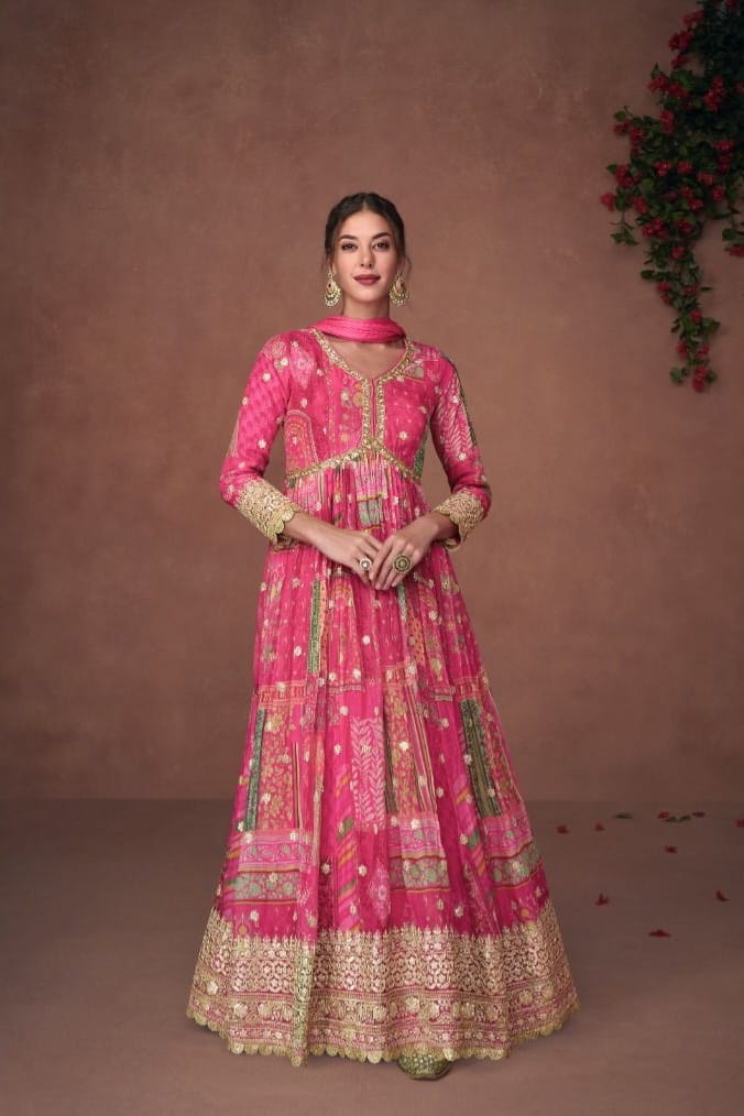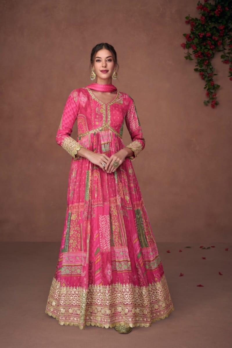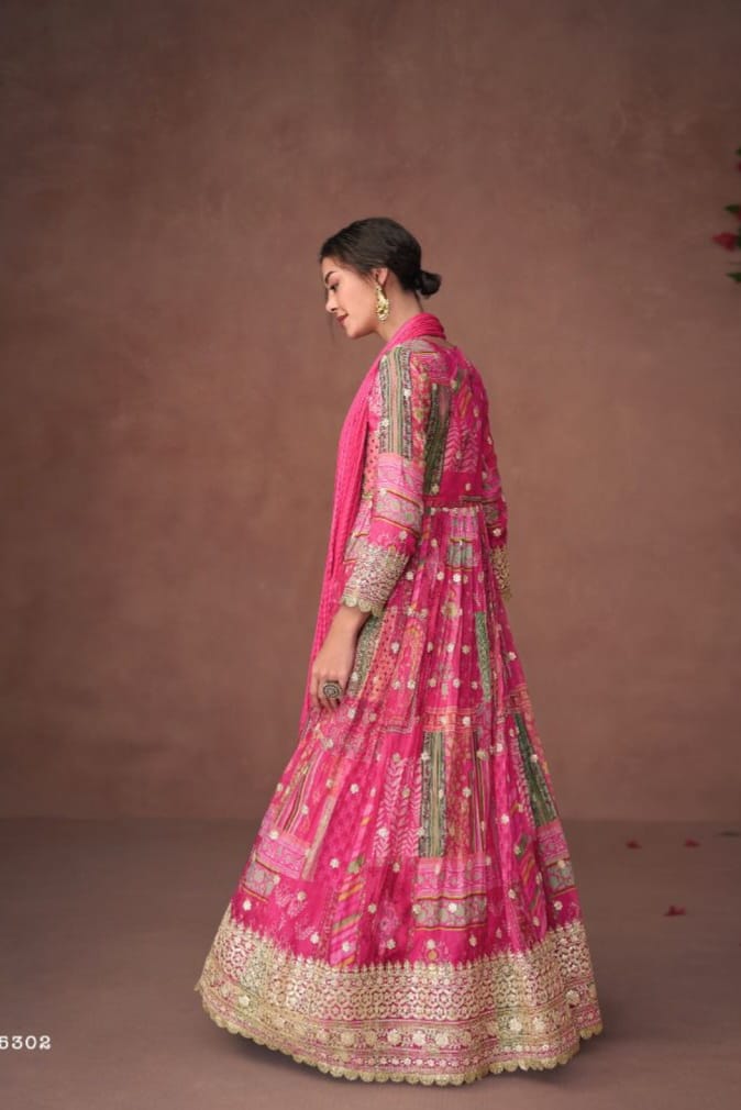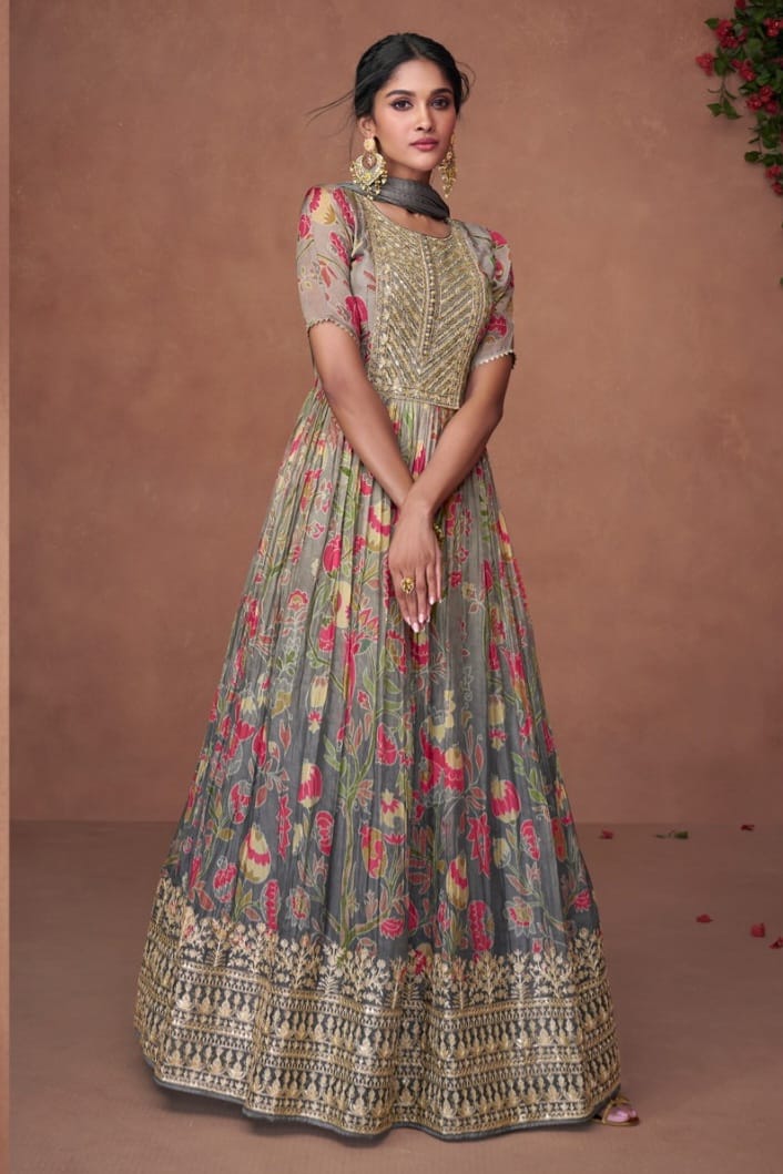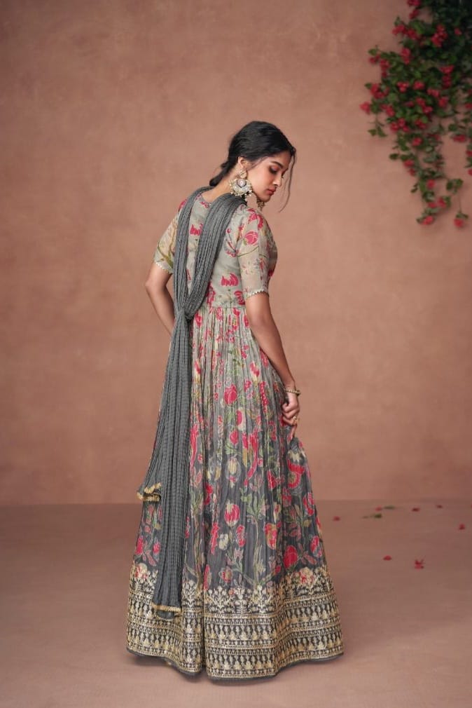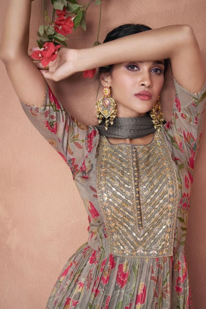 Crafted in Premium Organza Print Silk, the top is adorned with subtle Embroidery Work, blending artistic charm with a modern, airy silhouette.