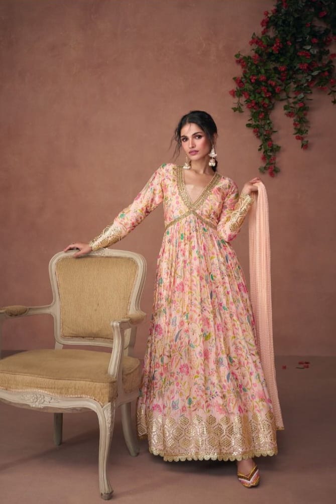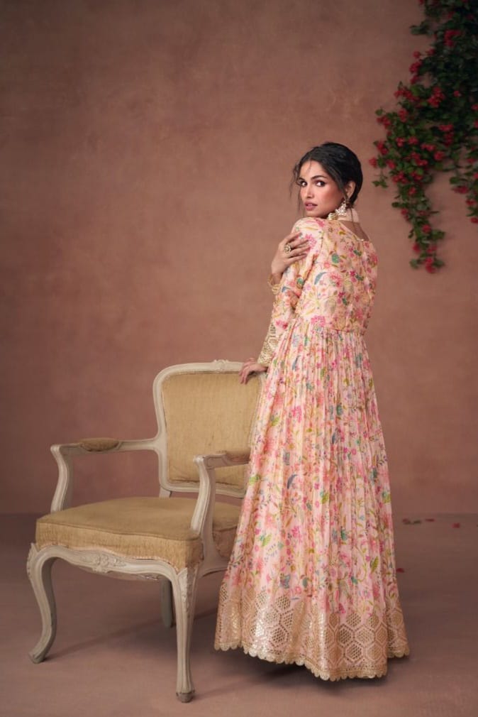 Matching Organza Print Silk sleeves feature coordinated Embroidery Work, completing the ensemble with soft elegance.