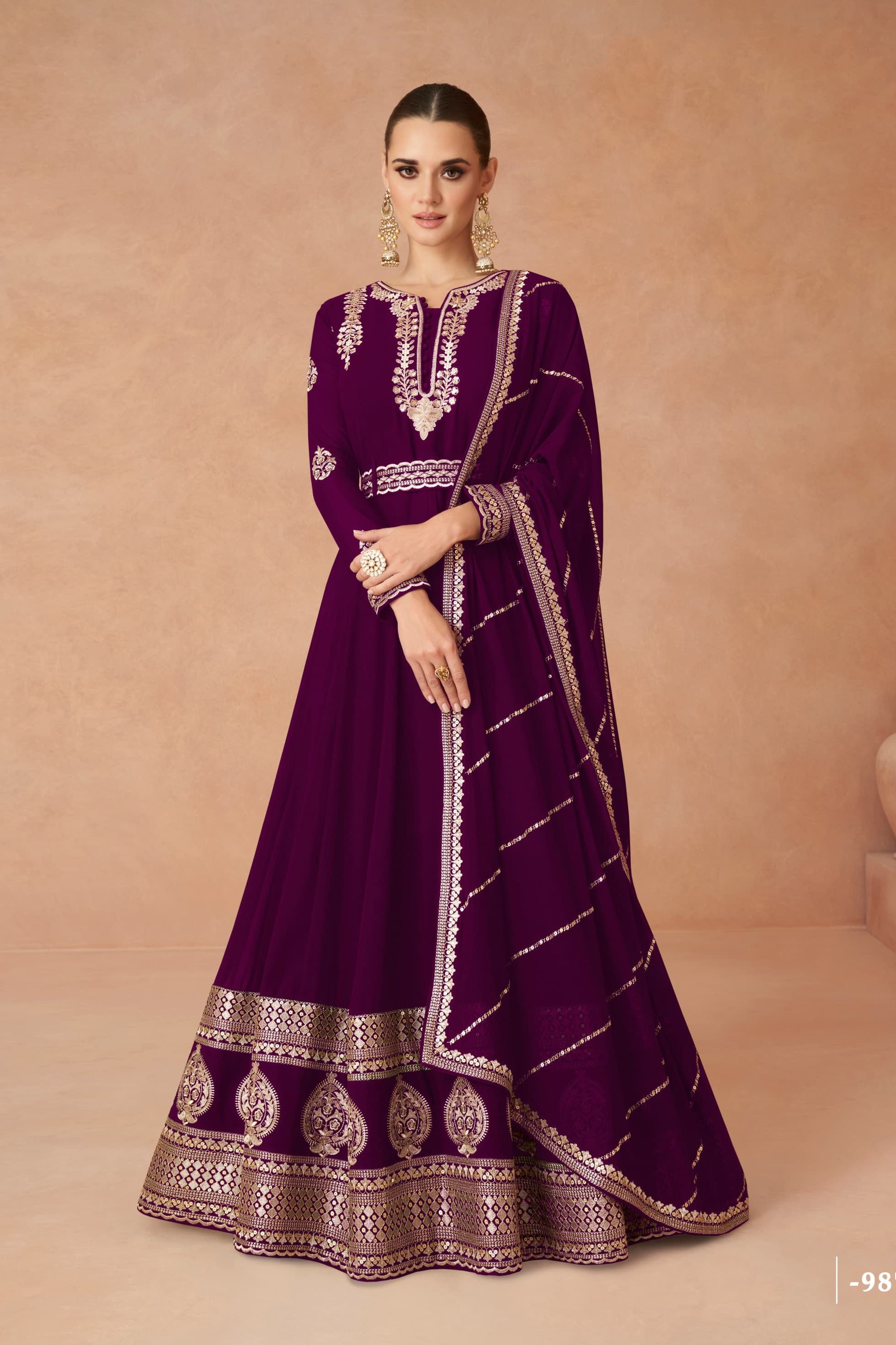 Tailored from rich Faux Georgette, this fully stitched gown features elegant embroidery work and offers a graceful flow with a flattering drape.