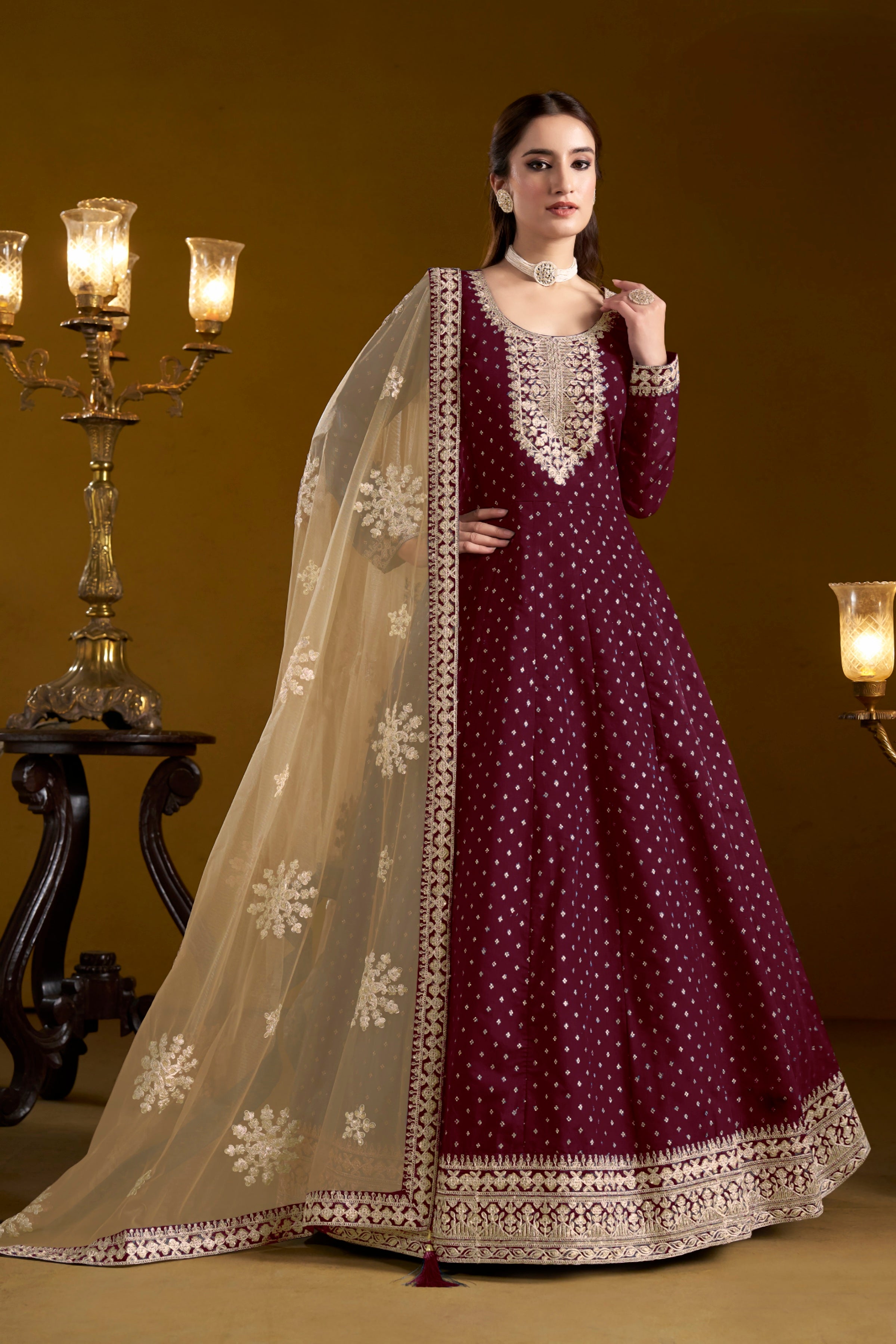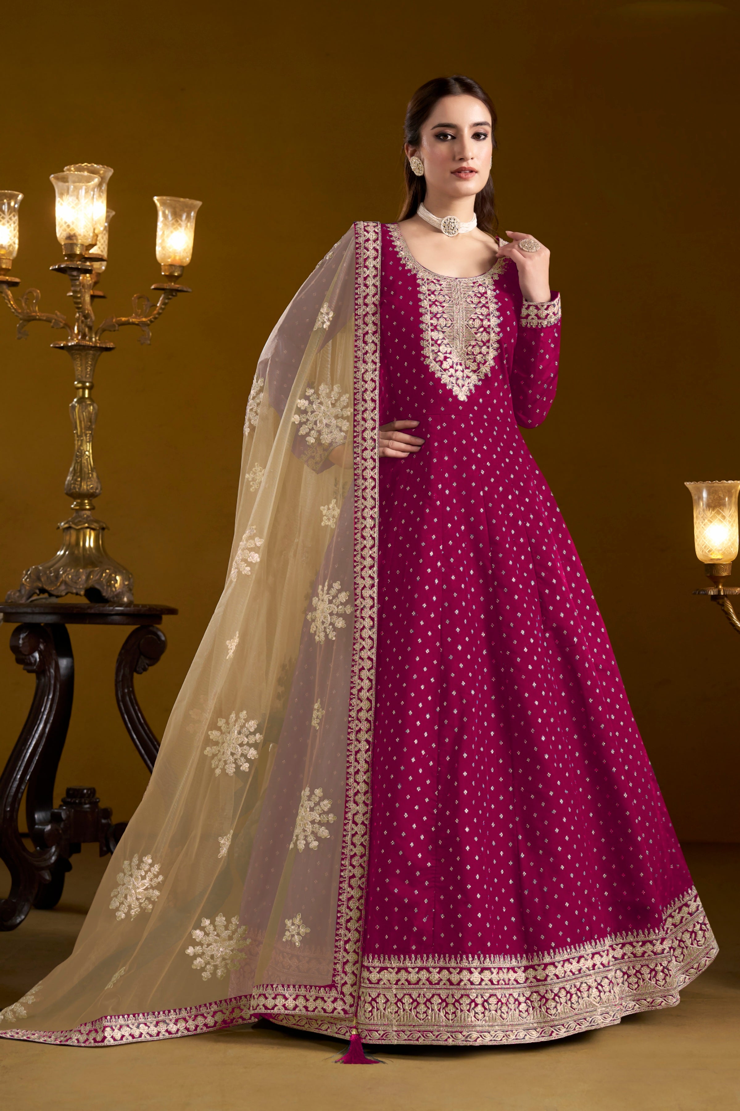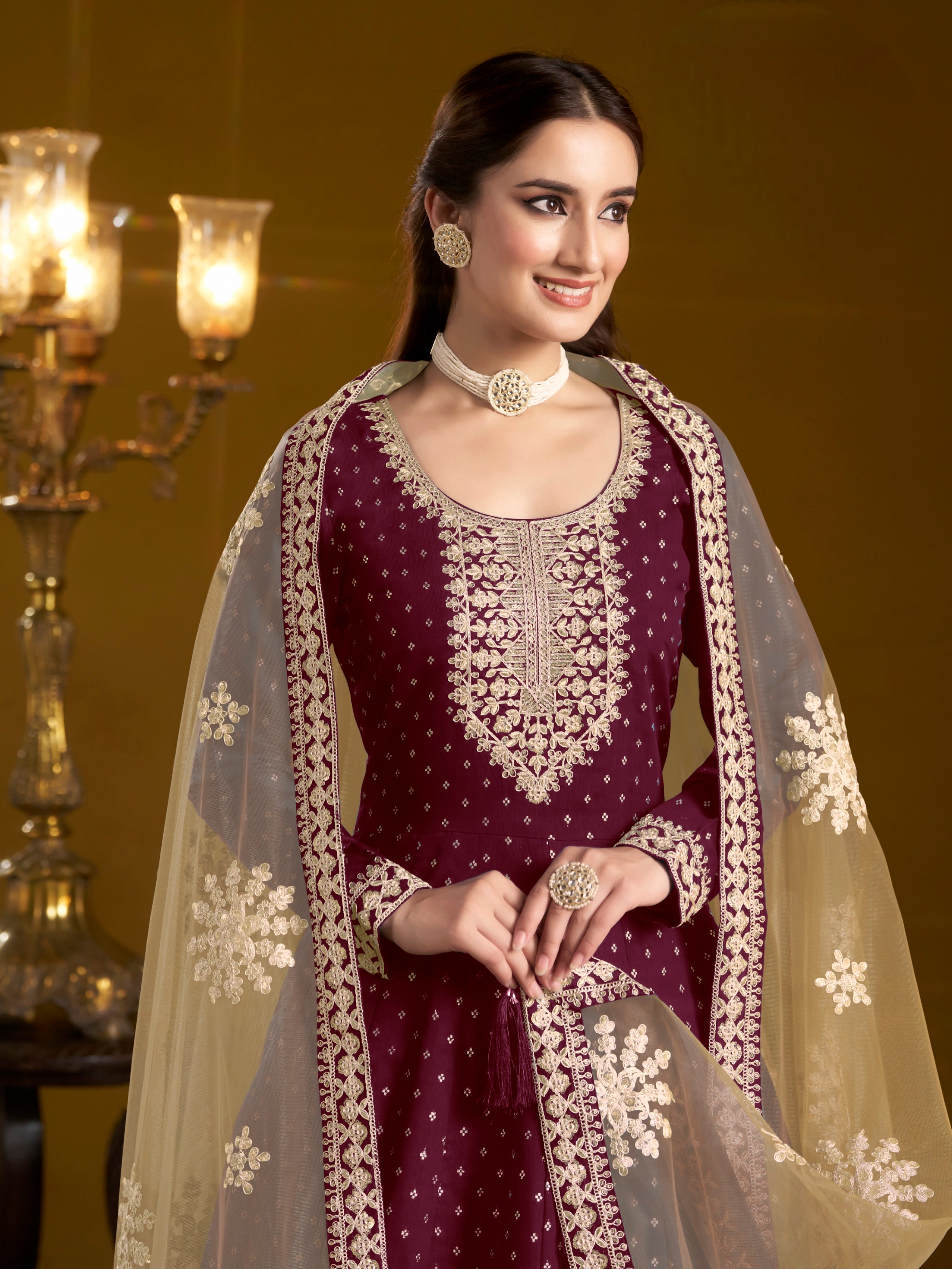 A graceful fusion of tradition and elegance—this suit set features embroidered Chanderi Butti and a dreamy net dupatta for a refined ethnic look.