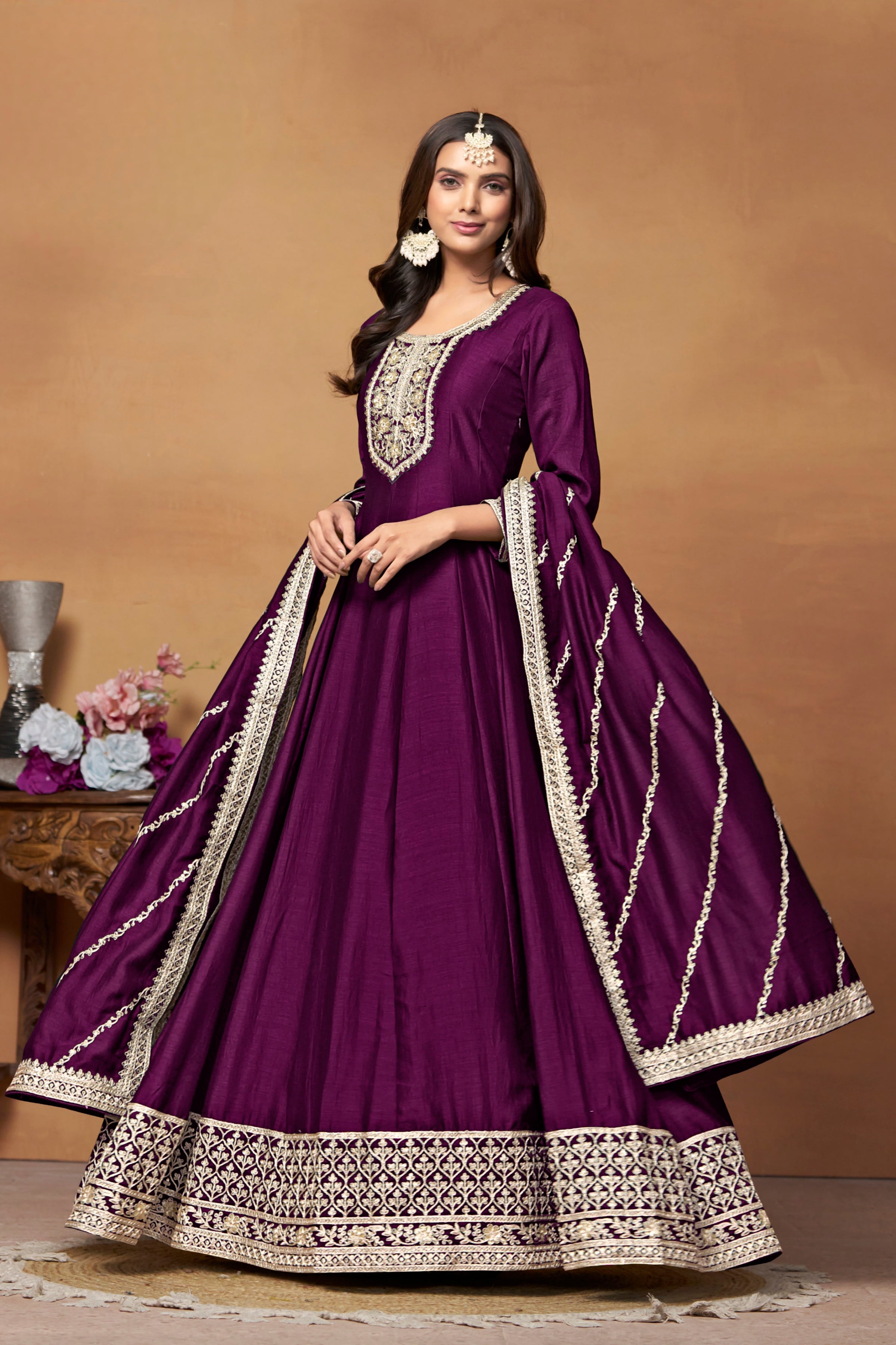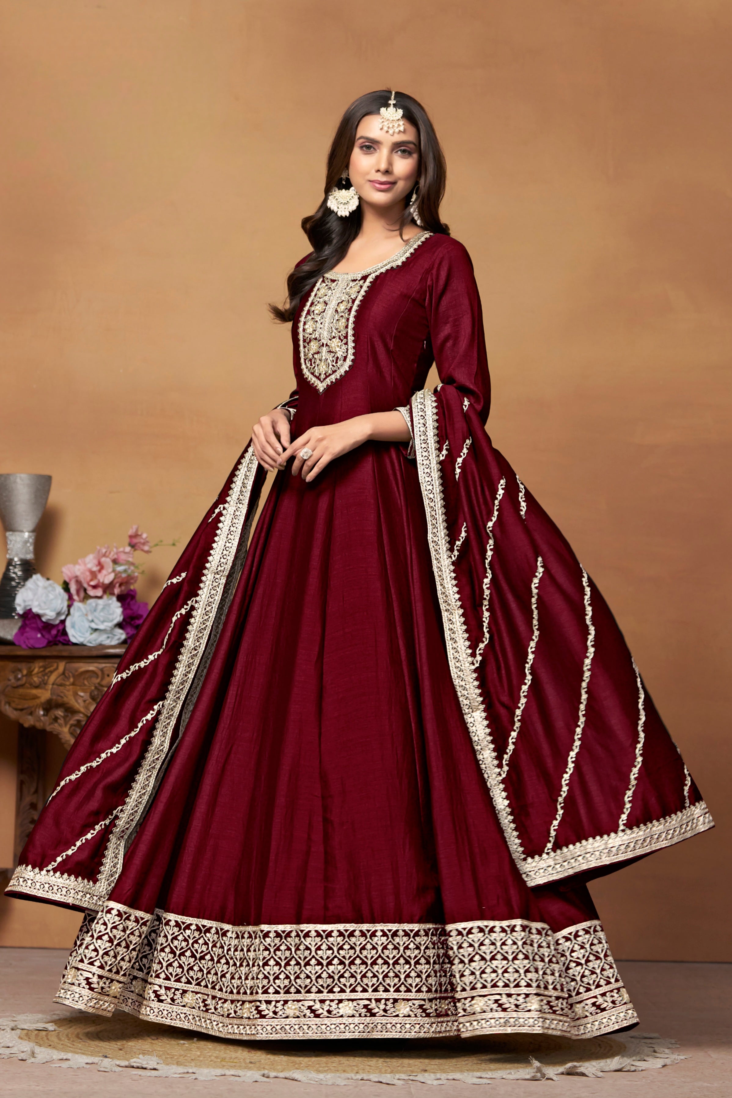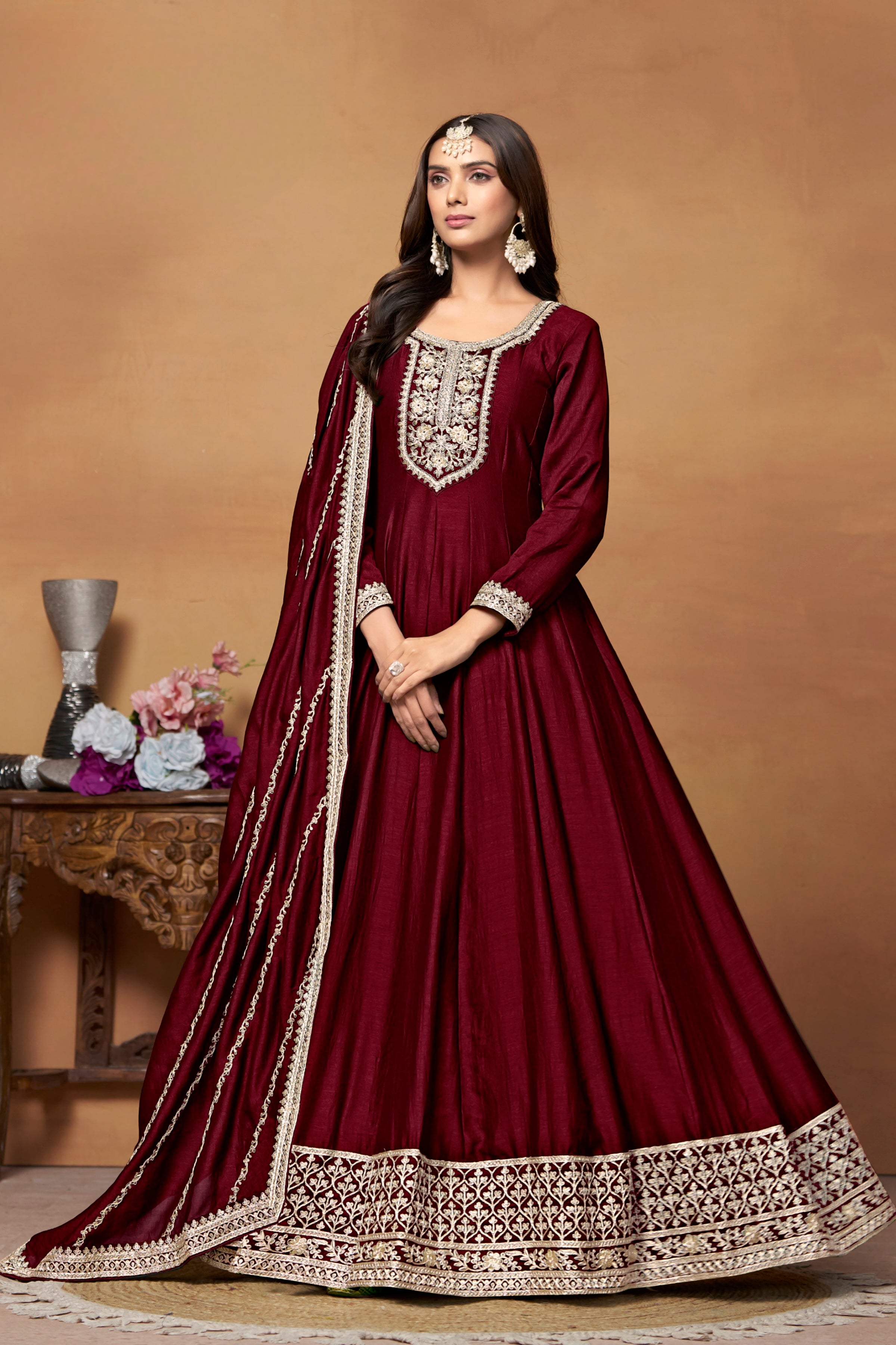 A regal gown set crafted in rich Art Silk with intricate embroidery—perfect for festive celebrations and elegant evenings.