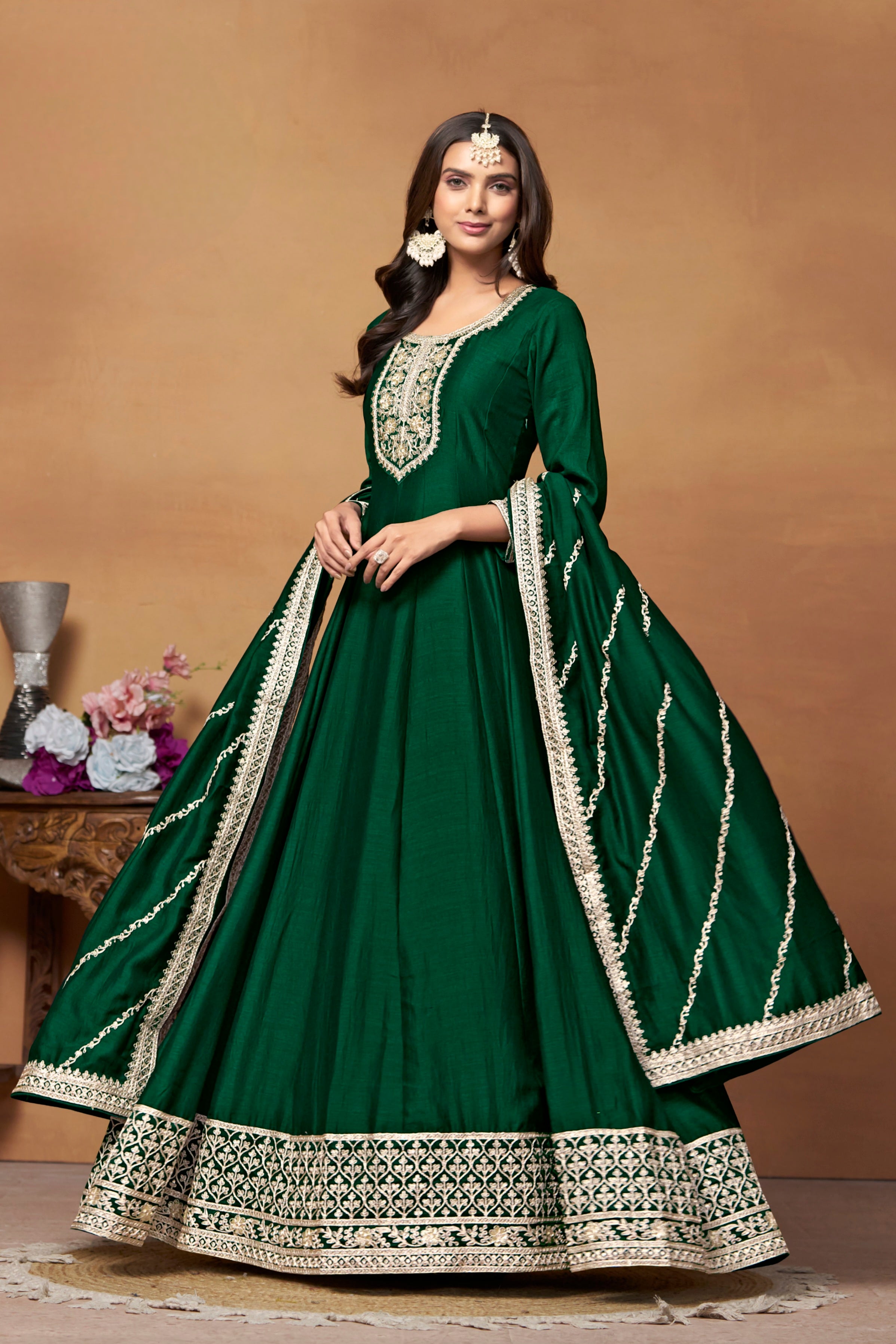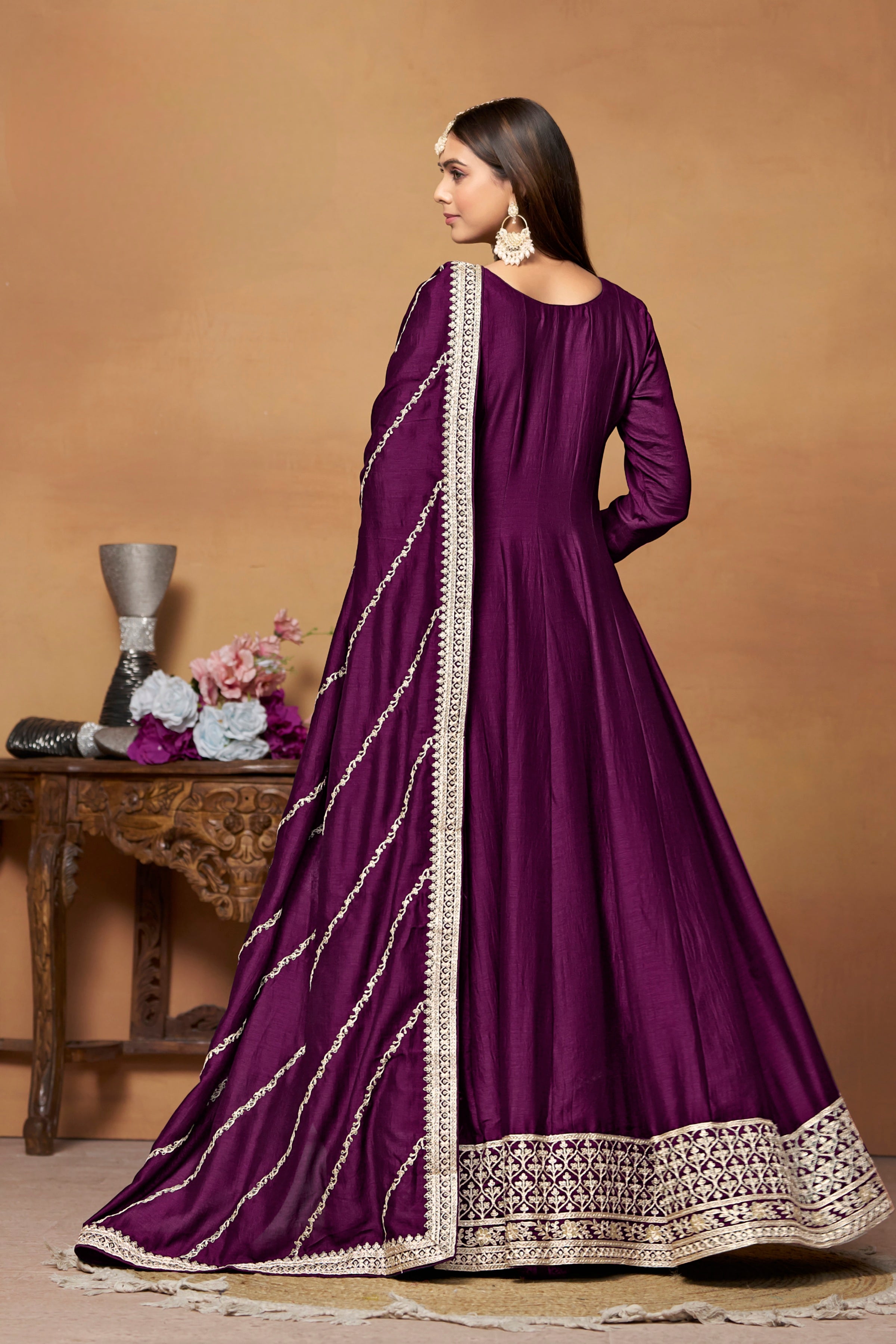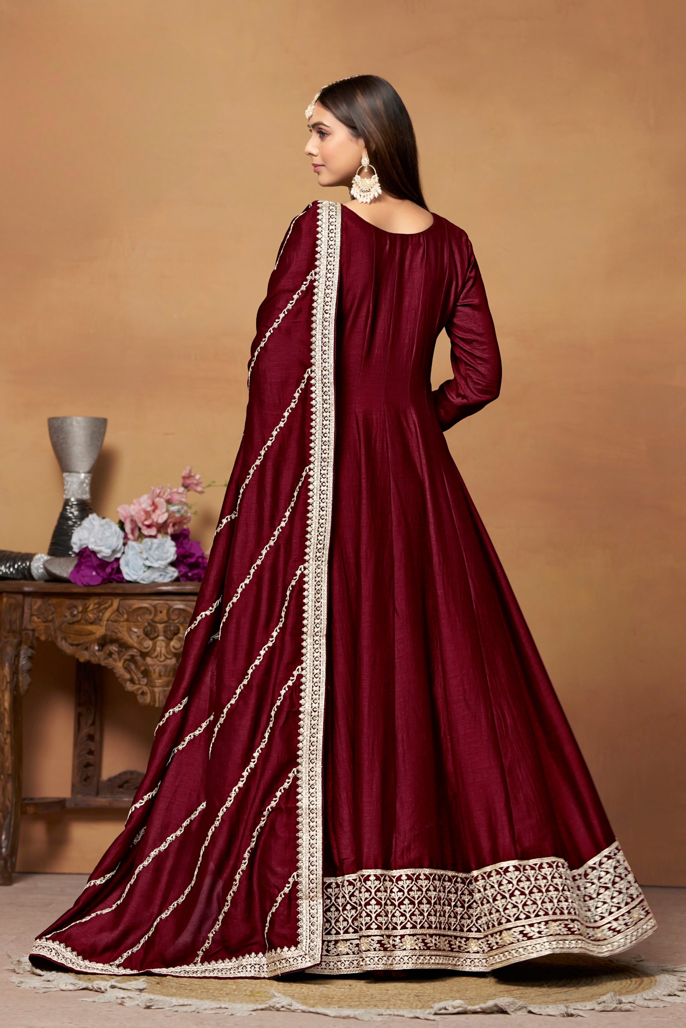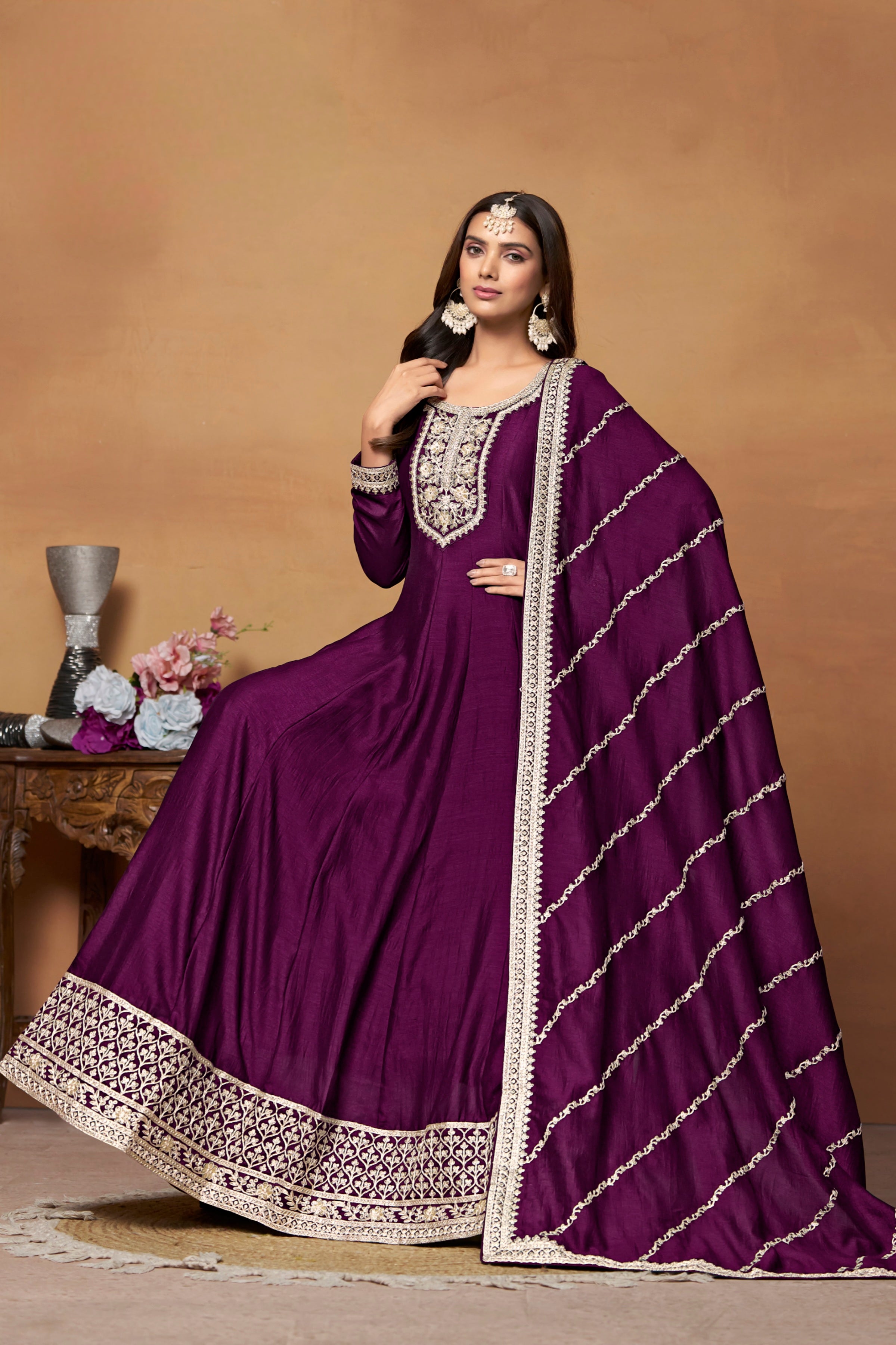 A regal gown set crafted in rich Art Silk with intricate embroidery—perfect for festive celebrations and elegant evenings.