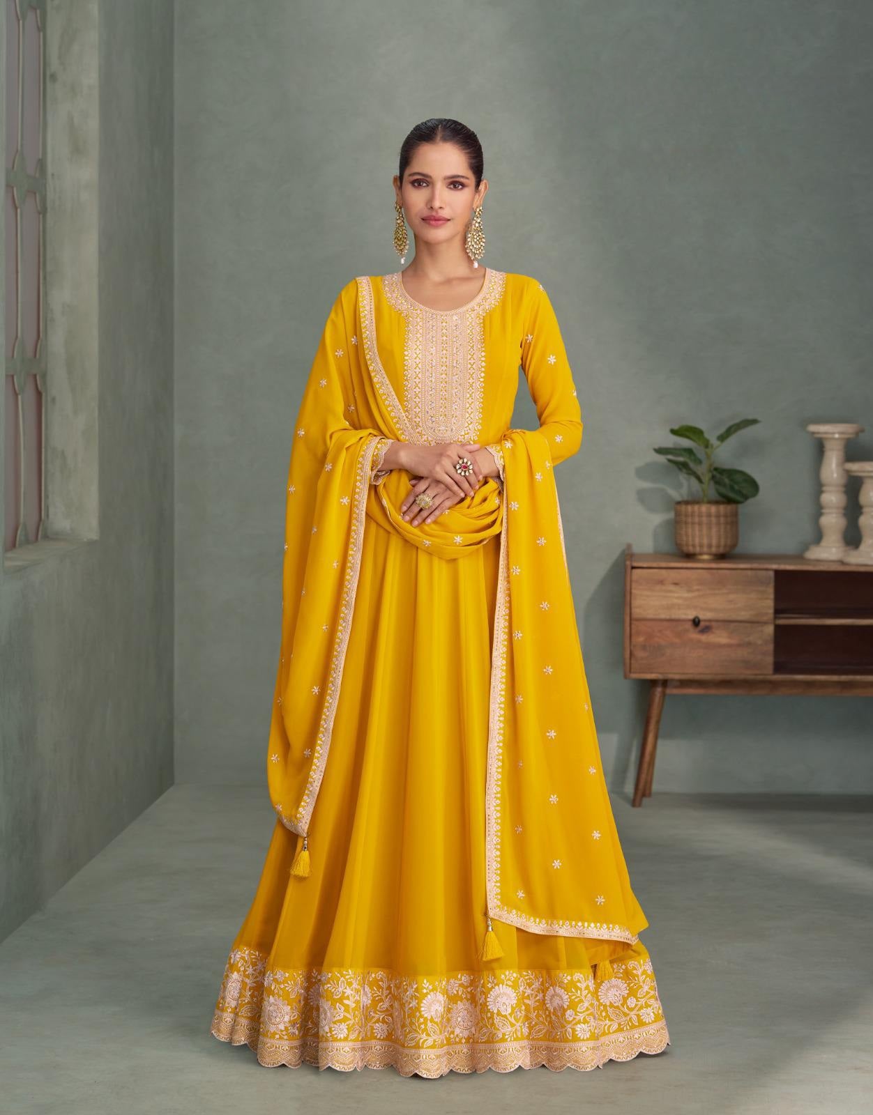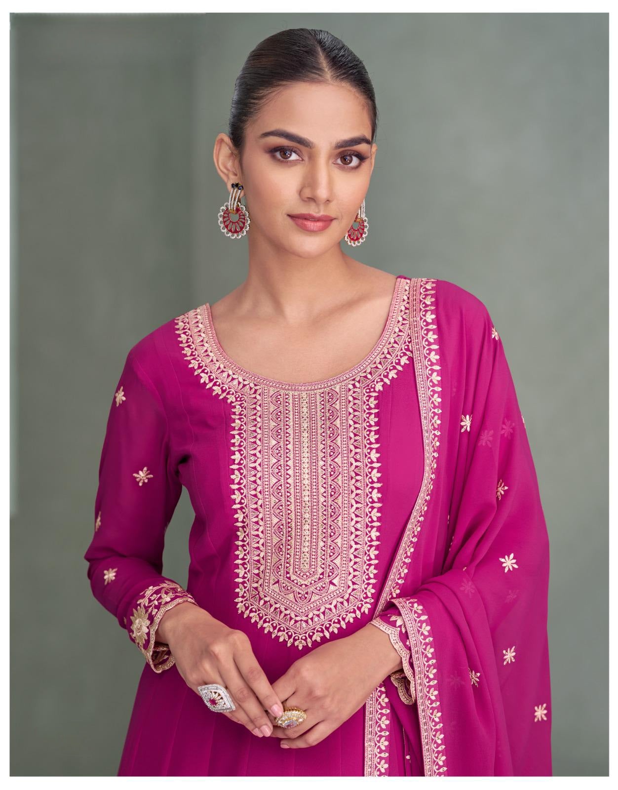 This graceful designer set features a beautifully tailored top in real georgette, highlighted with intricate embroidery on both the front and back—offering elegance from every angle. The matching dupatta in pure georgette adds a soft, flowing finish to the ensemble, making it ideal for elevated occasions.