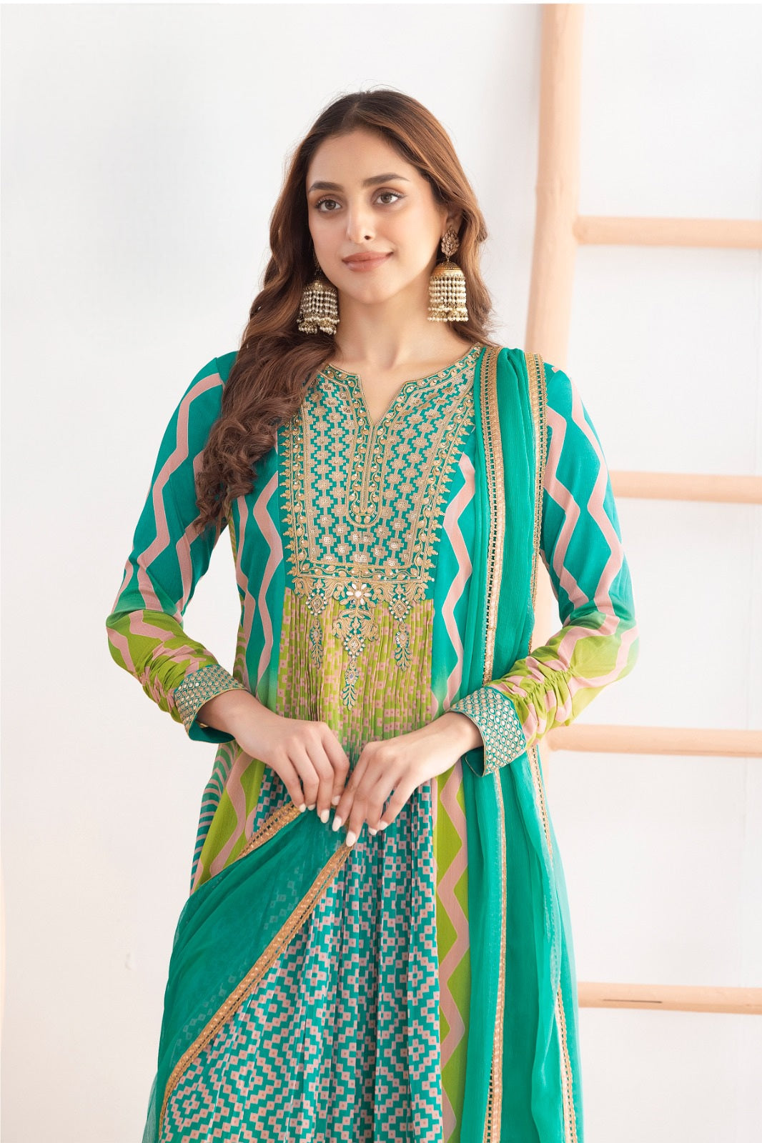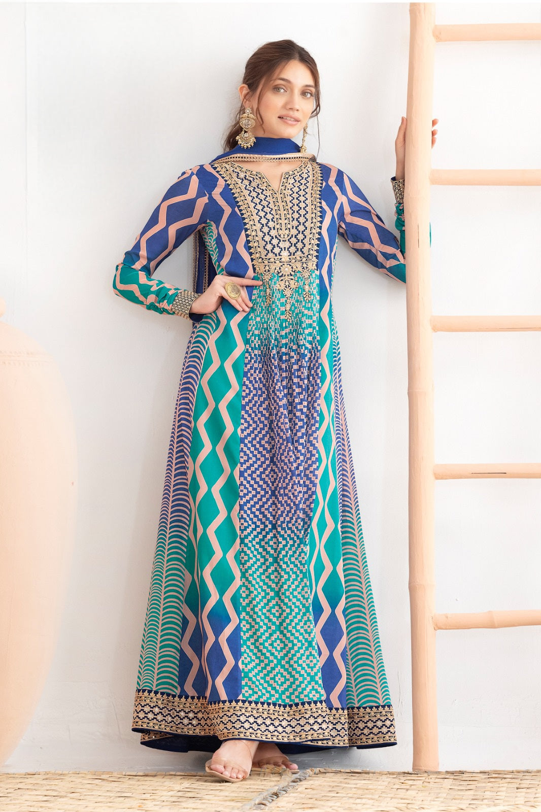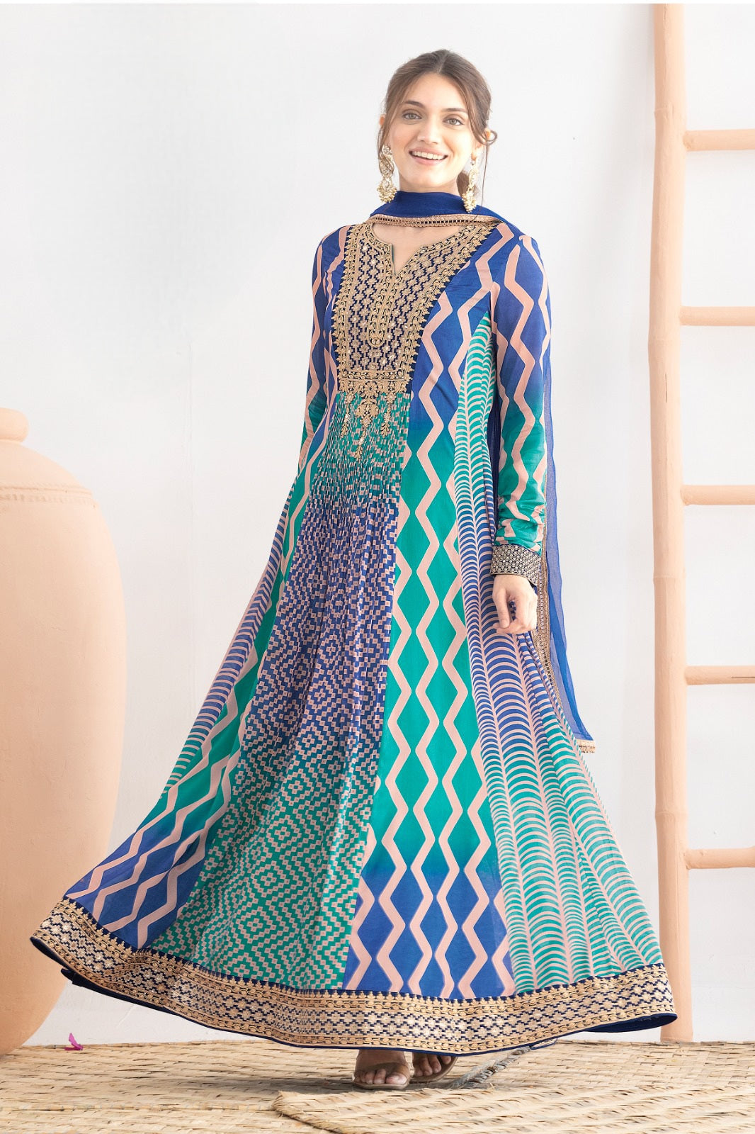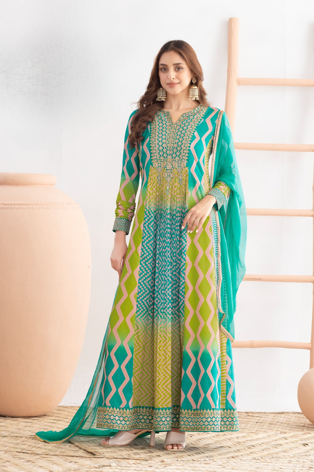 This stunning Anarkali features full-length sleeves and is crafted in premium chinnon fabric, highlighted with a graceful dual-colour combination. The ensemble is paired with a pure viscose chiffon dupatta, bordered with elegant four-side lace detailing. The outfit is enriched with intricate dabka dori and resham work, presenting traditional motifs, beautifully blended with Indian lehriya digital prints—making it a statement piece for festive and cultural occasions.