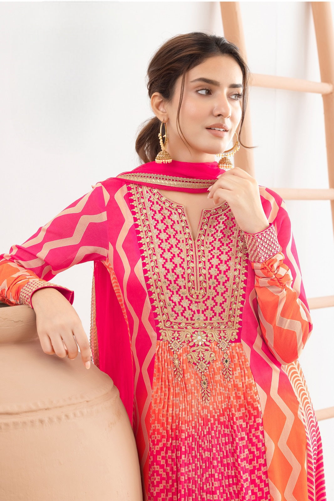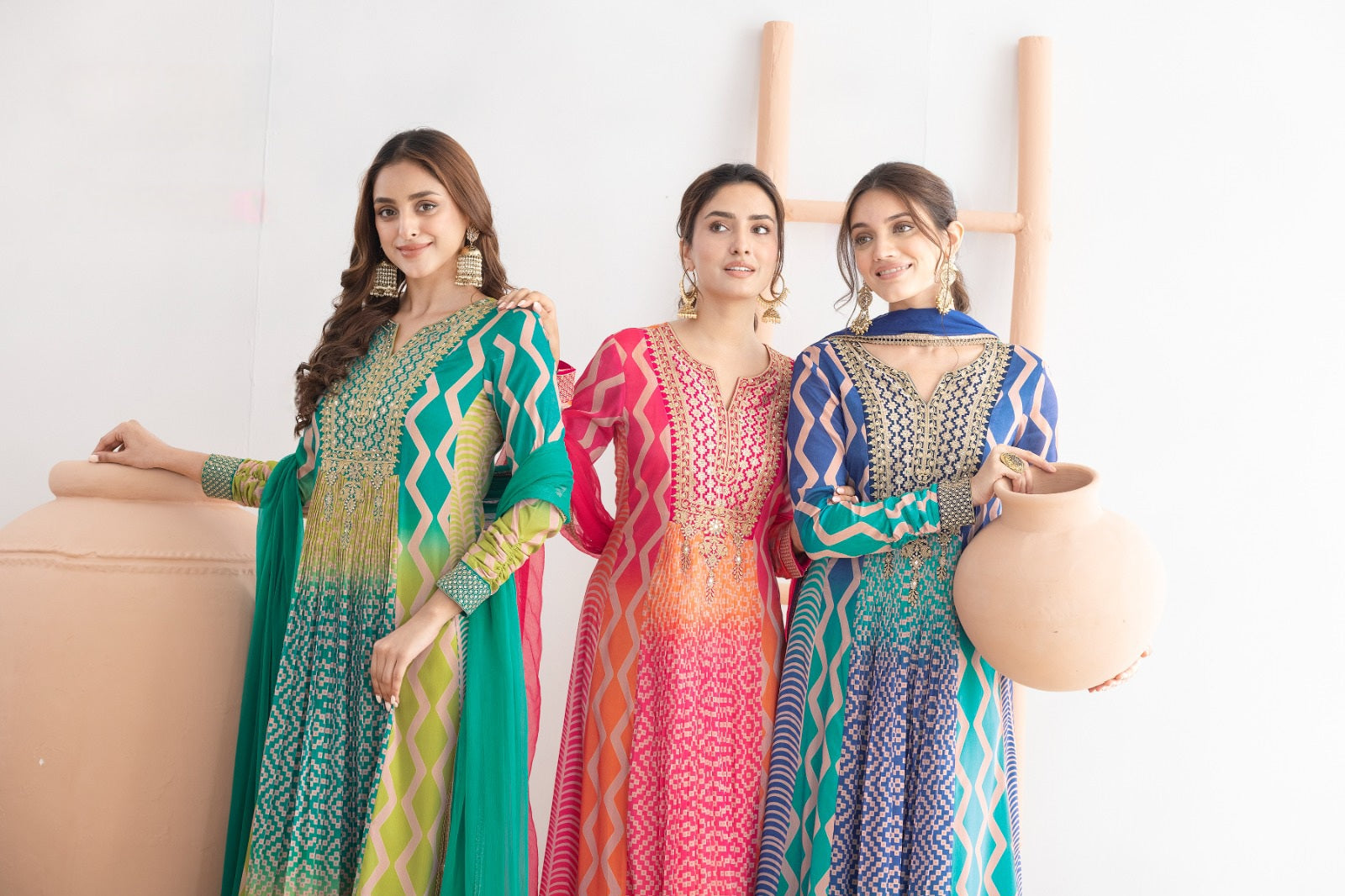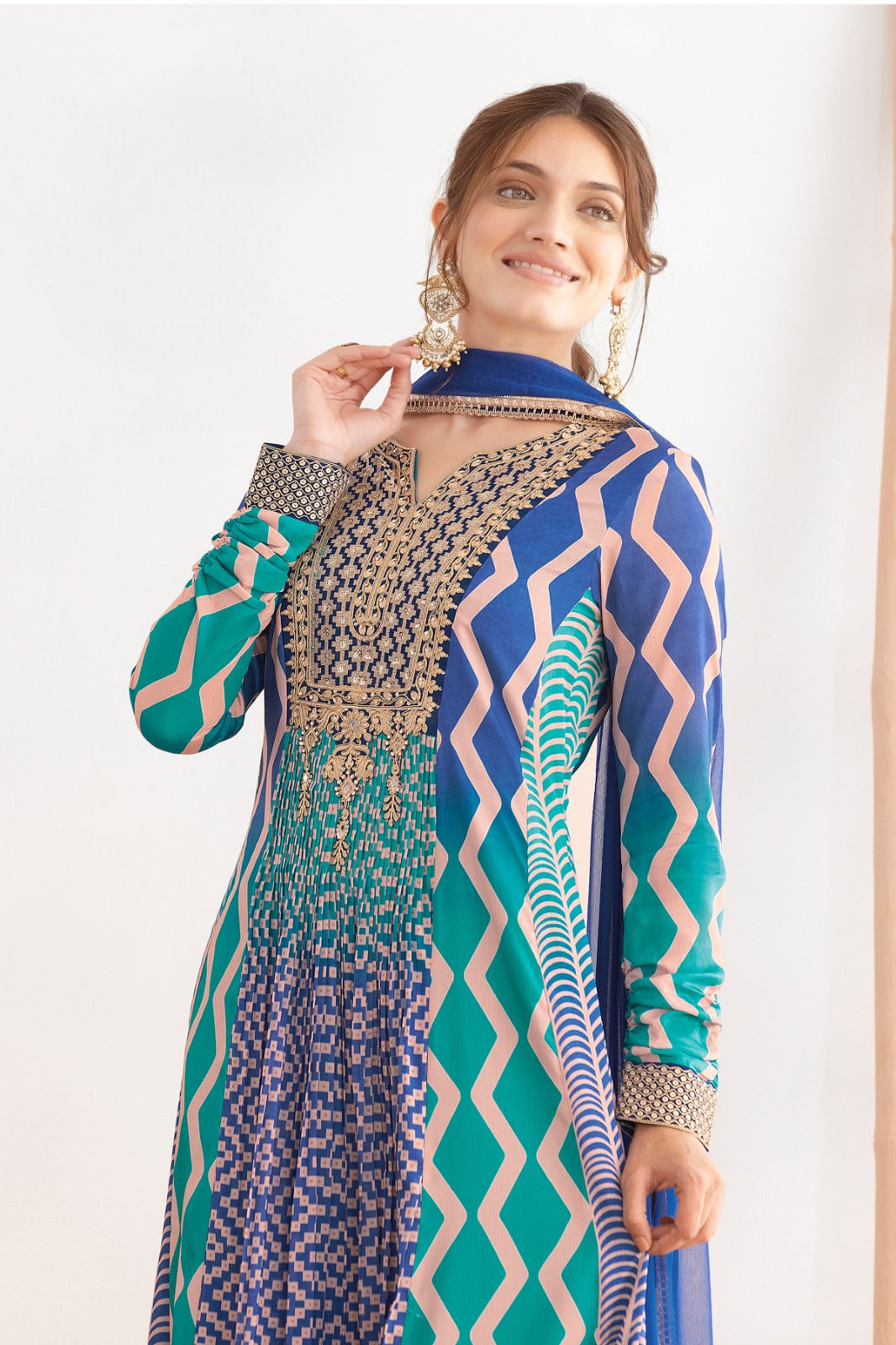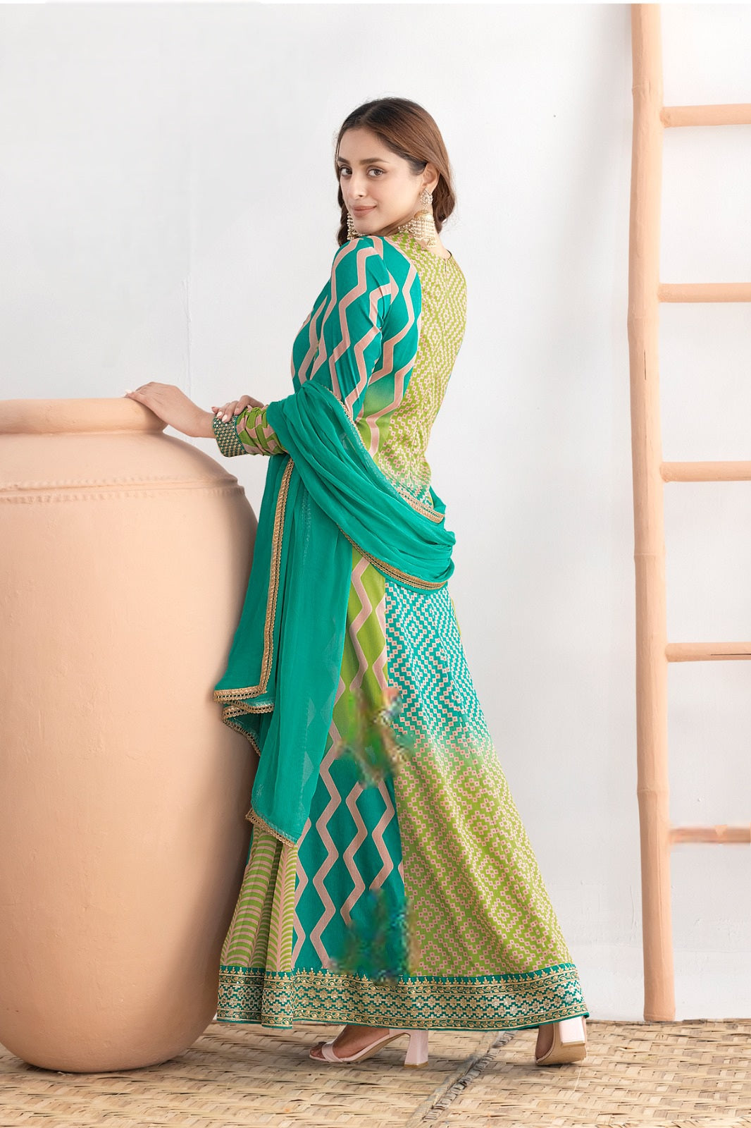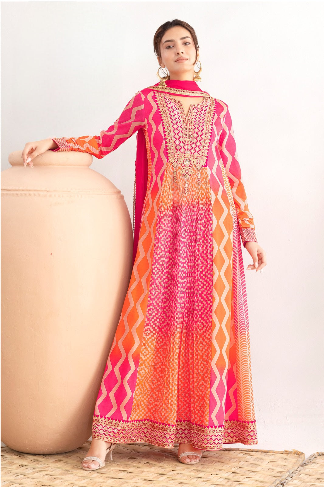 This stunning Anarkali features full-length sleeves and is crafted in premium chinnon fabric, highlighted with a graceful dual-colour combination. The ensemble is paired with a pure viscose chiffon dupatta, bordered with elegant four-side lace detailing. The outfit is enriched with intricate dabka dori and resham work, presenting traditional motifs, beautifully blended with Indian lehriya digital prints—making it a statement piece for festive and cultural occasions.