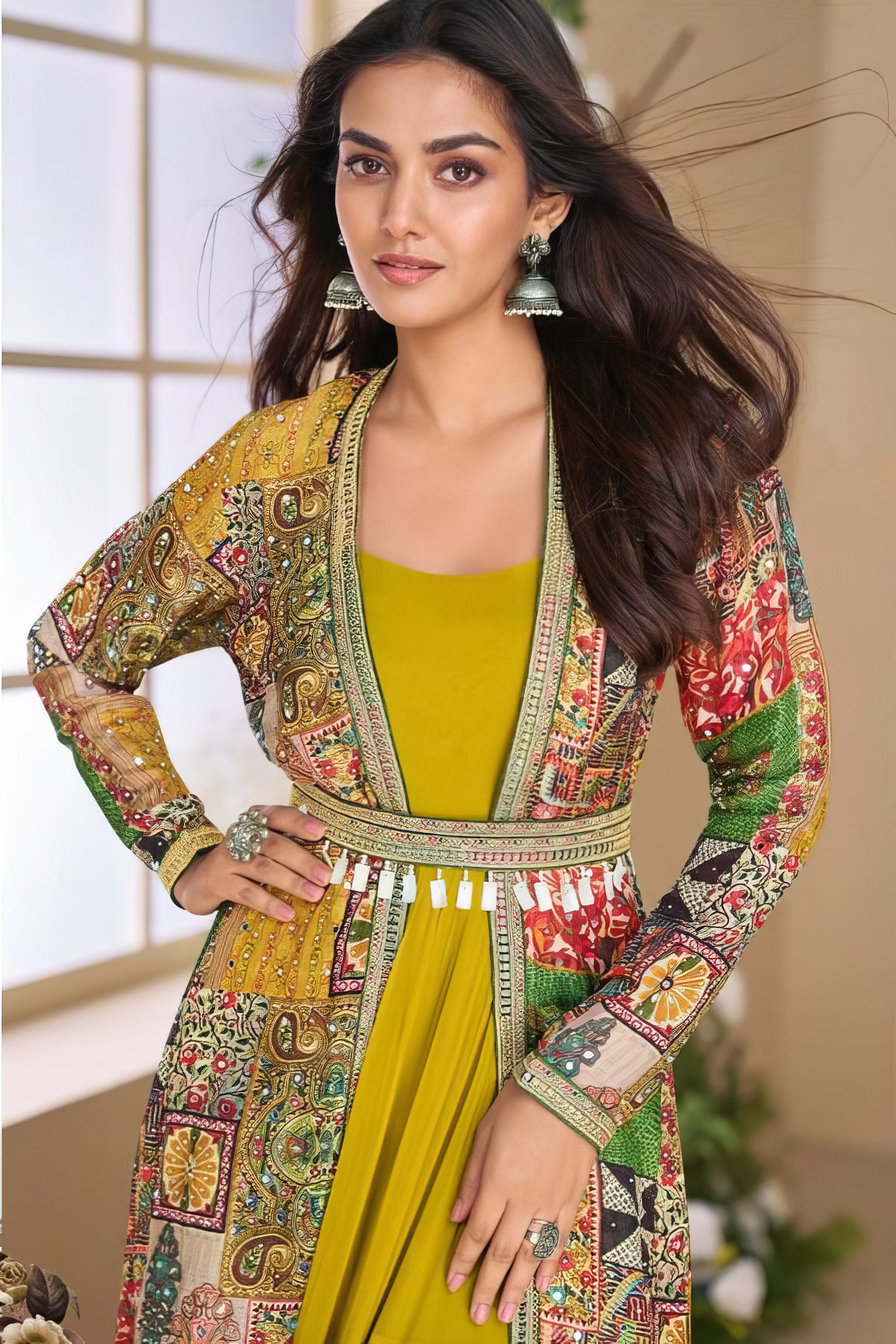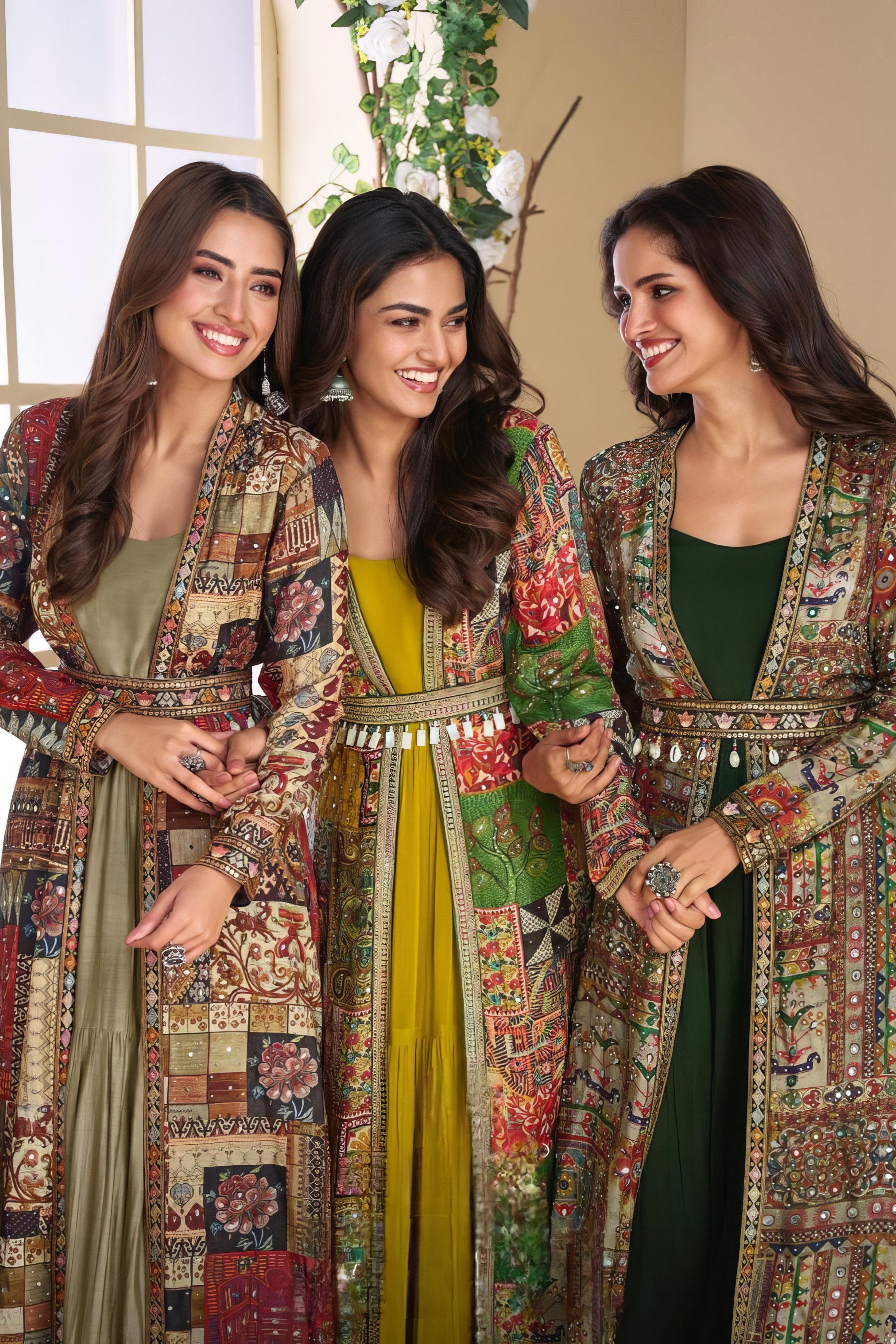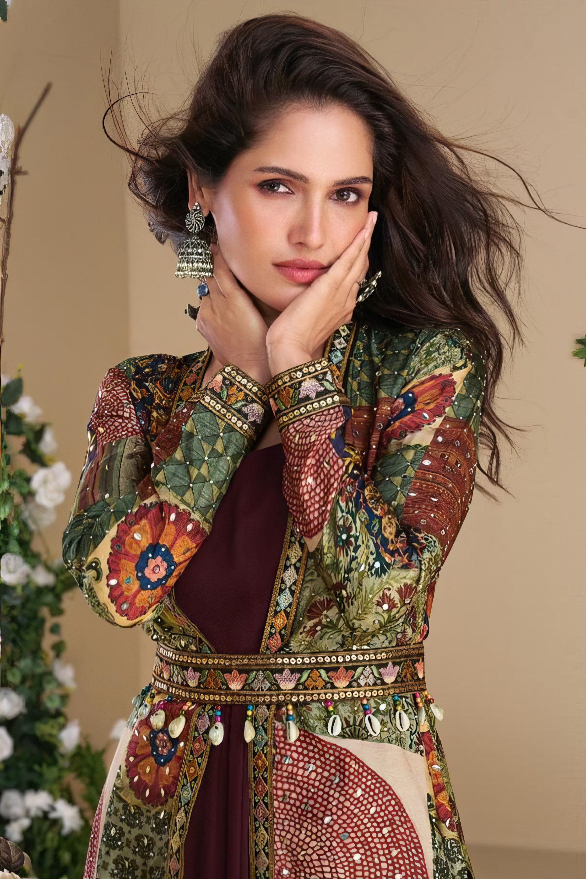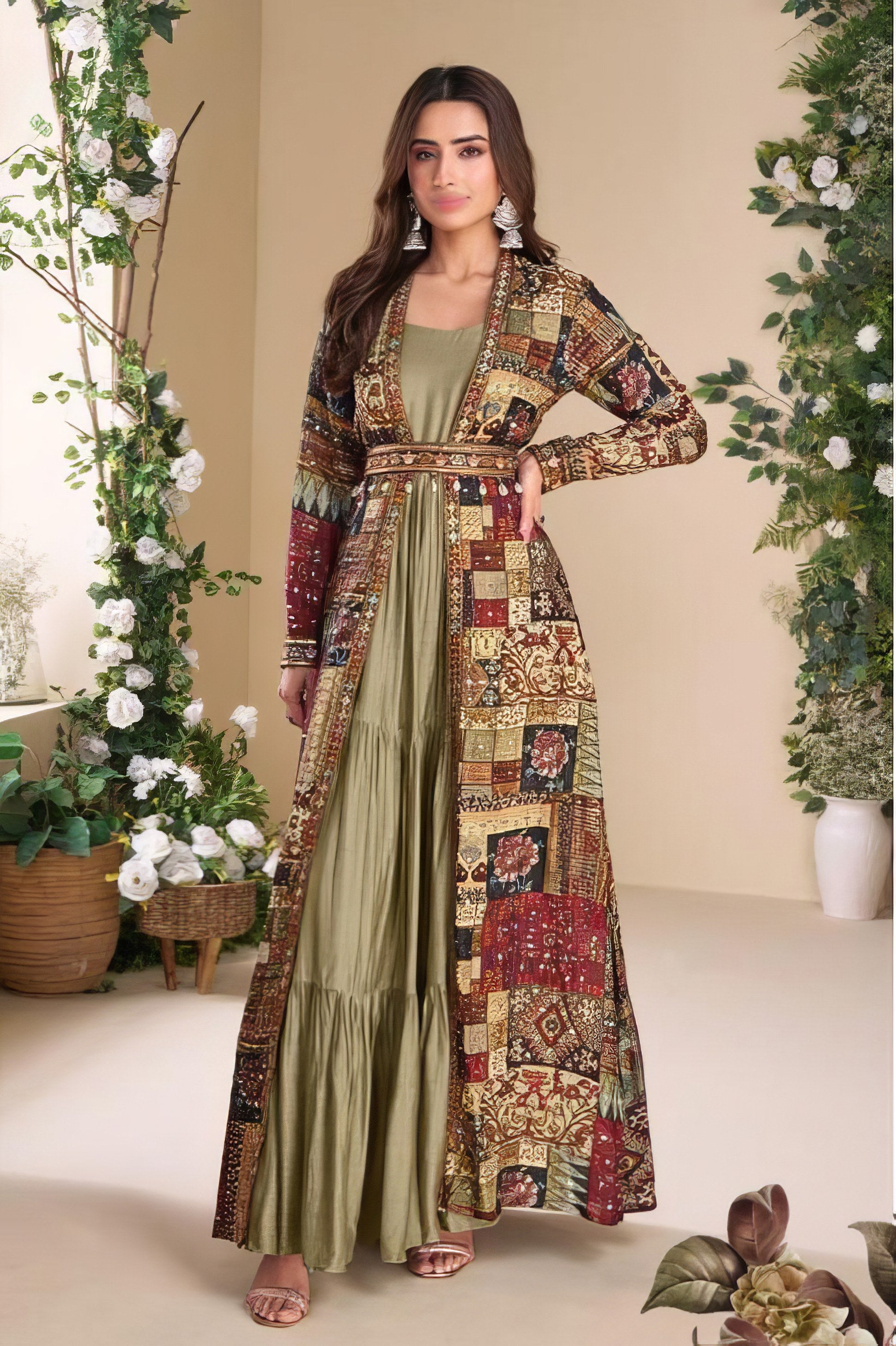 This premium outfit showcases a flowy base made from real georgette, offering comfort and grace in equal measure. It is paired with a stunning shrug crafted from real silk, beautifully hand-embellished with intricate embroidery that adds a luxurious, designer edge. The combination of rich fabrics and detailed craftsmanship makes this ensemble perfect for standout occasions.