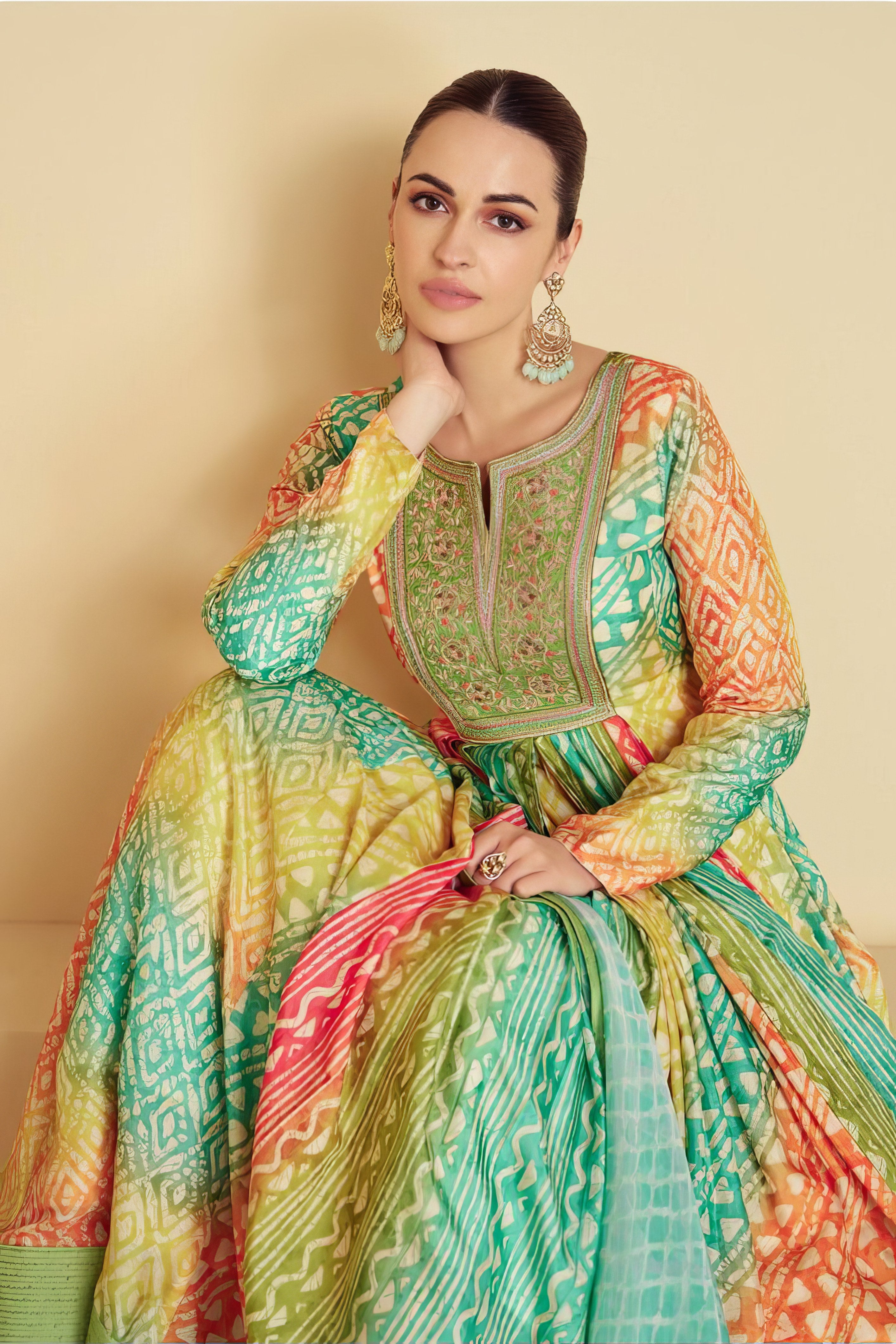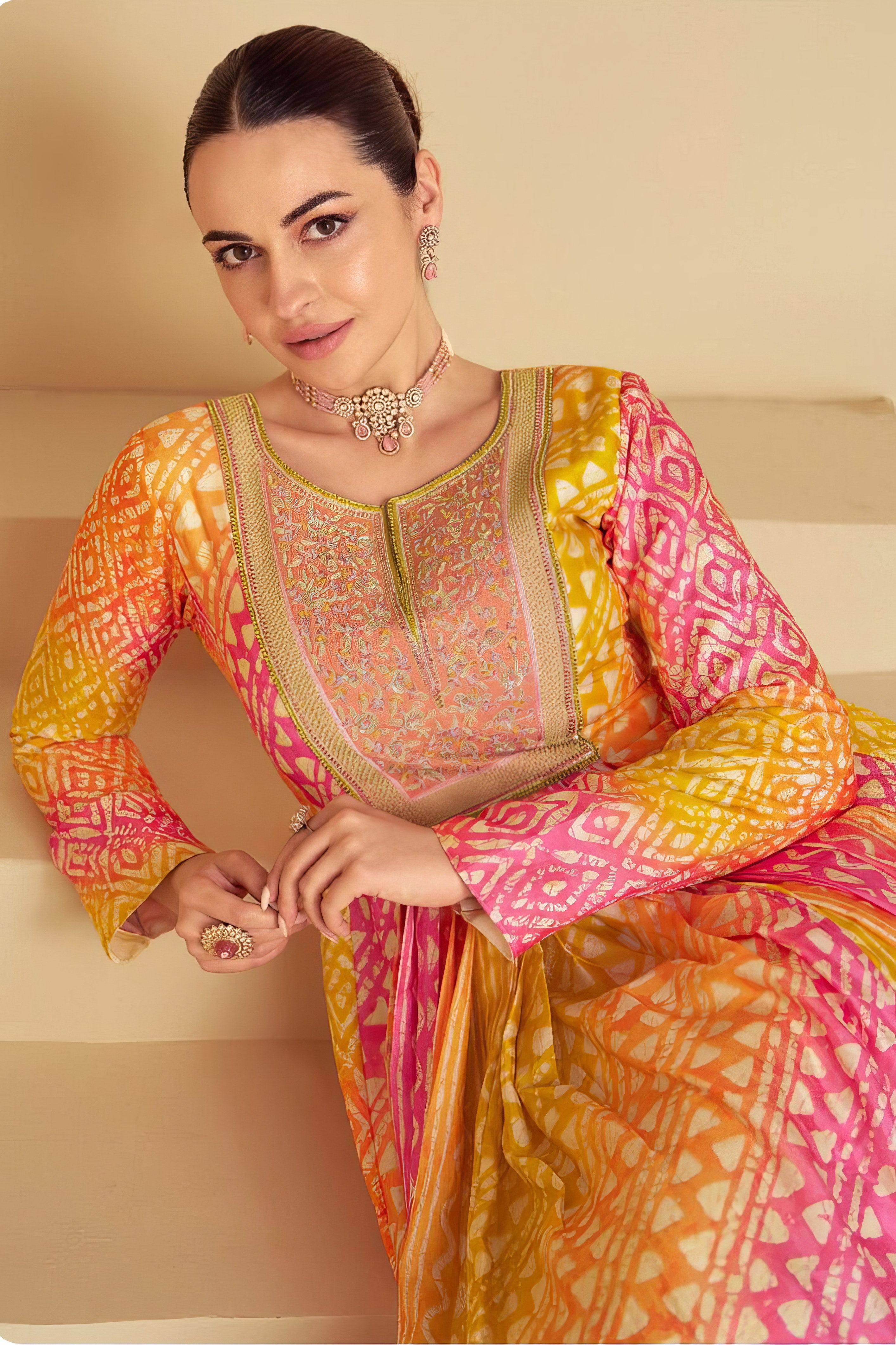 This elegant set features a top made from premium real muslin fabric, adorned with soft digital prints that bring a modern touch to traditional style. The look is completed with a real tabi silk dupatta, also digitally printed, offering a light, graceful drape perfect for both day and evening occasions.
