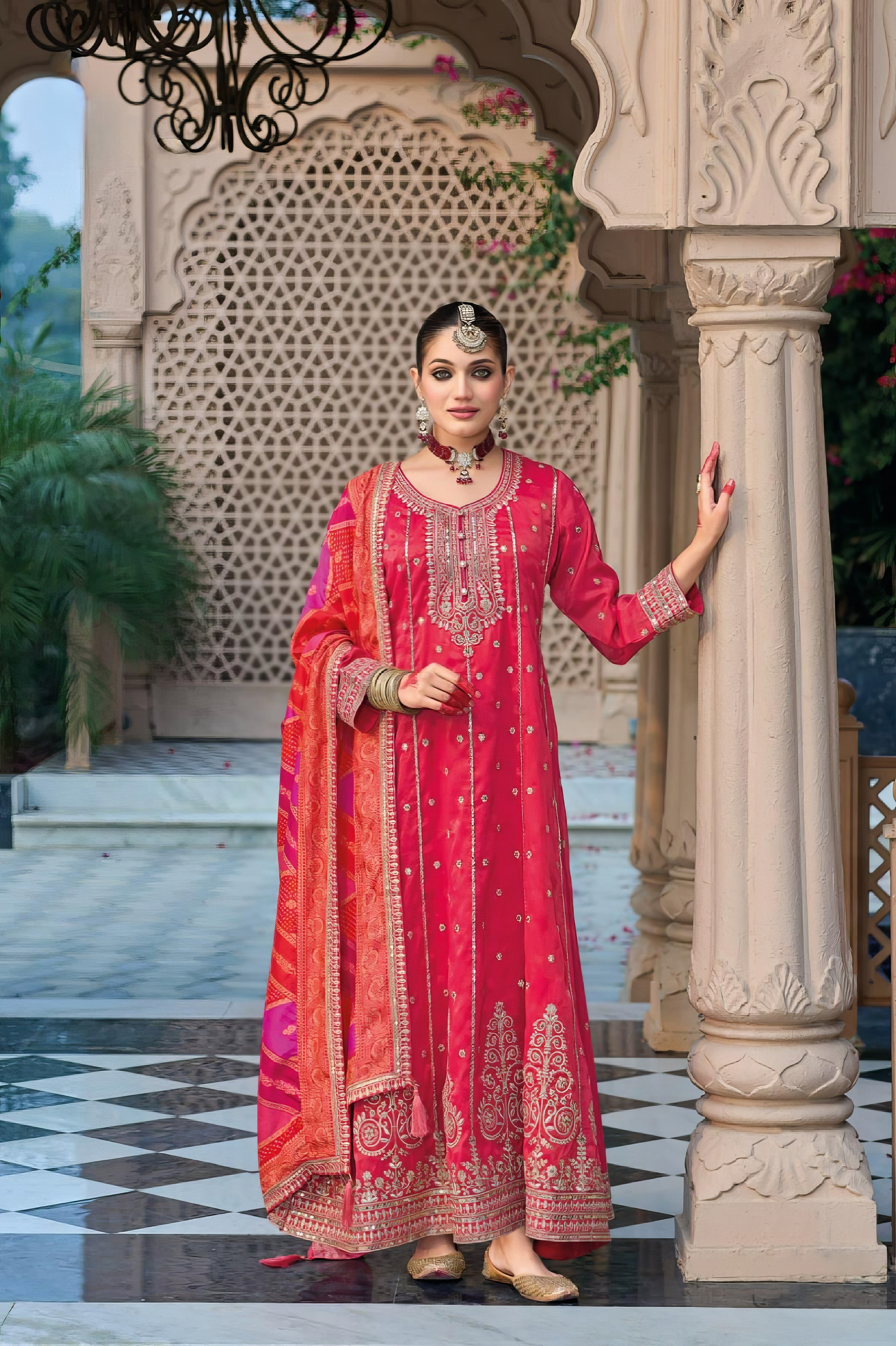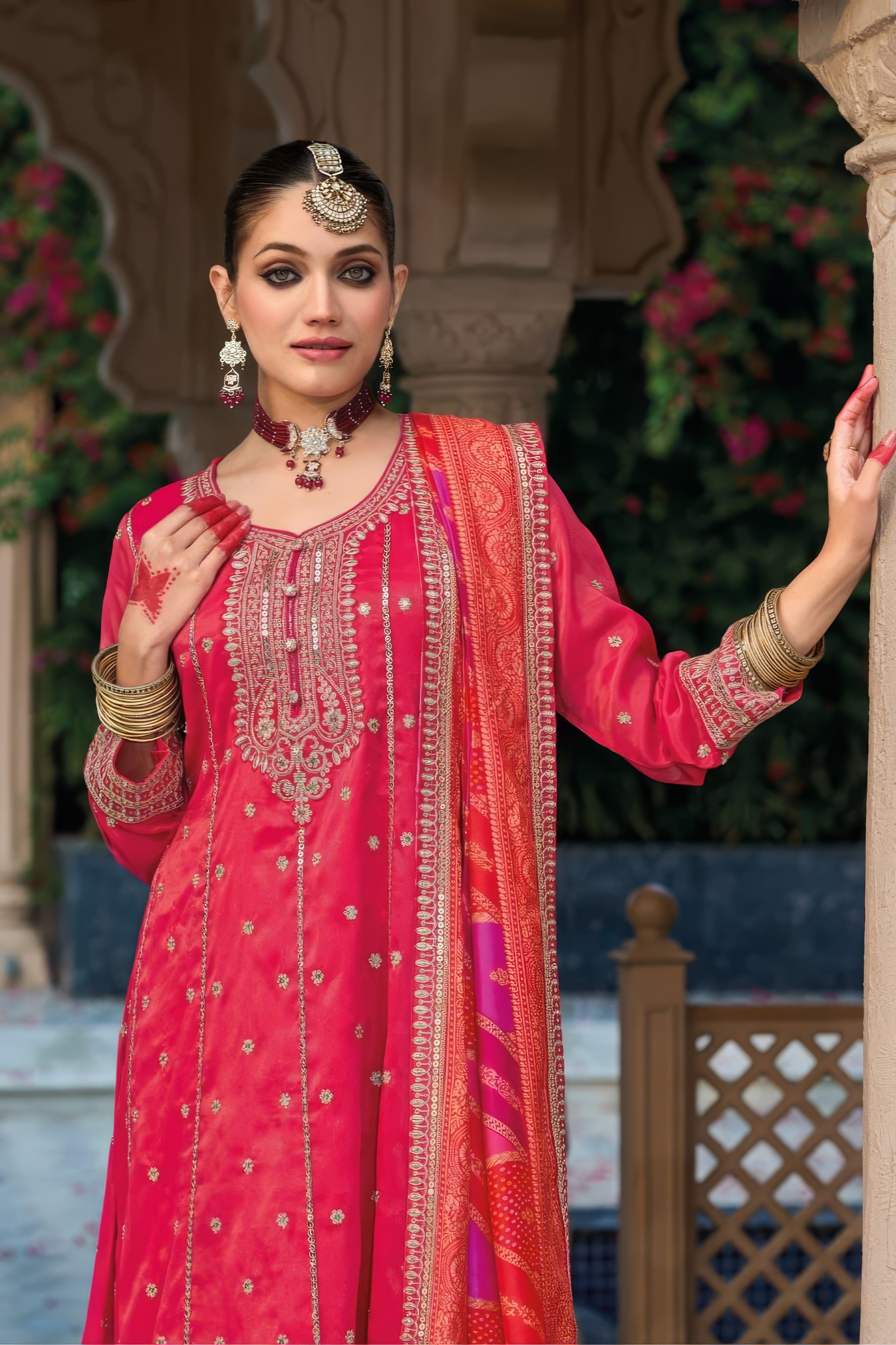 This fully stitched outfit showcases a richly embroidered top made from premium heavy simar fabric, giving it a sophisticated sheen and elegant structure. It is beautifully paired with a pure viscose dola dupatta featuring vibrant digital prints, adding a modern artistic touch to the traditional silhouette. The combination of textured embroidery and fluid drape makes this set a versatile pick for festive events.