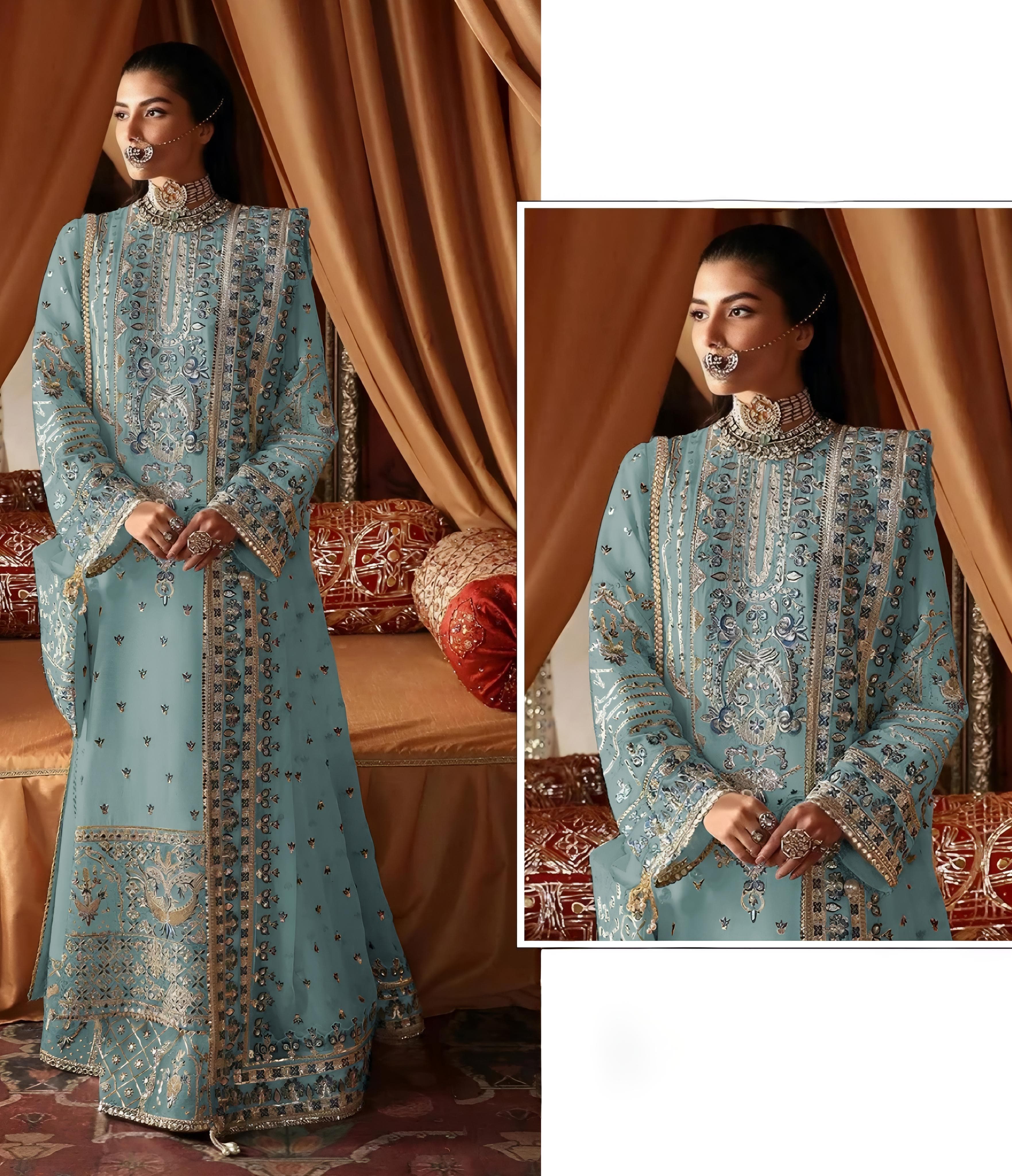 Elevate your festive wardrobe with Zeenat Sheen, a beautifully embellished suit set in Heavy Fox Georgette. Intricate sequin embroidery and fine lace accents make this a timeless choice for special occasions.