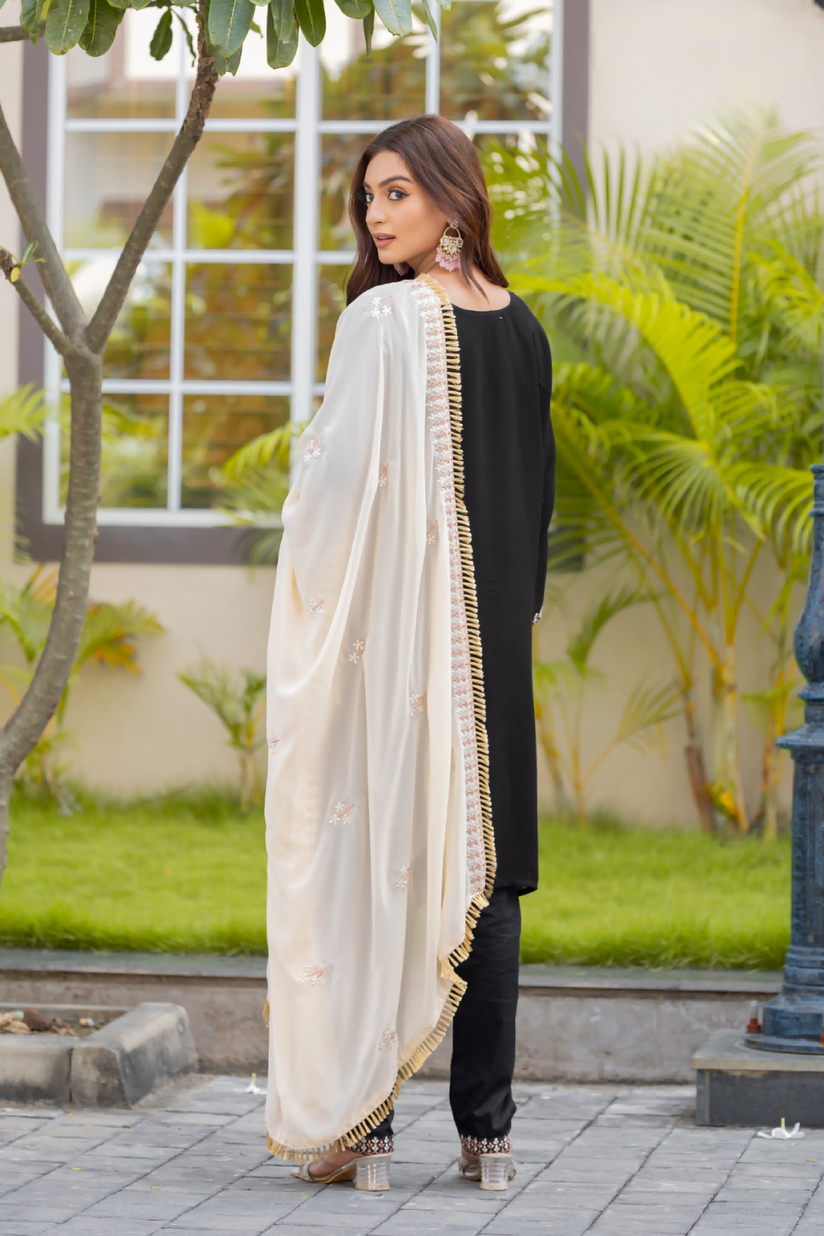 A soft, flowy dupatta adorned with delicate embroidery and lace detailing, elevating the outfit with charm and finesse.