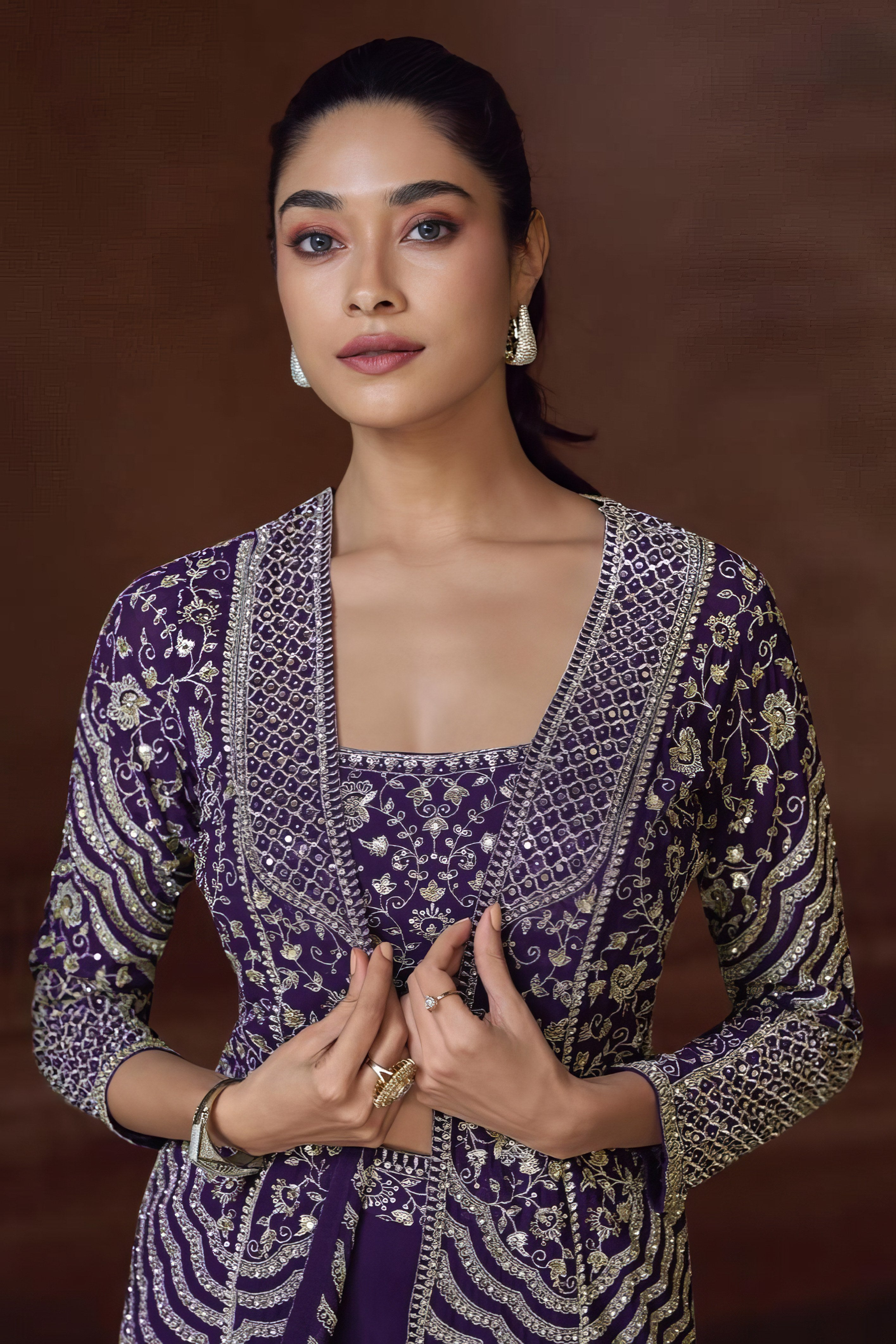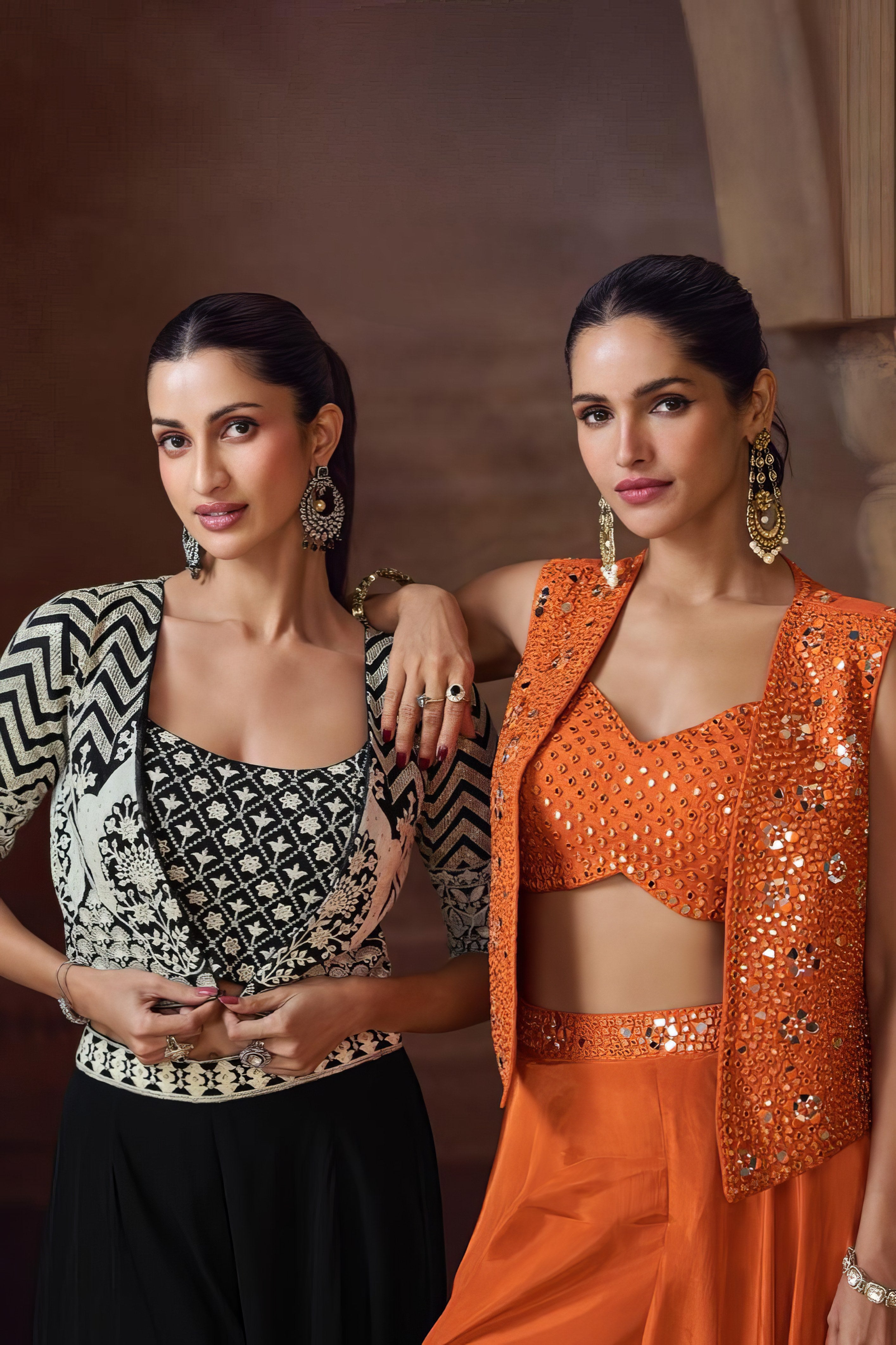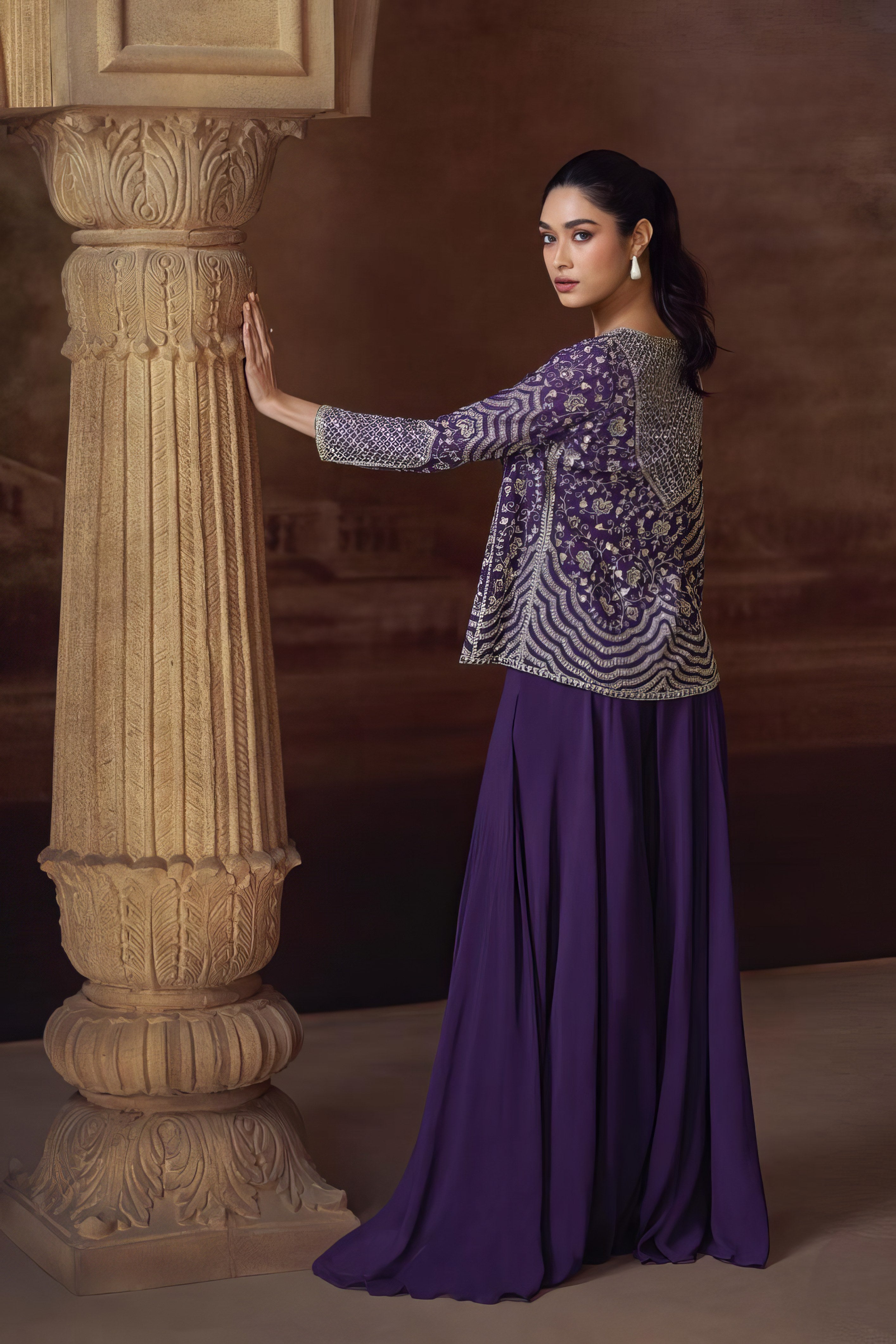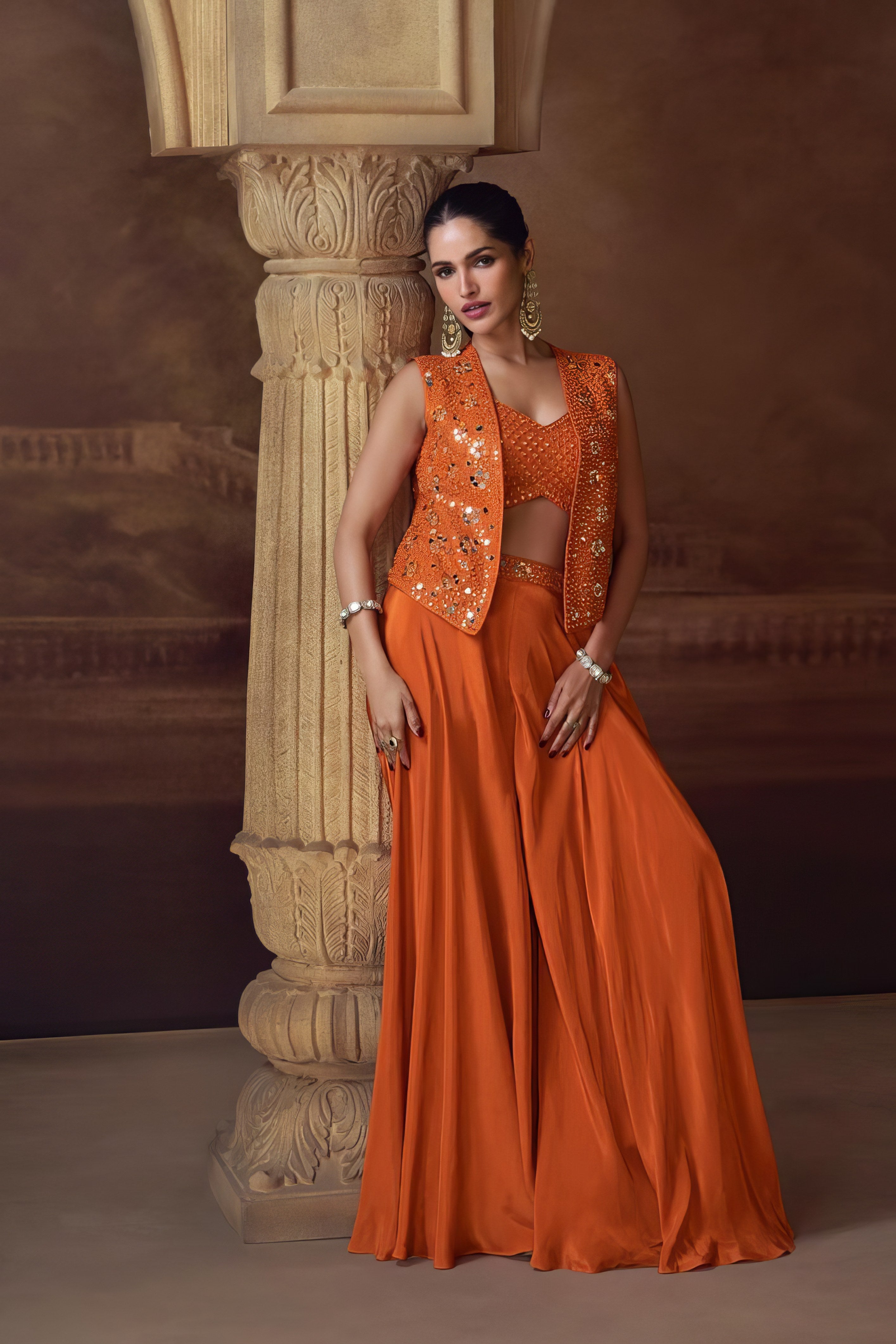 This fully stitched designer set features a stylish short jacket crafted in real premium chinon silk, beautifully embroidered on both front and back, with shimmering mirror work for a modern festive charm. The inner blouse, made from premium real georgette, showcases elegant embroidery that complements the jacket. Paired with a flared premium chinon silk plazzo, this outfit is a perfect blend of contemporary fashion and traditional elegance.