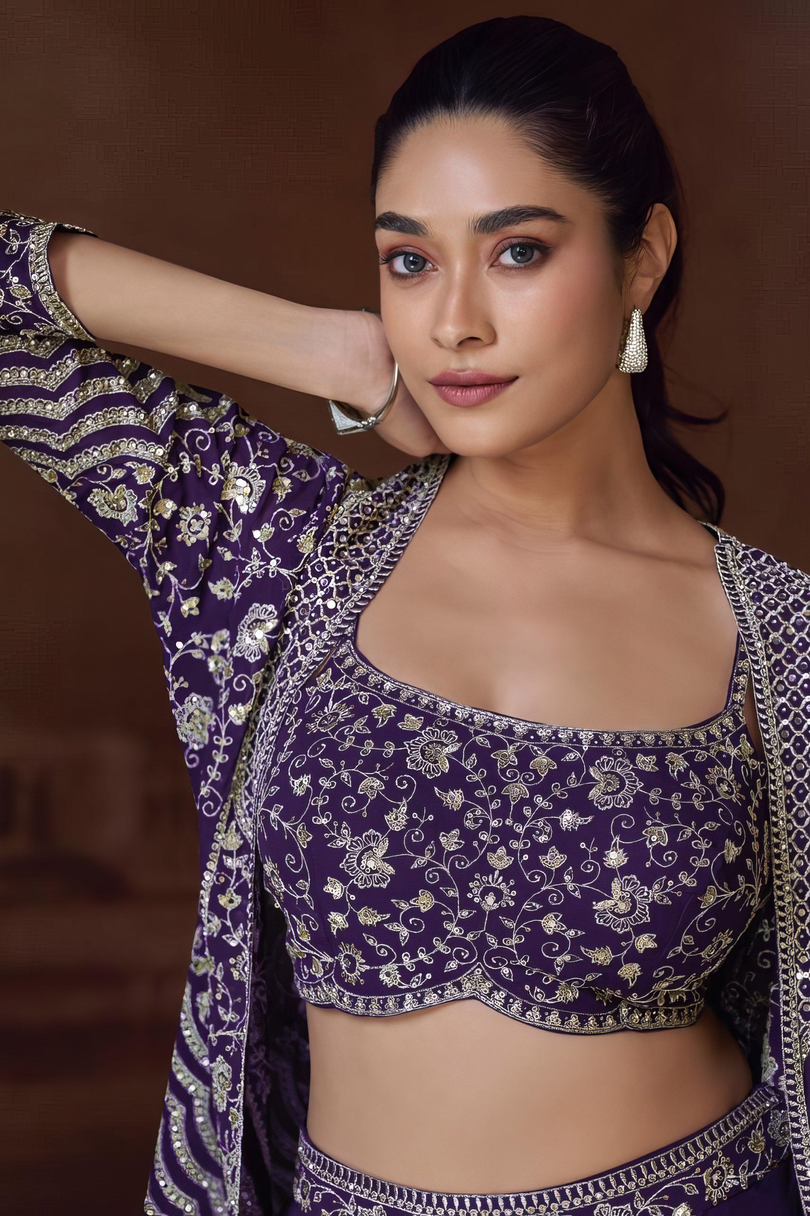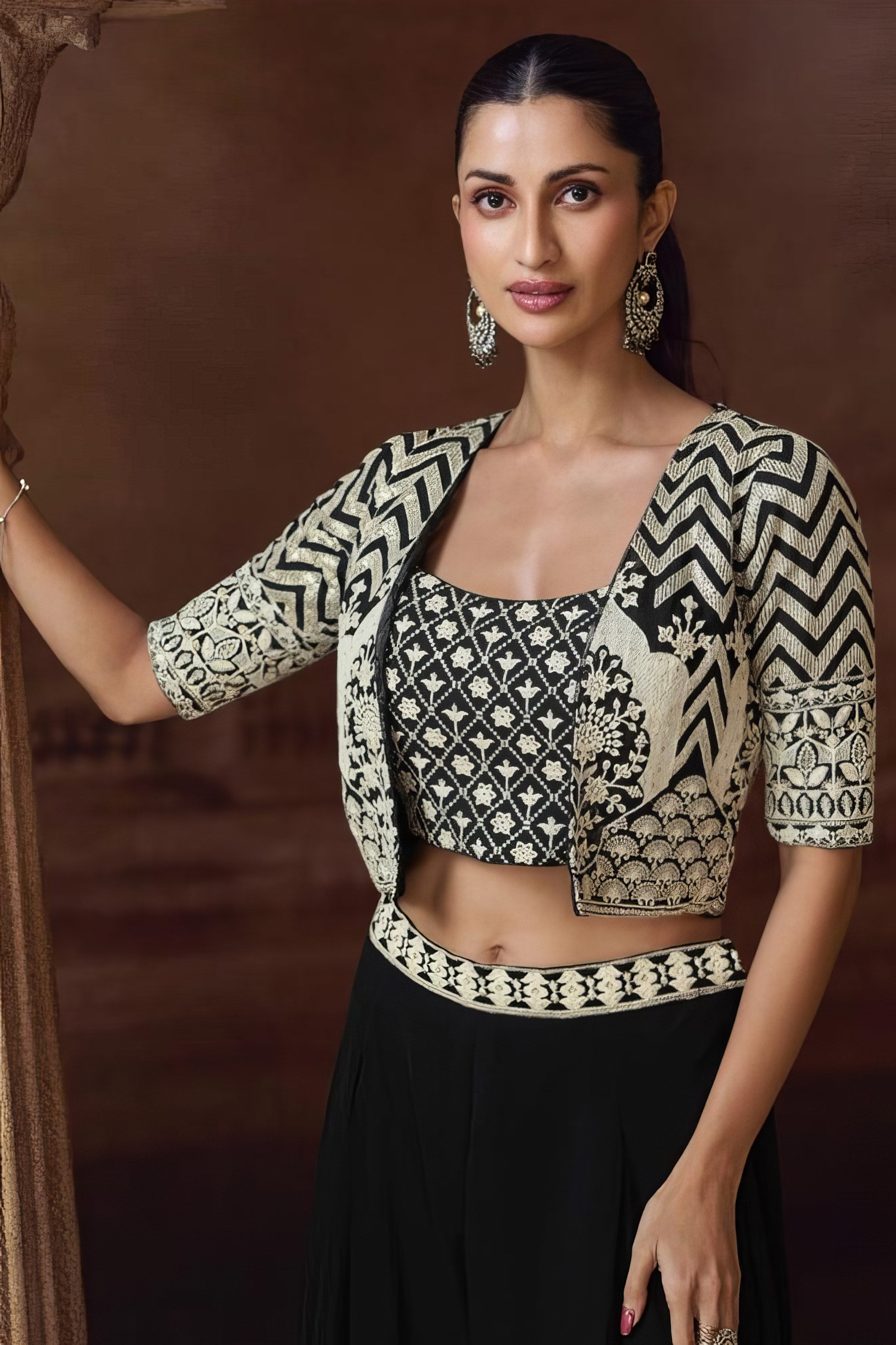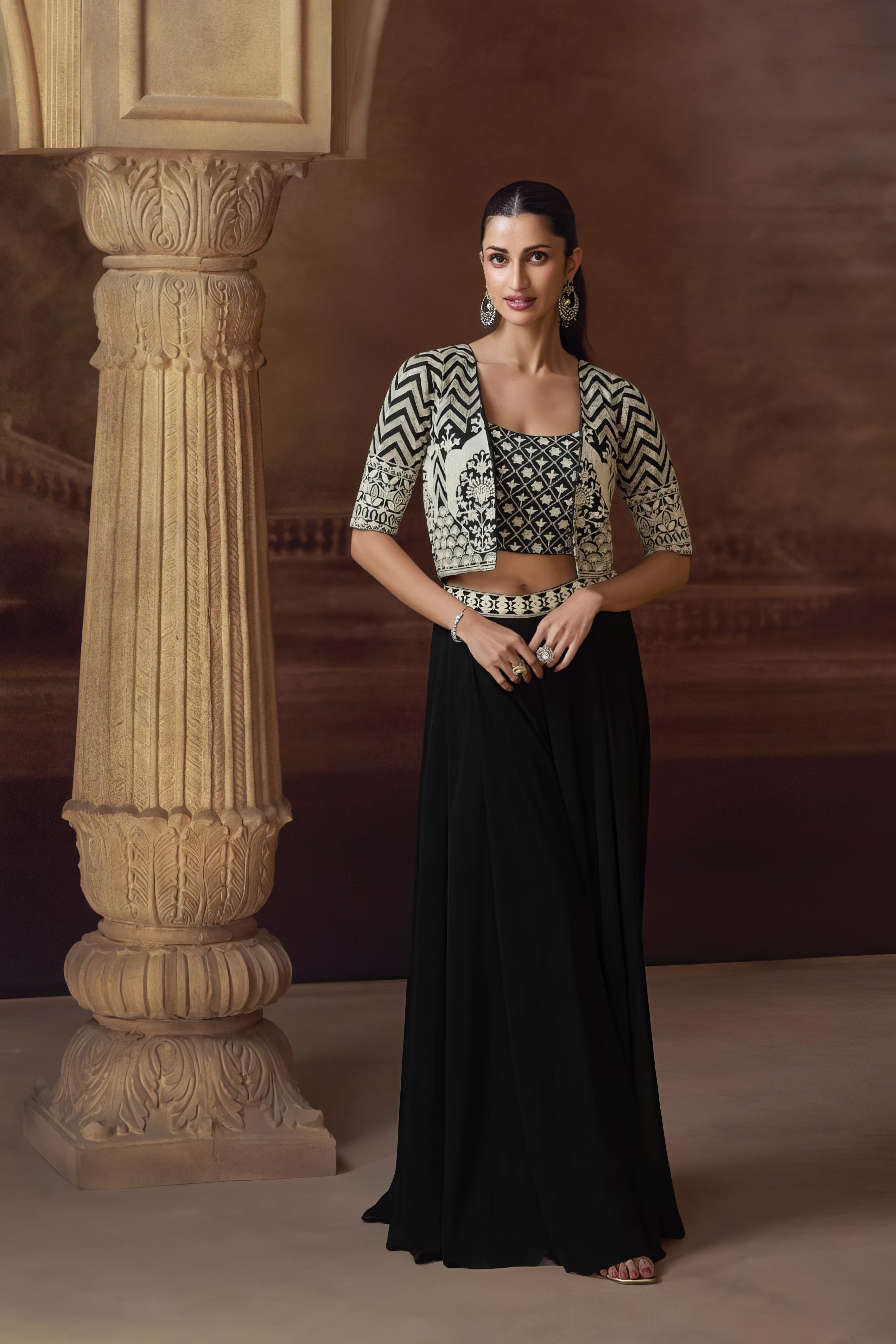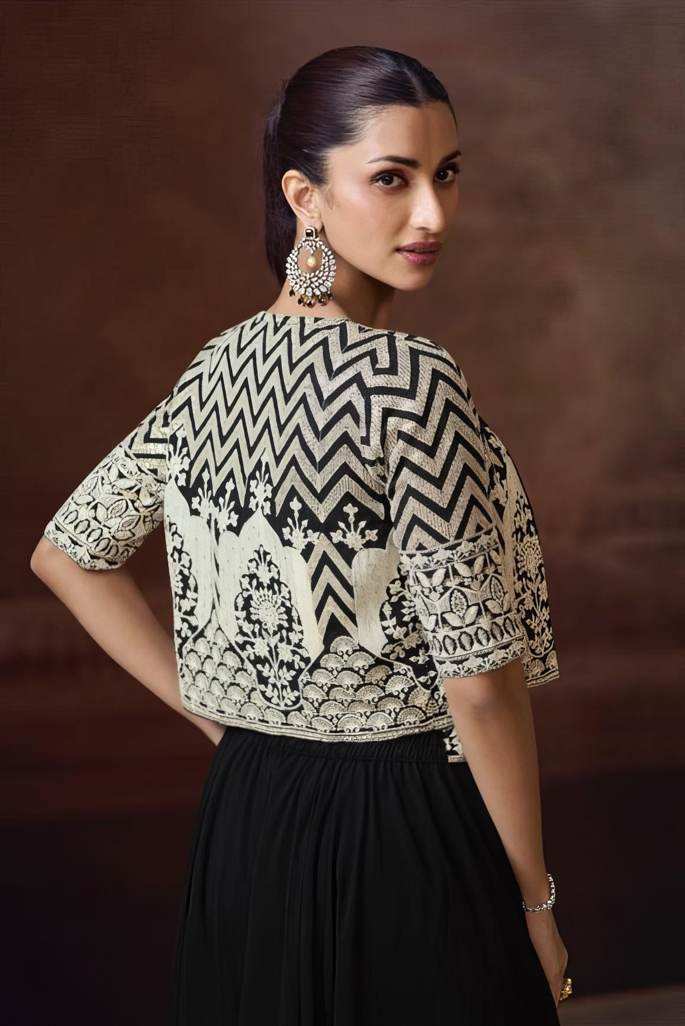 This fully stitched designer set features a stylish short jacket crafted in real premium chinon silk, beautifully embroidered on both front and back, with shimmering mirror work for a modern festive charm. The inner blouse, made from premium real georgette, showcases elegant embroidery that complements the jacket. Paired with a flared premium chinon silk plazzo, this outfit is a perfect blend of contemporary fashion and traditional elegance.