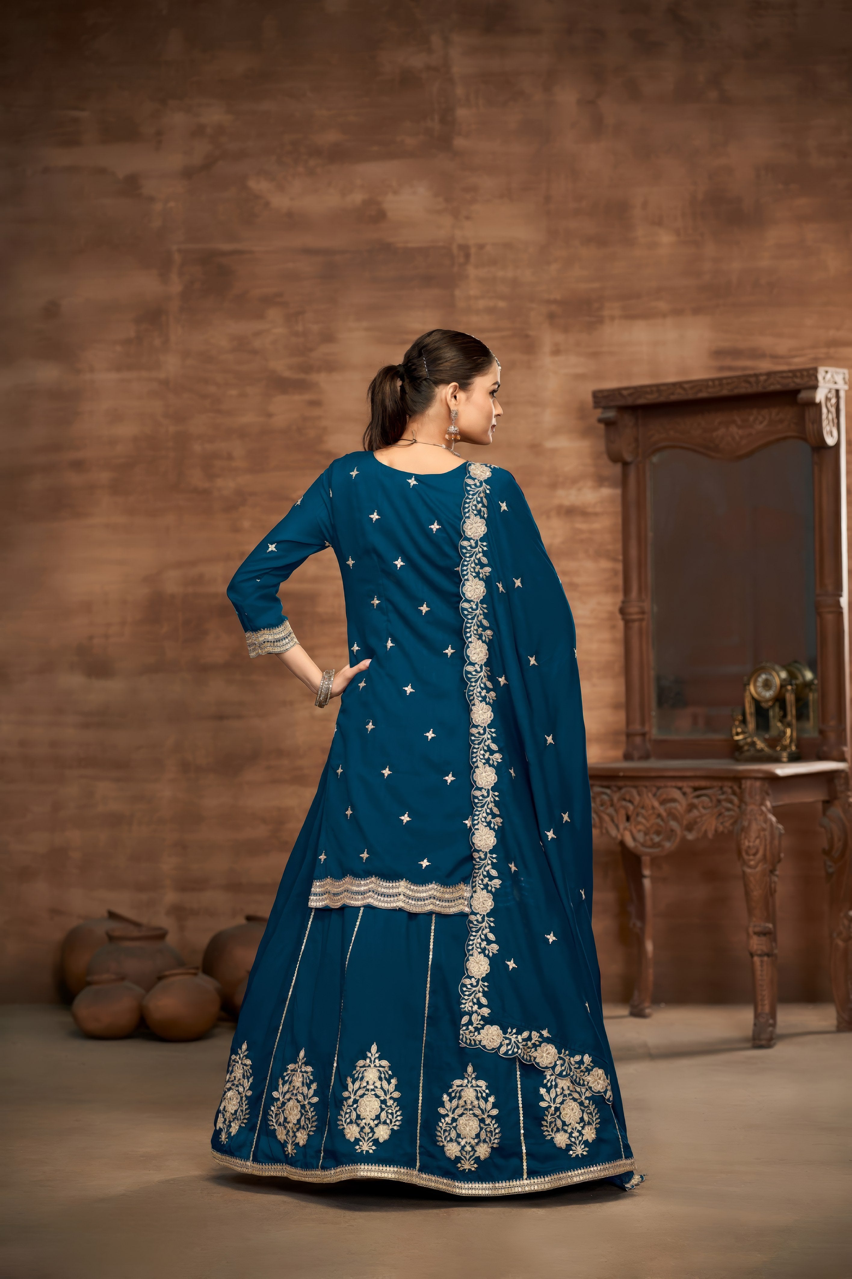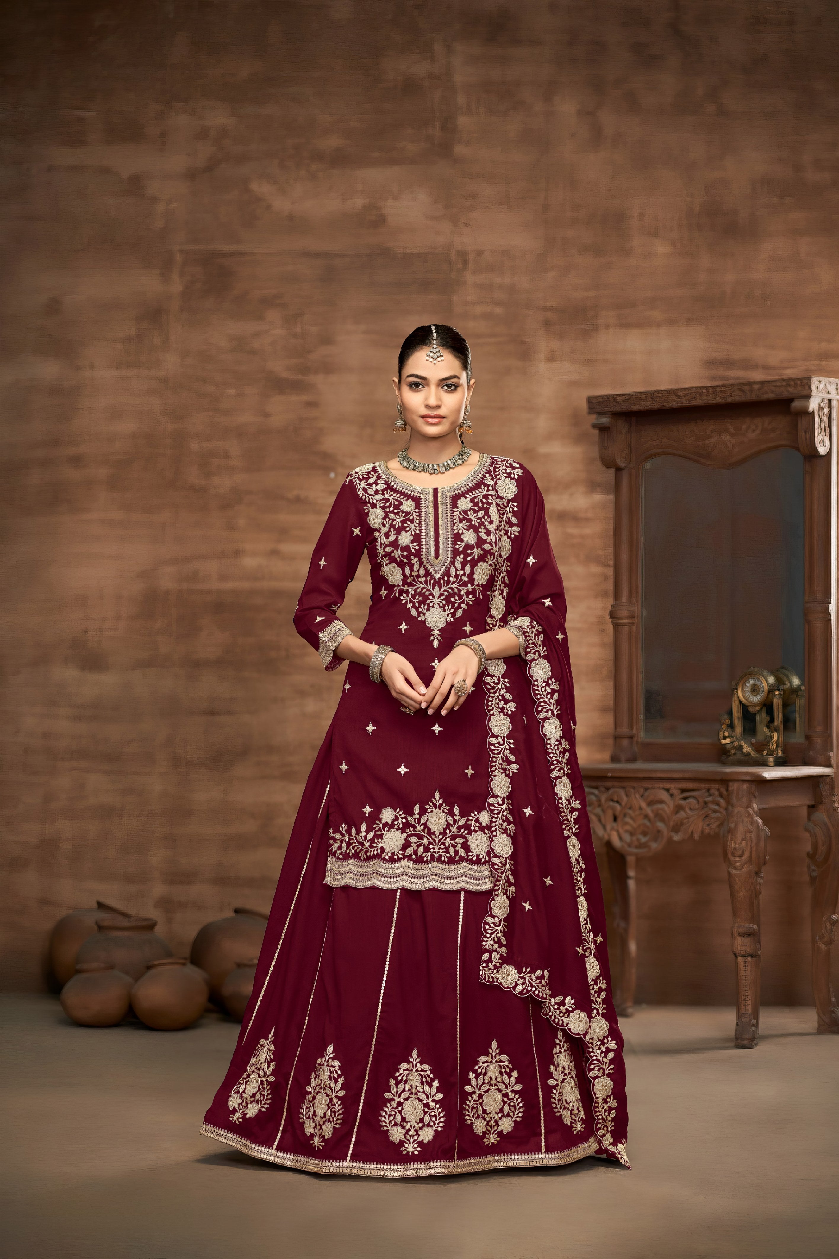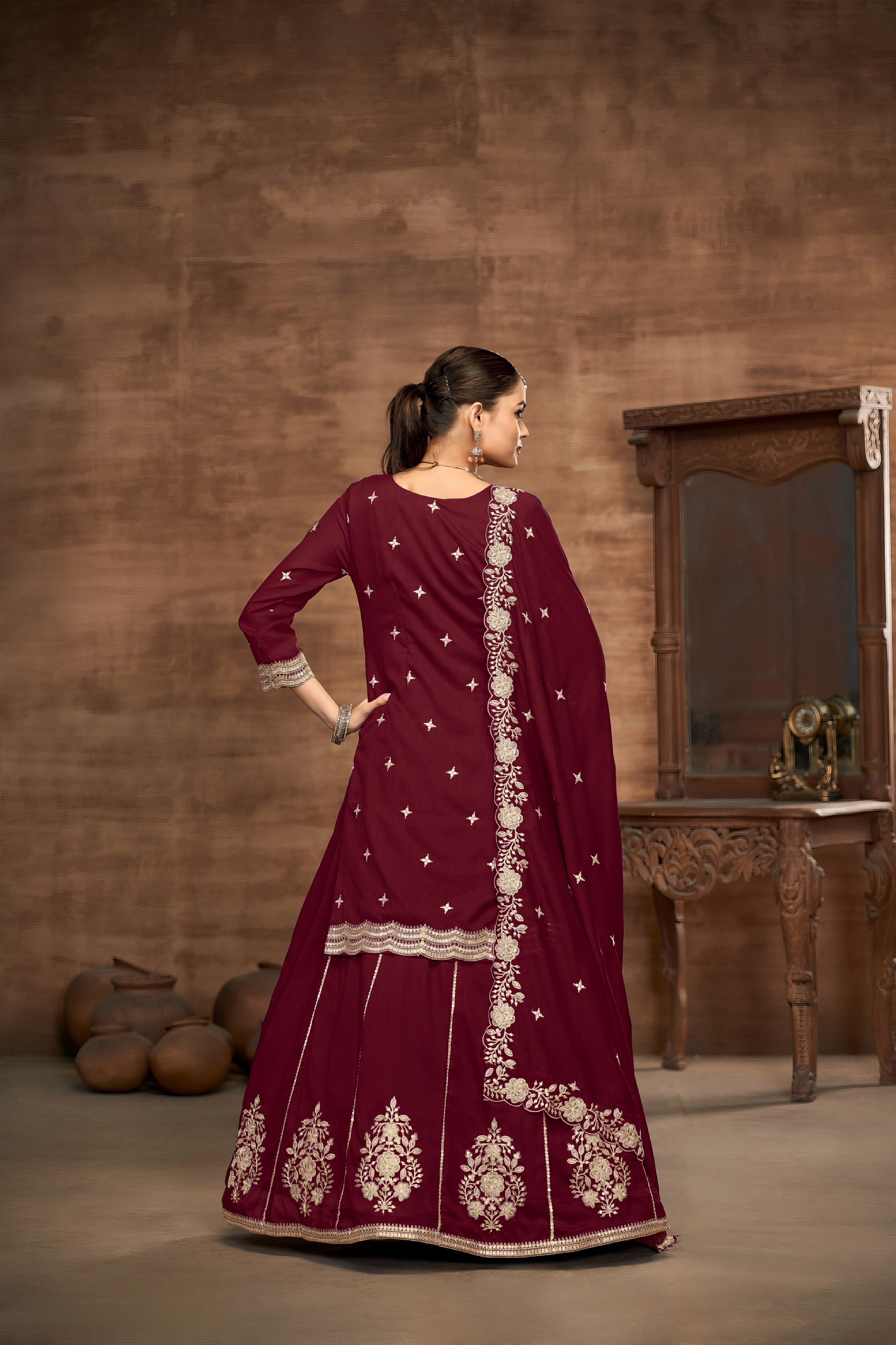 This fully stitched lehenga set is crafted in rich vichitra silk, known for its subtle sheen and smooth drape. The top features elegant embroidery work that enhances its festive appeal, while the flared lehenga offers a graceful silhouette with comfortable movement. Completing the look is a matching vichitra silk dupatta with embroidered borders, making it a perfect choice for celebratory occasions.