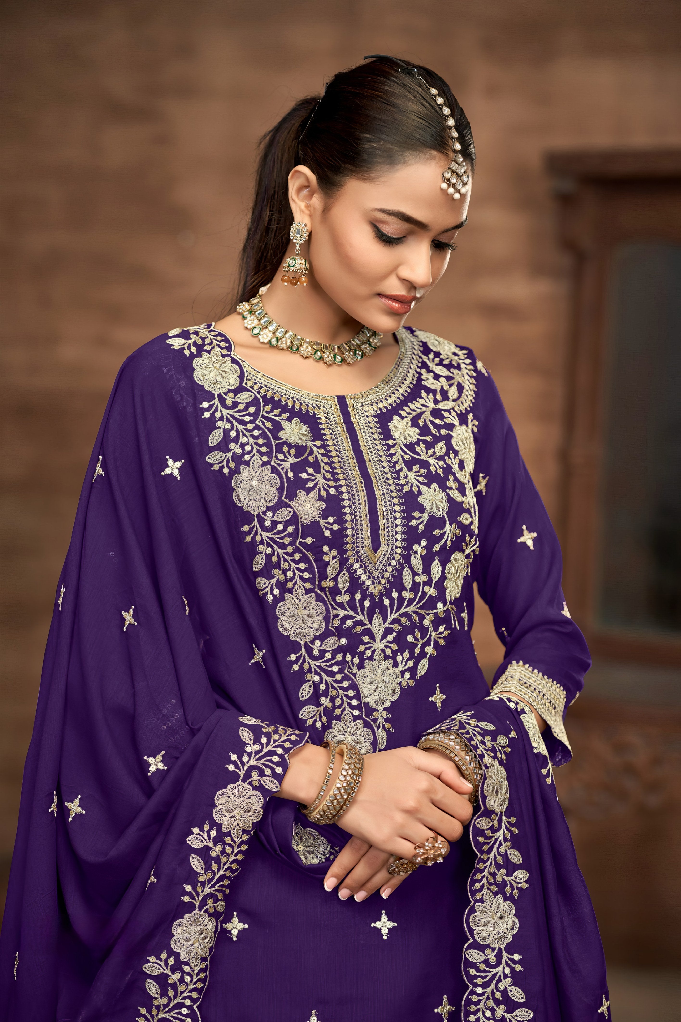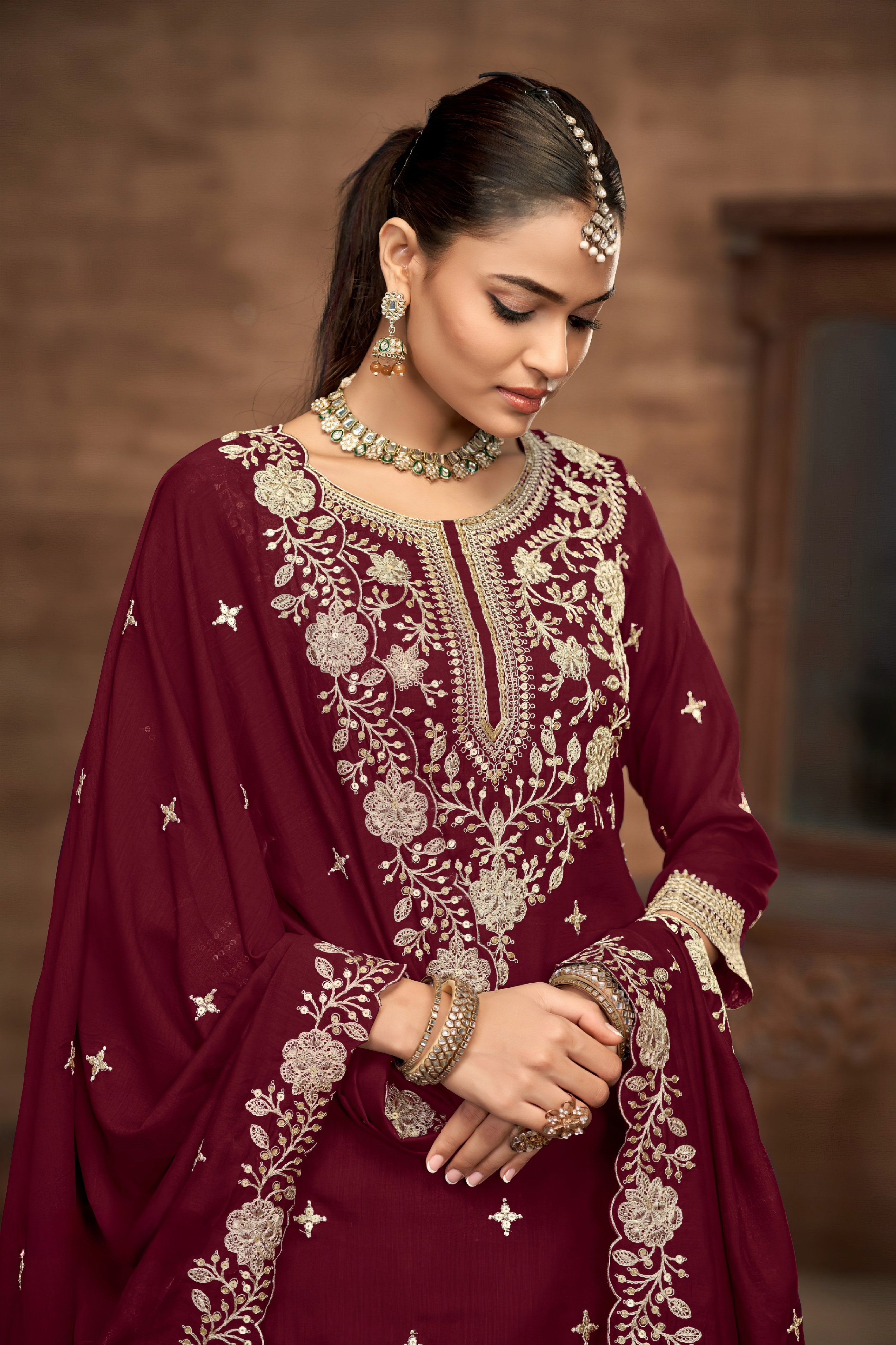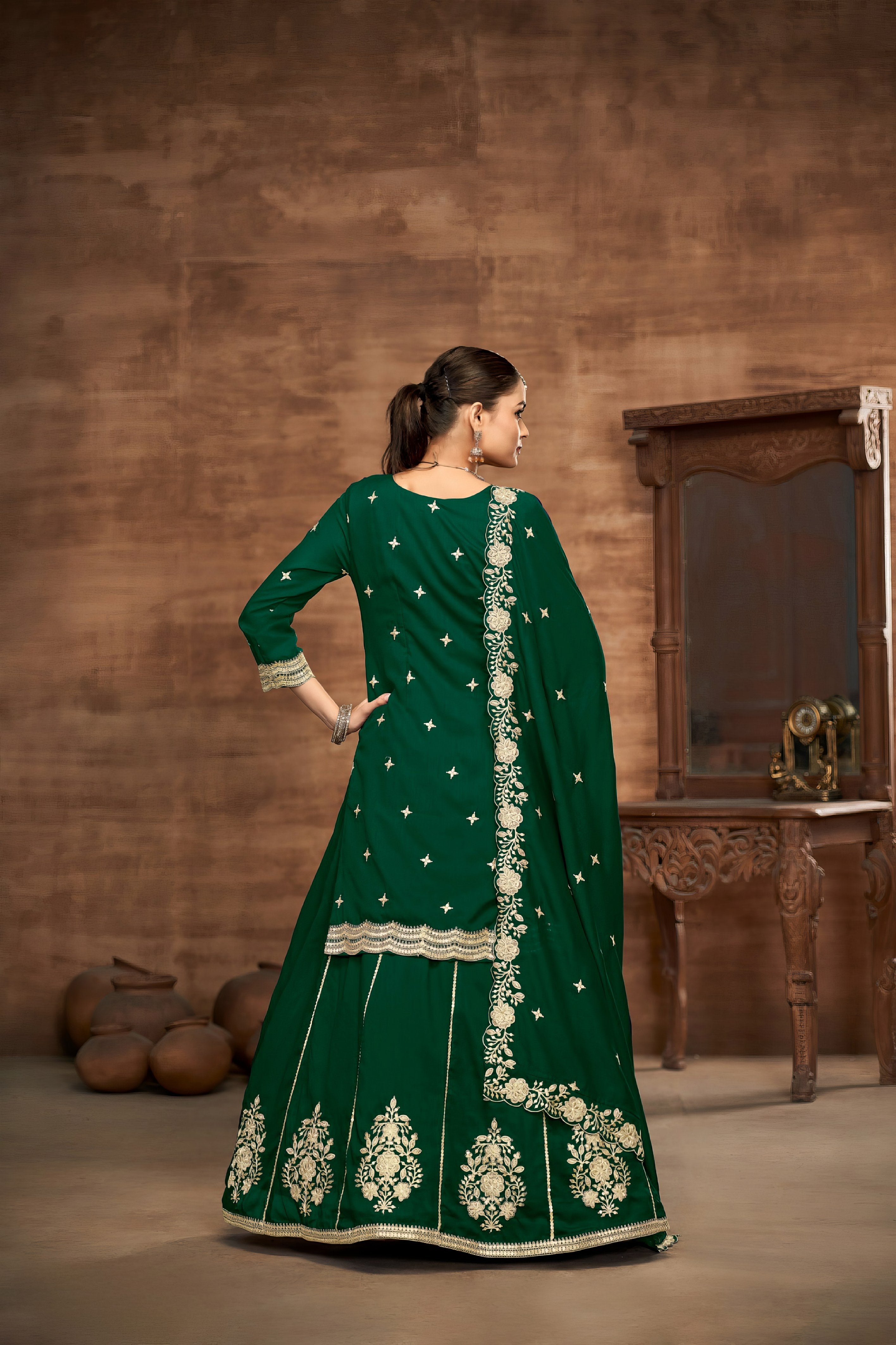 This fully stitched lehenga set is crafted in rich vichitra silk, known for its subtle sheen and smooth drape. The top features elegant embroidery work that enhances its festive appeal, while the flared lehenga offers a graceful silhouette with comfortable movement. Completing the look is a matching vichitra silk dupatta with embroidered borders, making it a perfect choice for celebratory occasions.