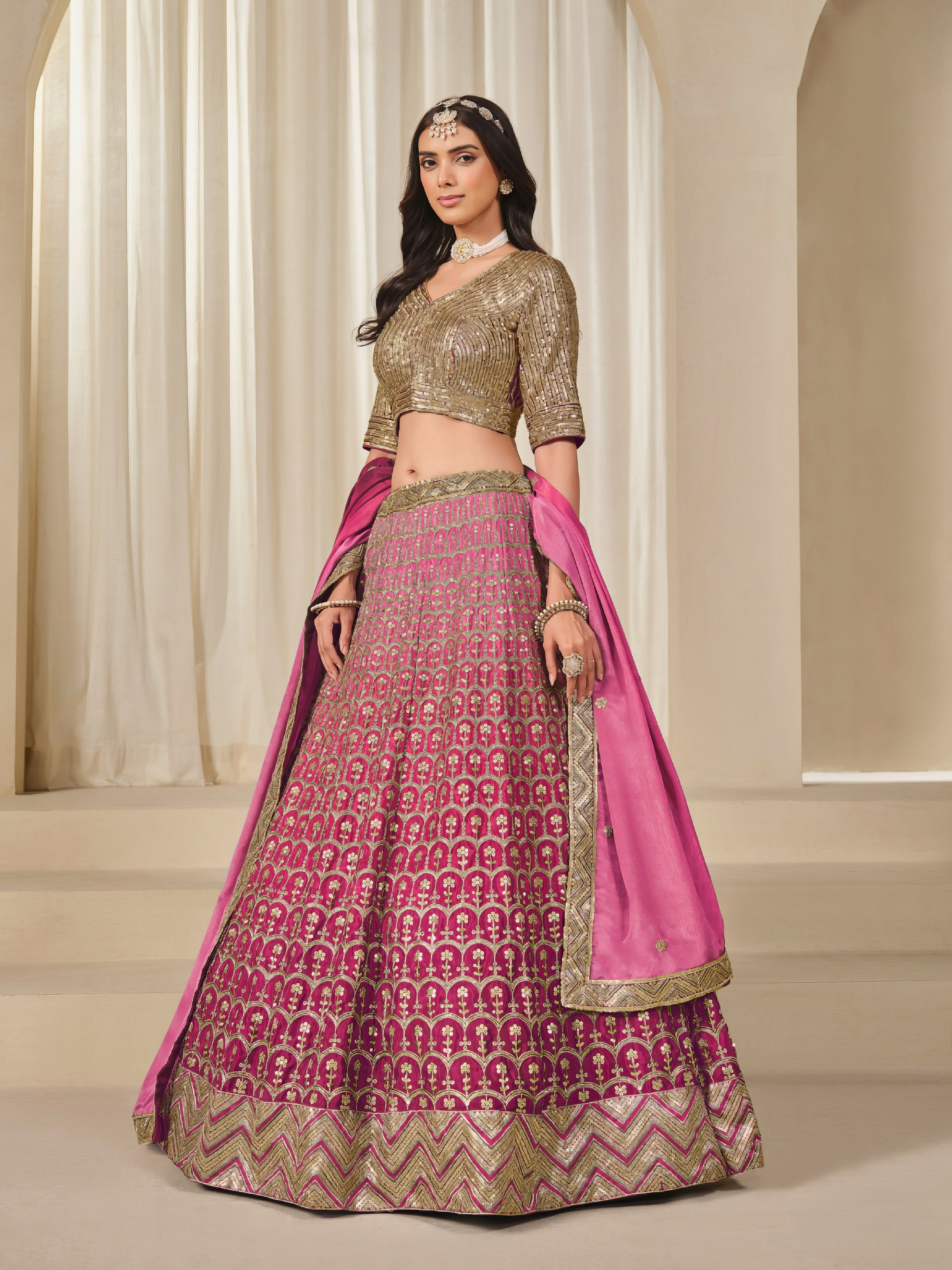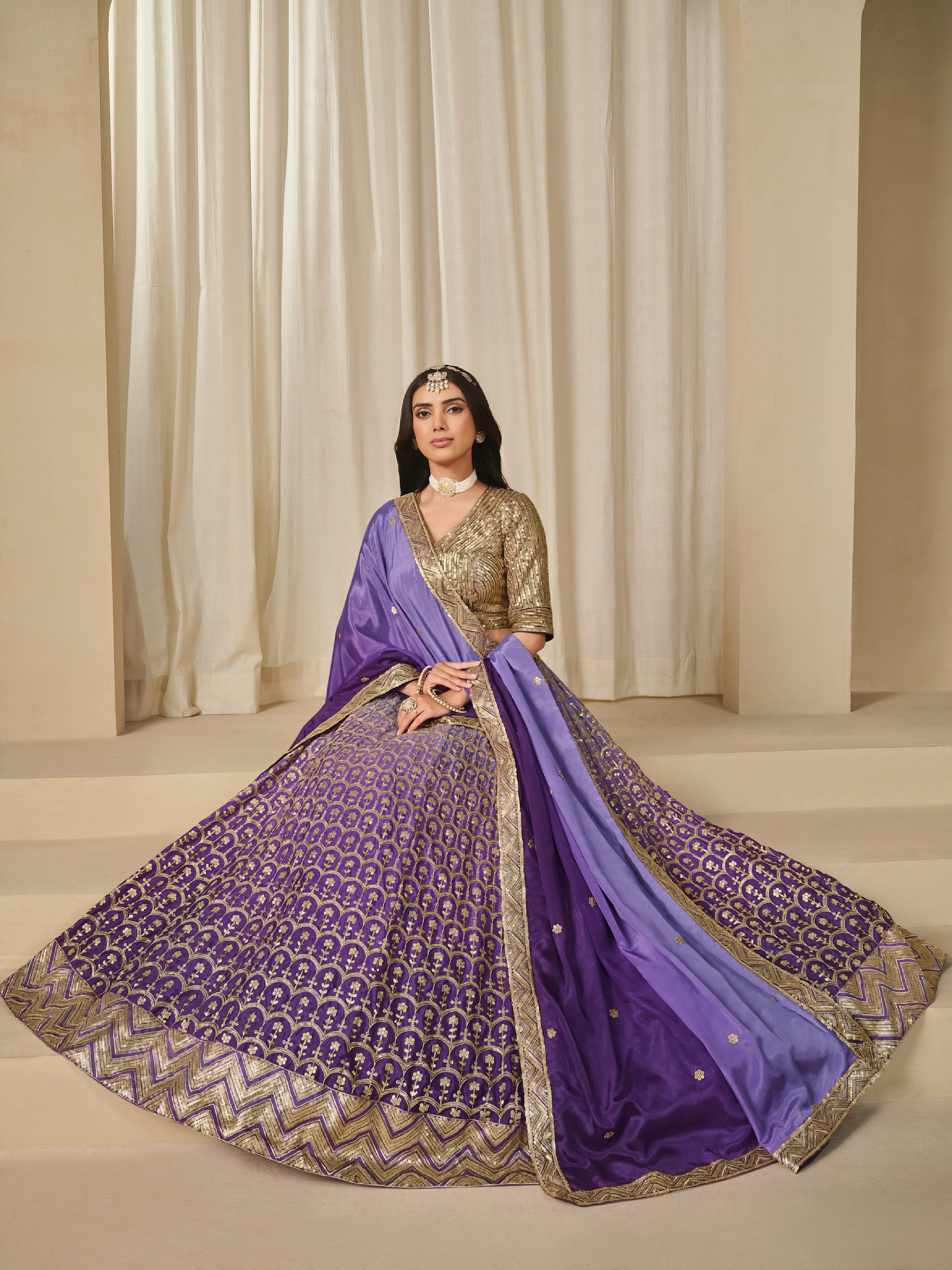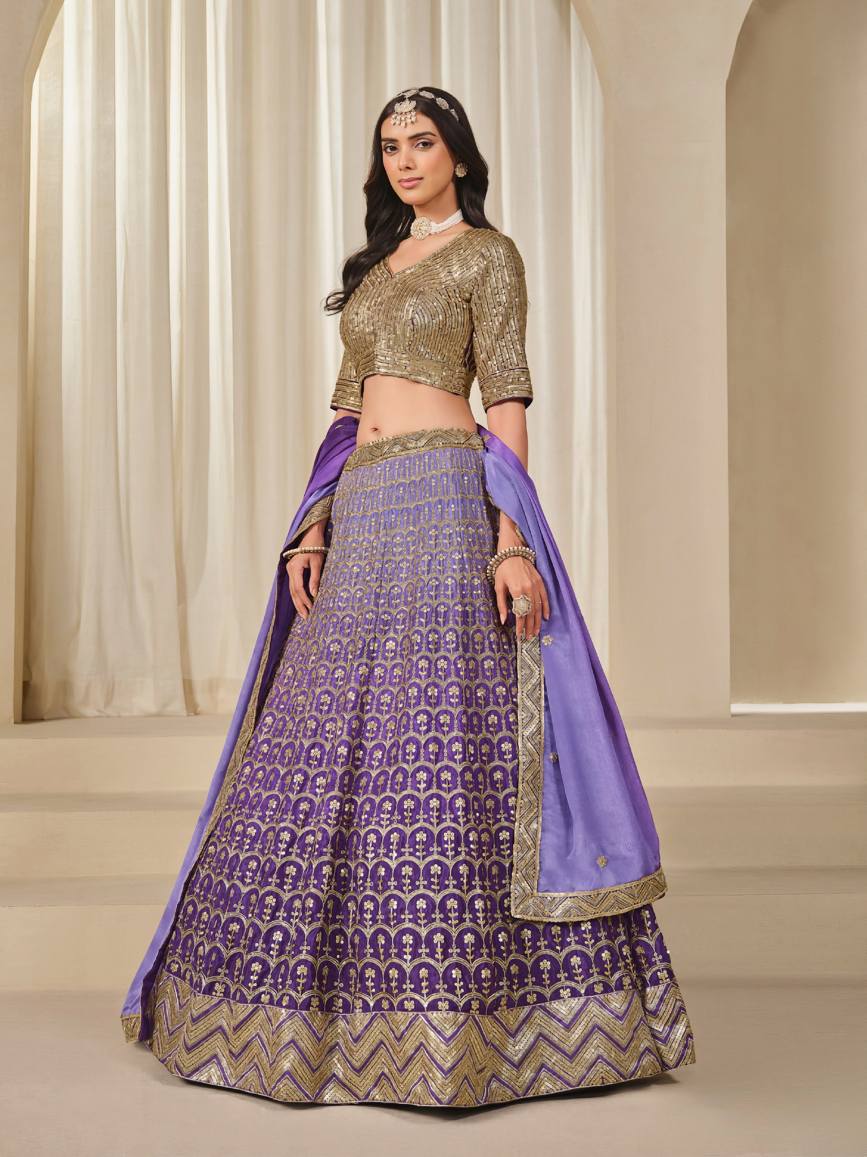 This fully stitched lehenga choli set is crafted from premium chinon silk, offering a soft, fluid drape and elegant finish. The choli is designed with refined embroidery that enhances its festive appeal, while the flared lehenga adds graceful movement and charm. A matching embroidered chinon dupatta completes the look, making this set a standout choice for traditional occasions and celebrations.