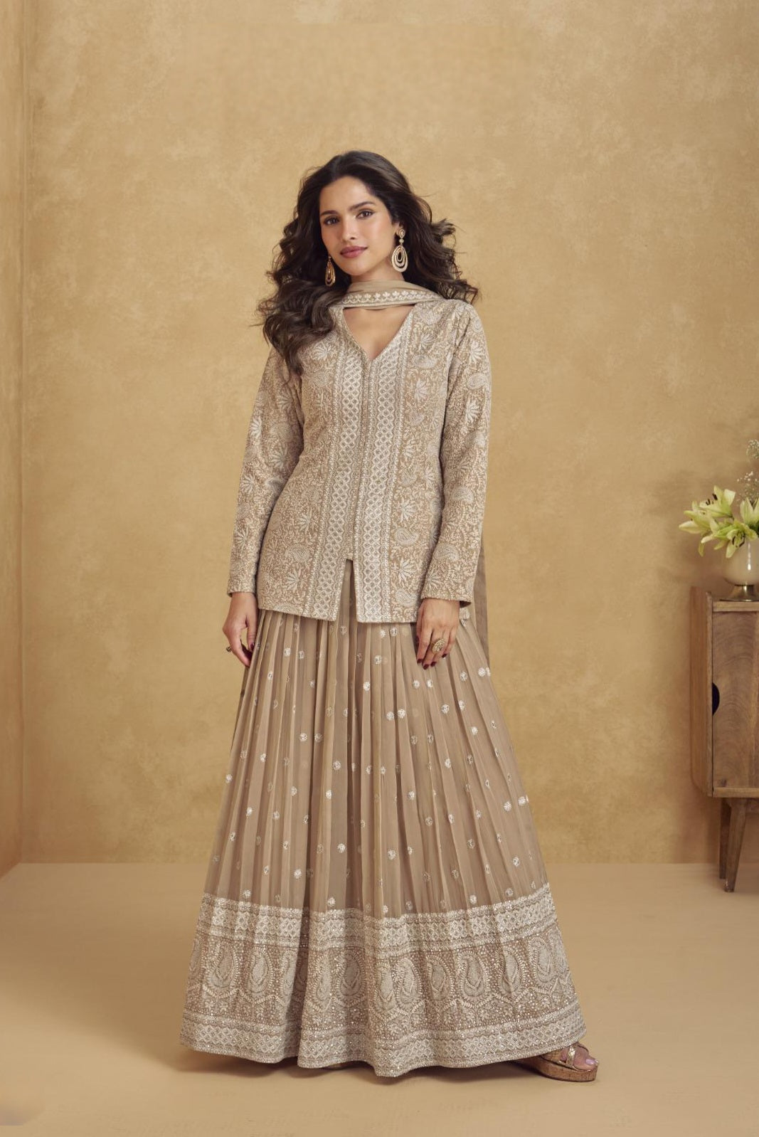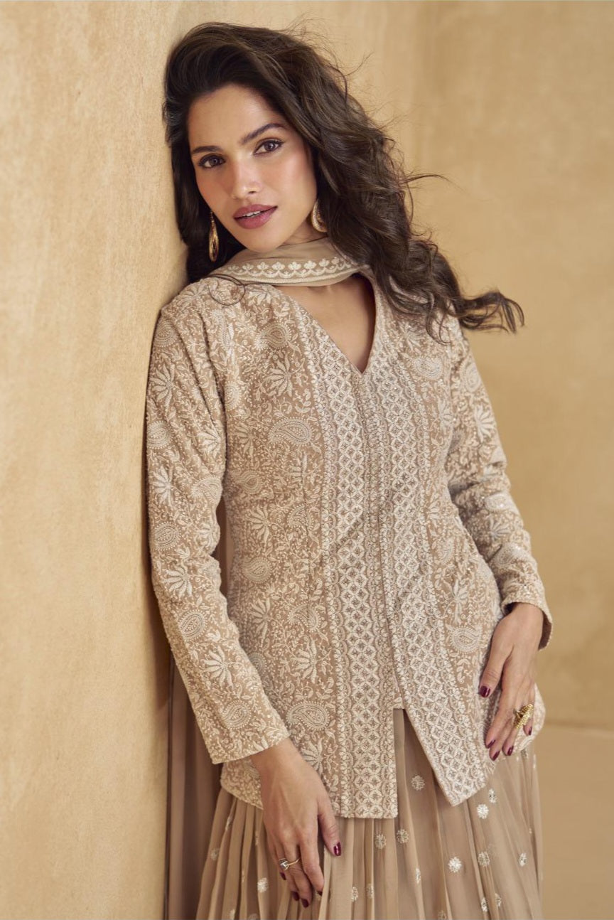 Designed in matching Real Georgette, the sharara flows effortlessly, offering comfort and dramatic flair in every step.