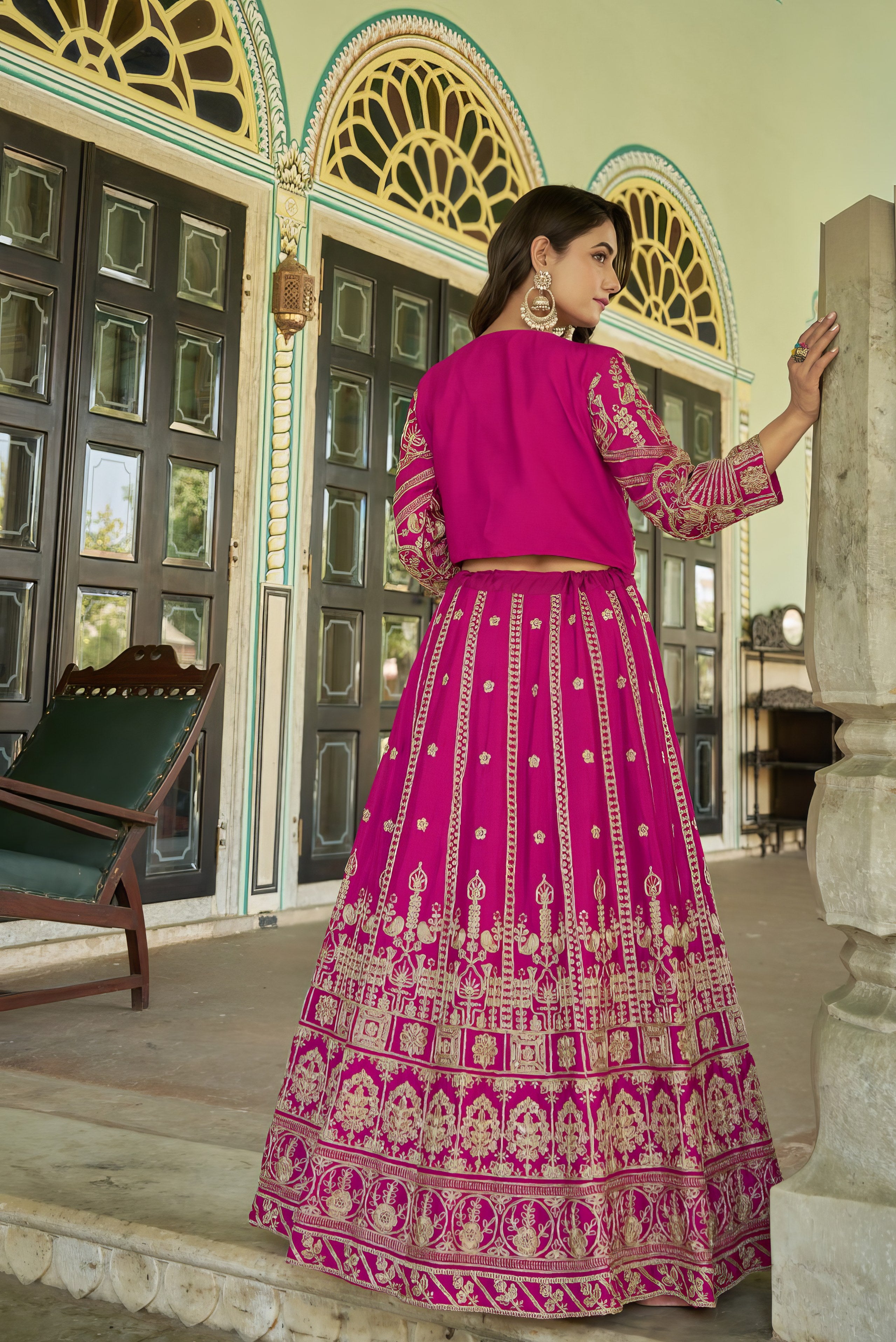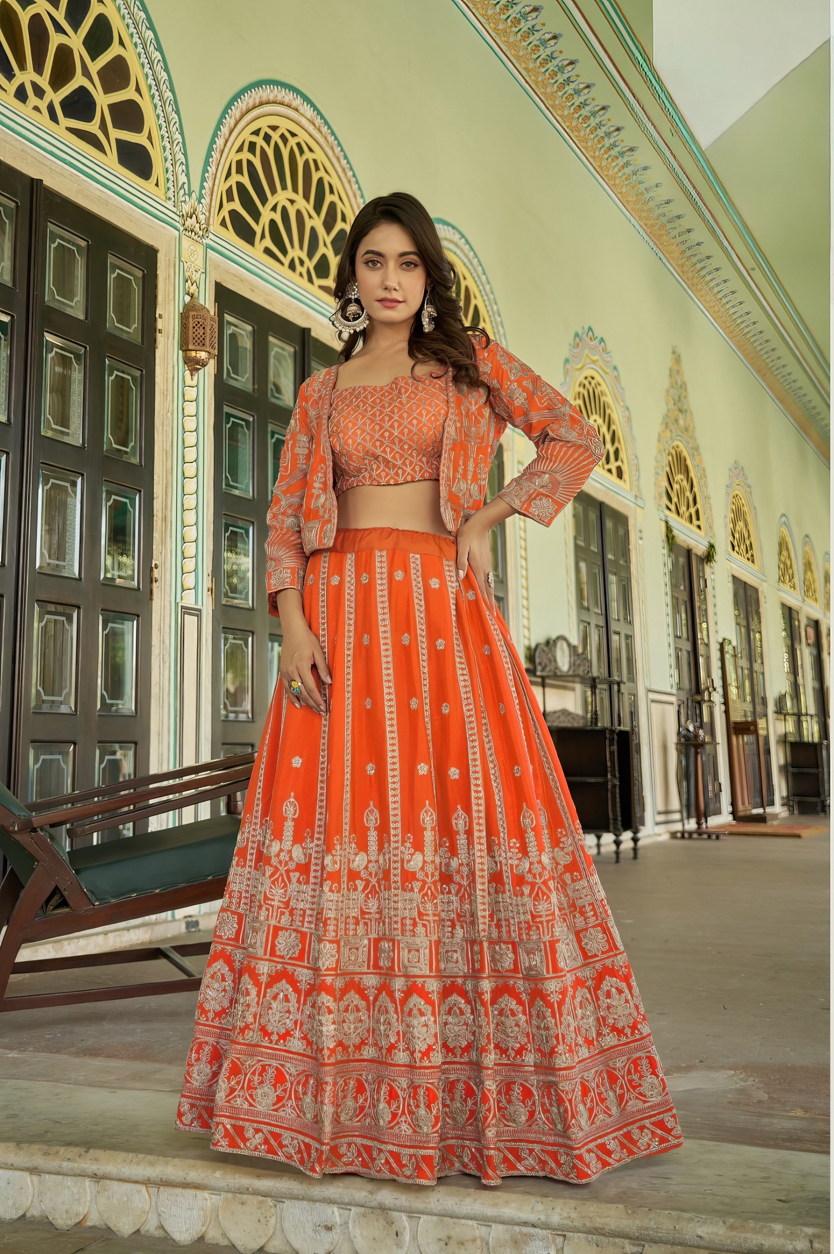 A regal blend of tradition and trend, this embroidered Chinon lehenga set is perfect for modern celebrations with timeless flair.