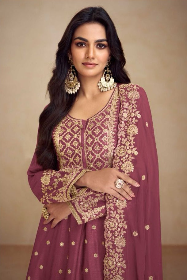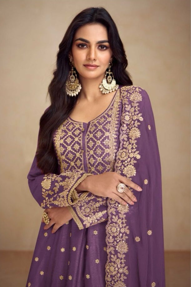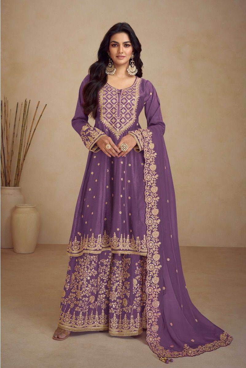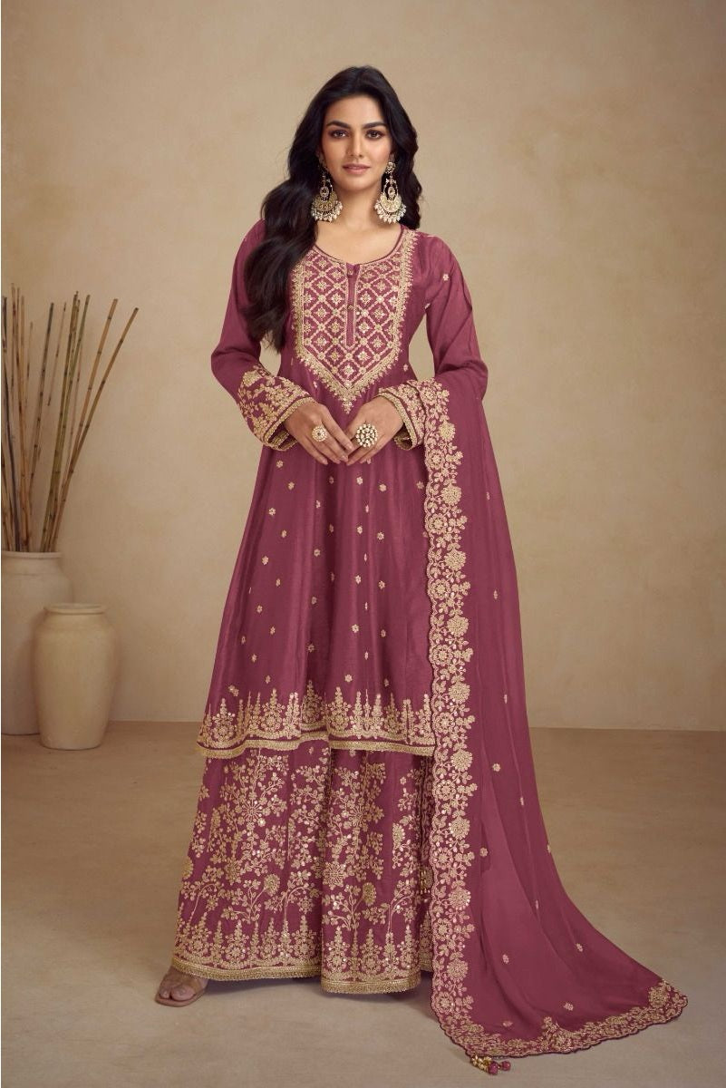 Sharara: The Free Size Sharara in matching Premium Fiber Chinon mirrors the top with digital print and embroidery on both front & back, creating a rich and coordinated look.