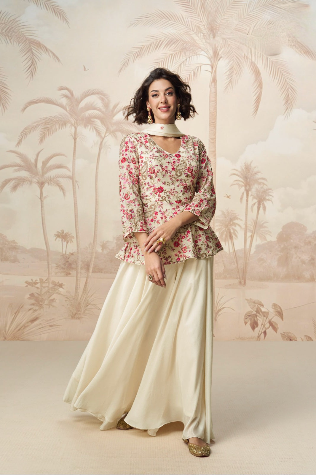 Sharara: The Free Size Sharara in matching Premium Fiber Chinon mirrors the top with digital print and embroidery on both front & back, creating a rich and coordinated look.