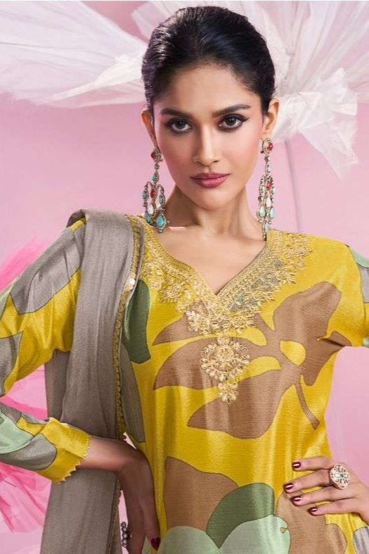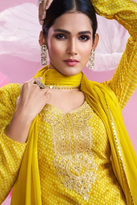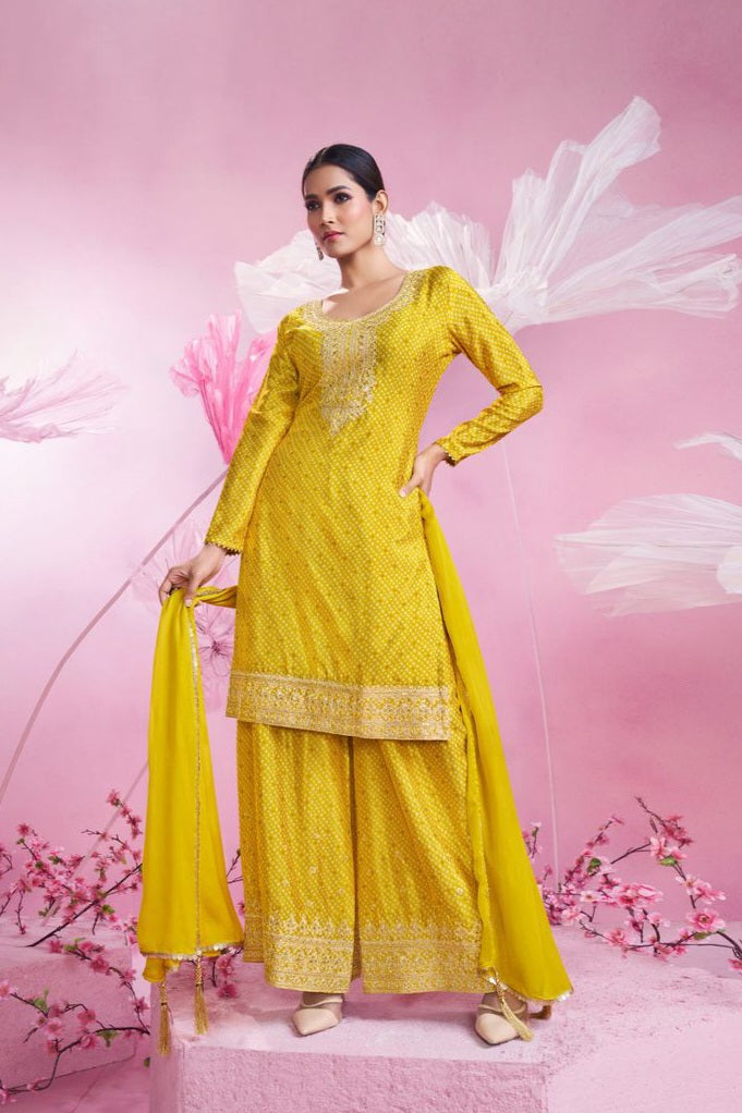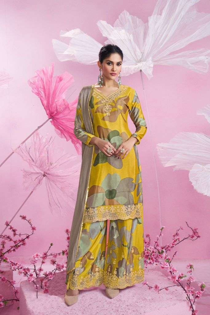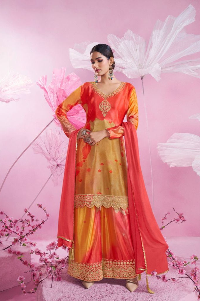Sharara: The Free Size Sharara in matching Premium Fiber Chinon mirrors the top with digital print and embroidery on both front & back, creating a rich and coordinated look.