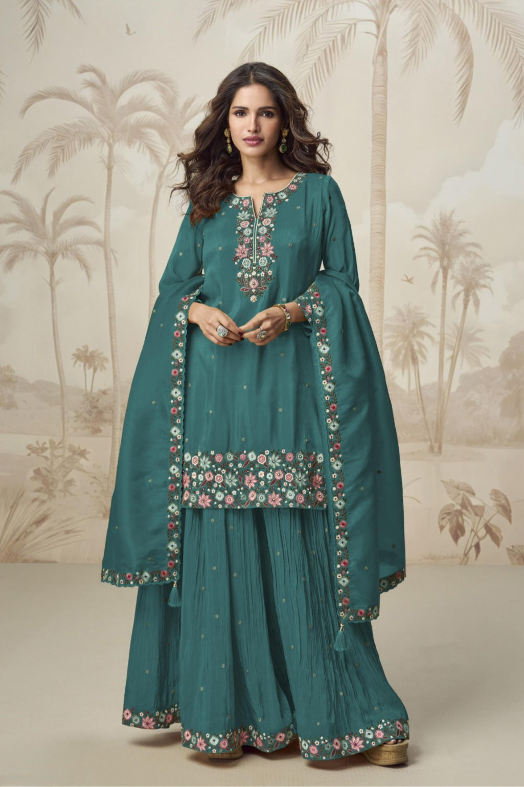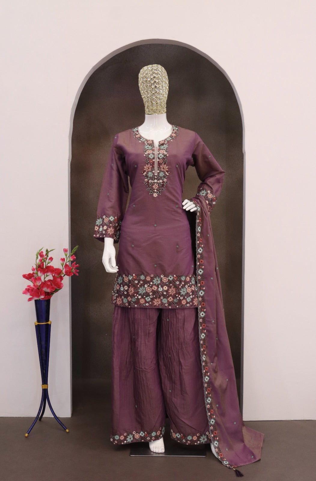 Experience understated luxury with Chinon Essence, a coordinated three-piece ensemble made entirely from genuine Real Chinon fabric. With its natural sheen, soft fall, and graceful drape, this set brings timeless sophistication to festive dressing.