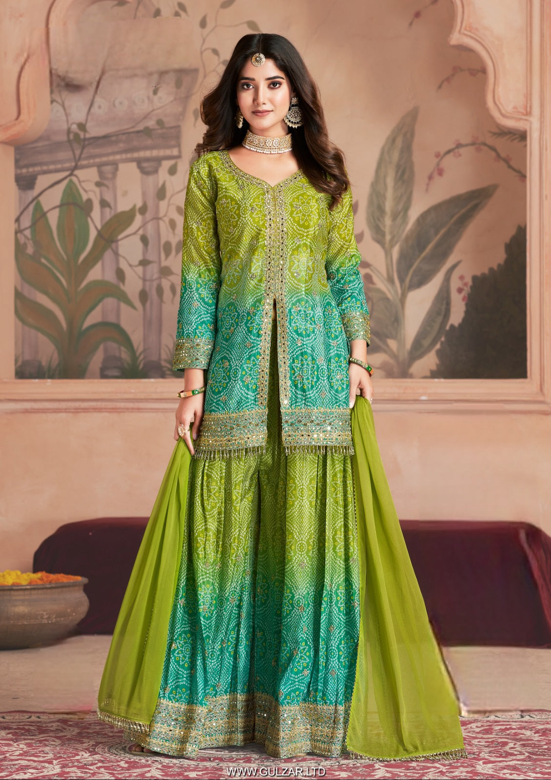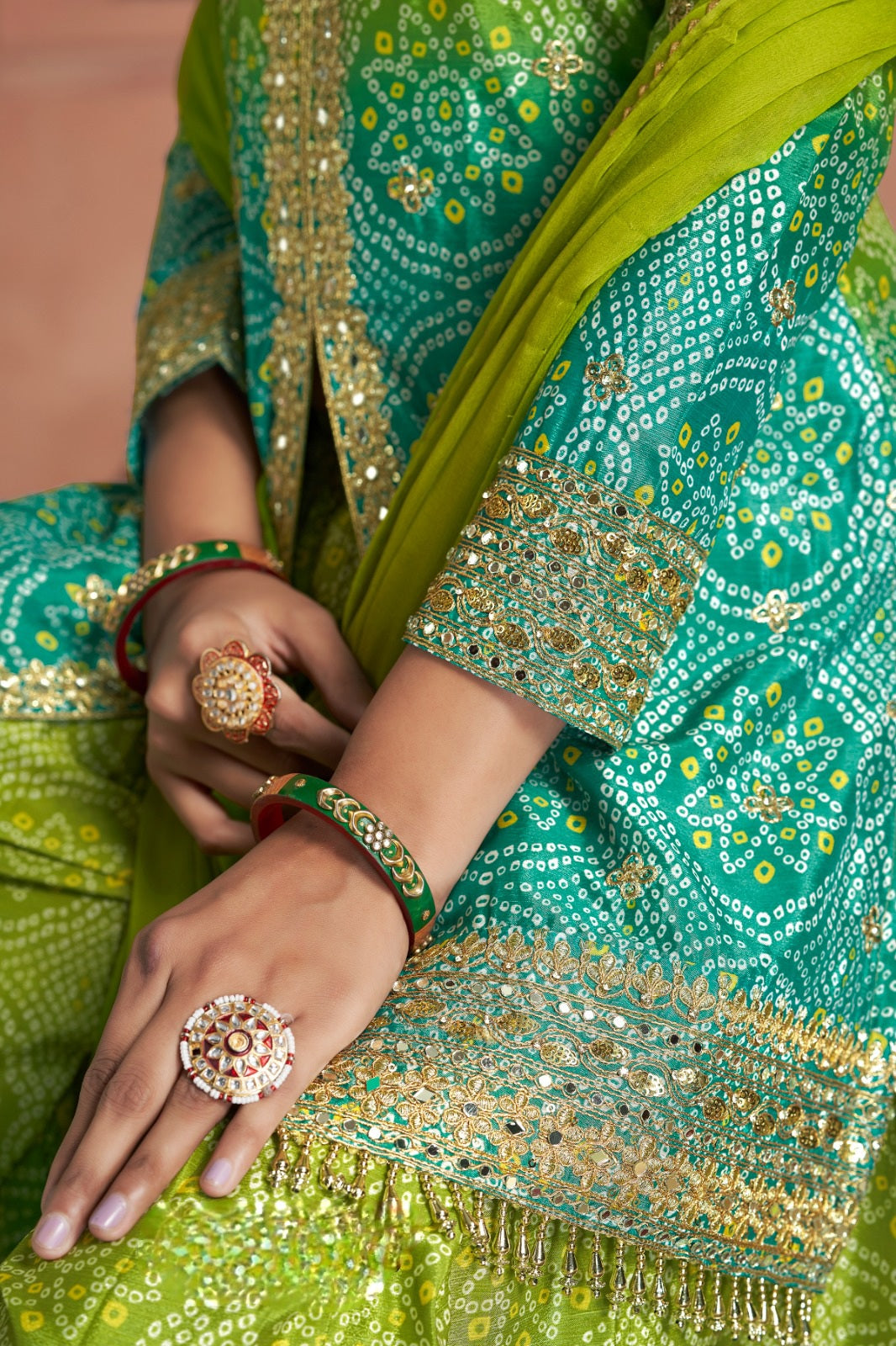 A fusion of heritage and sparkle—this Bandhani digital print Chinon set is elevated with dabka, sequins, and handcrafted jharkan & mirror detailing for a truly festive ensemble.