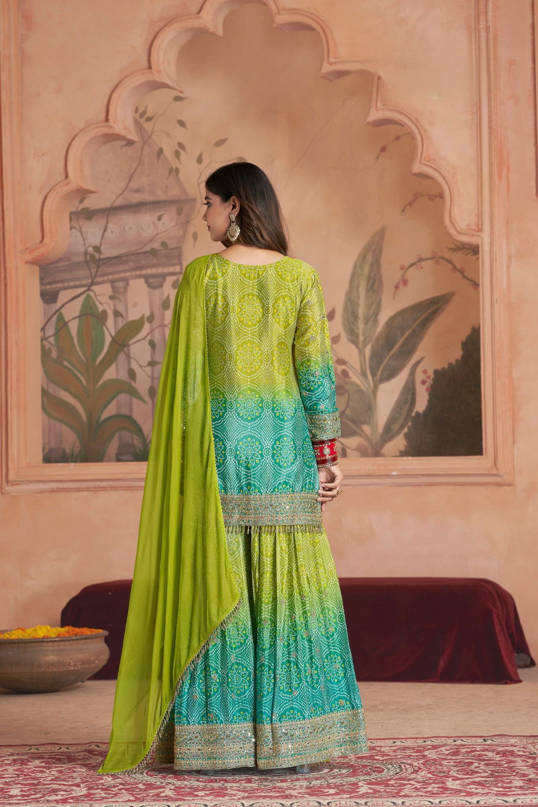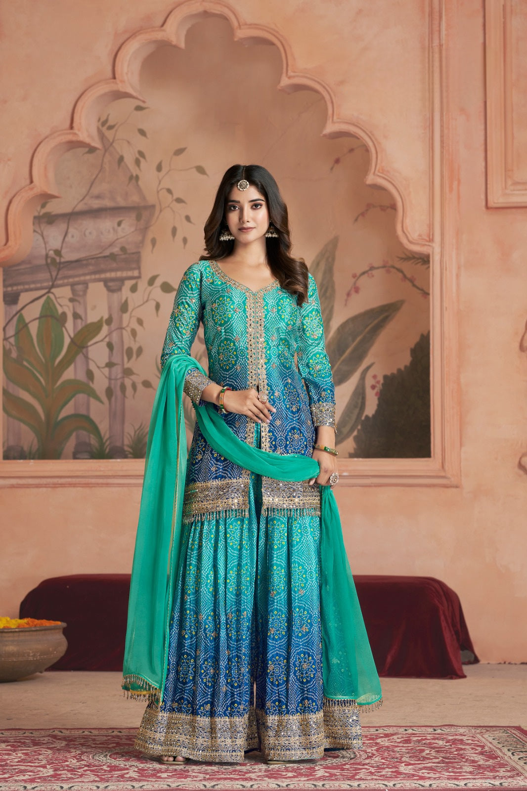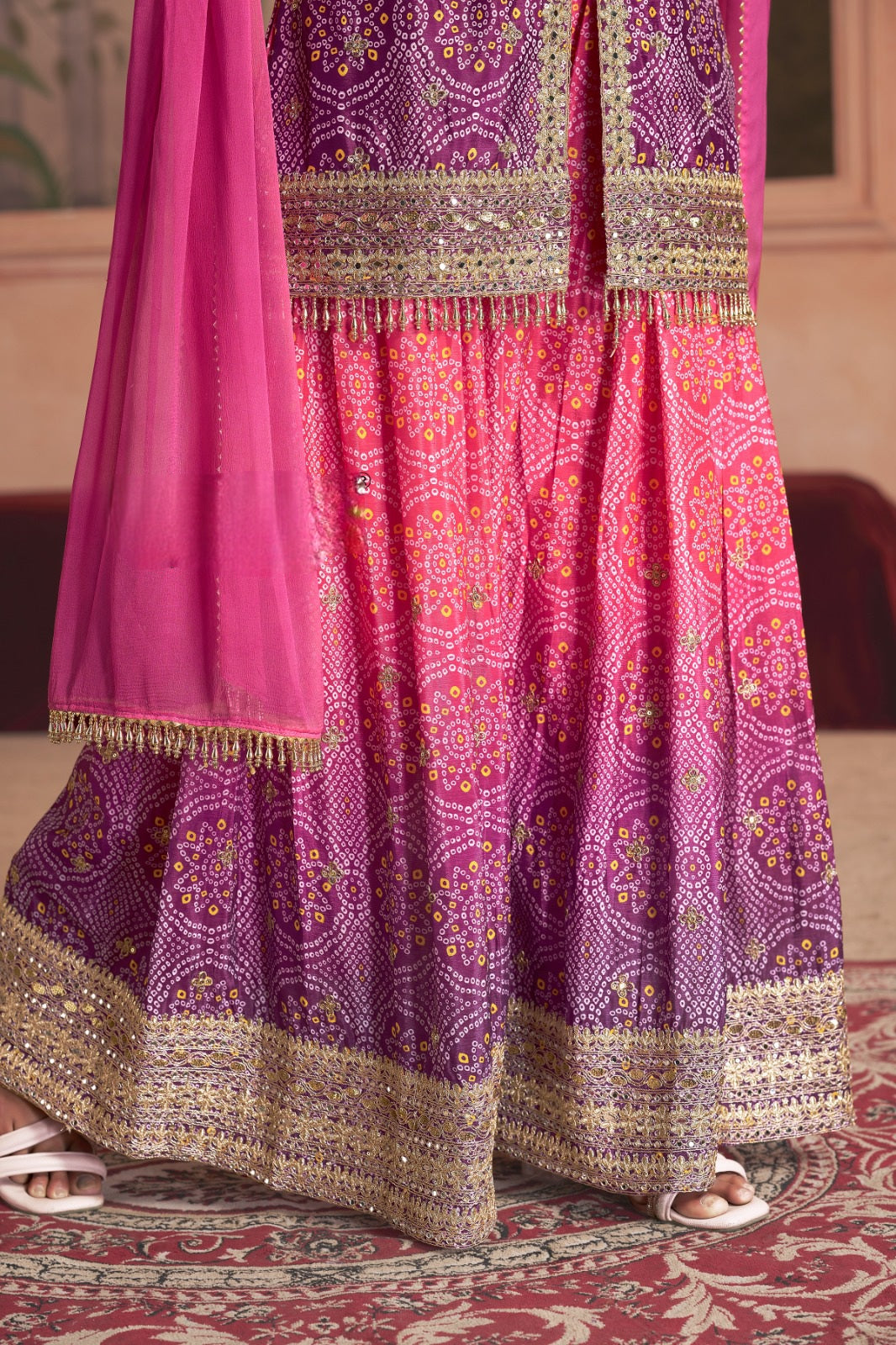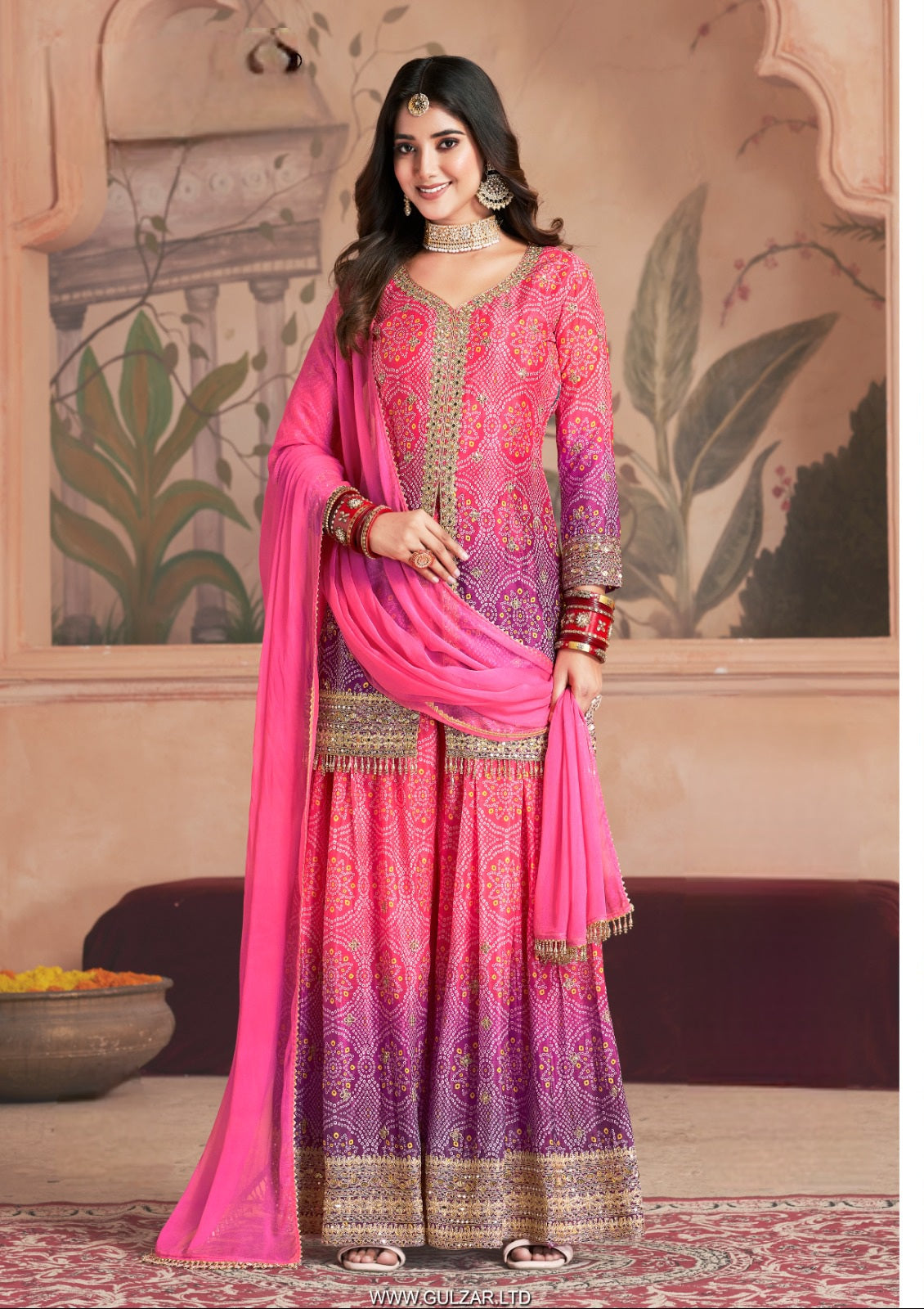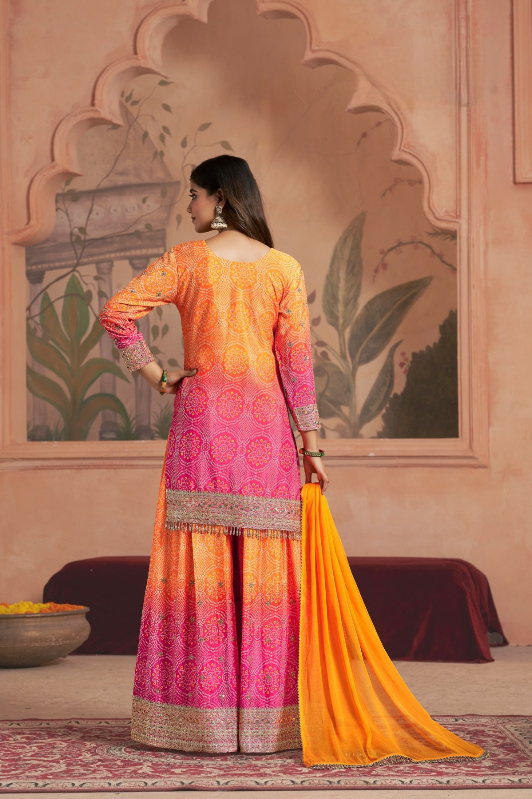 • 1 Sharara Plazo (Premium Chinon – Bandhani Print with Front & Back Work – Free Size)