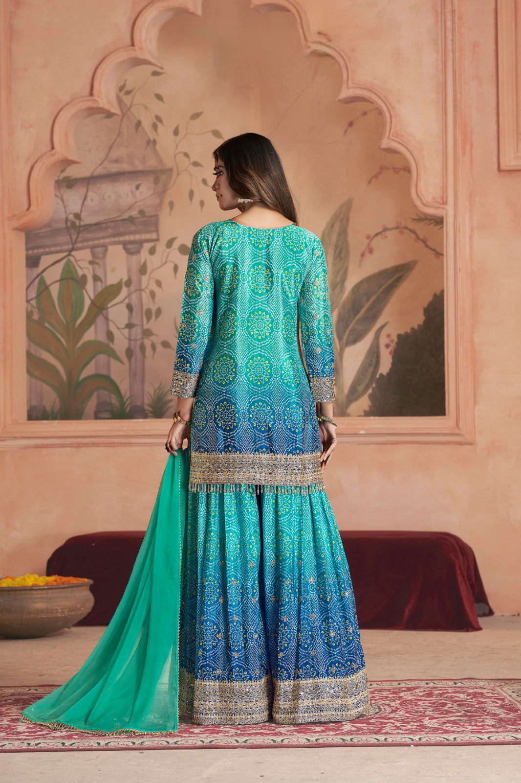 Pant: Flowing Sharara-style Plazo made from the same Premium Feel Chinon with Bandhani digital print, also features front & back embroidery, creating a beautifully balanced silhouette. Comes in Free Size.