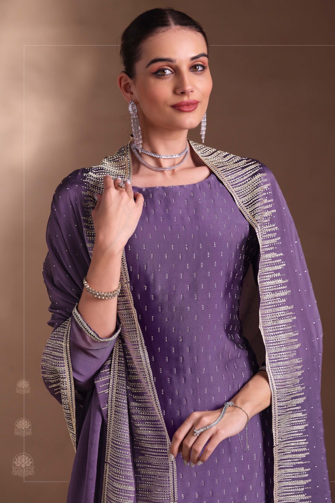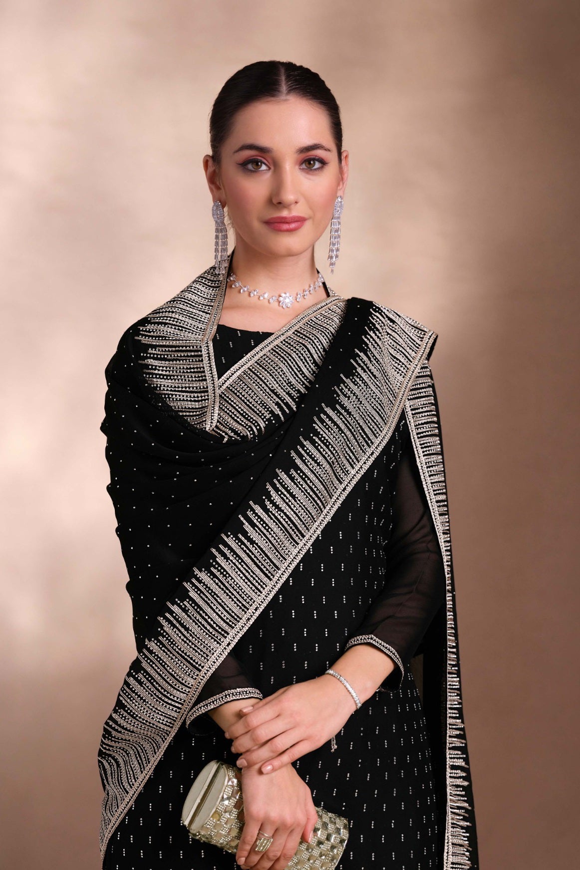 Top: Crafted in 2-Tone Catonic Georgette, the top features exquisite embroidery enhanced with delicate Swarovski detailing, offering a beautiful play of texture and shimmer.