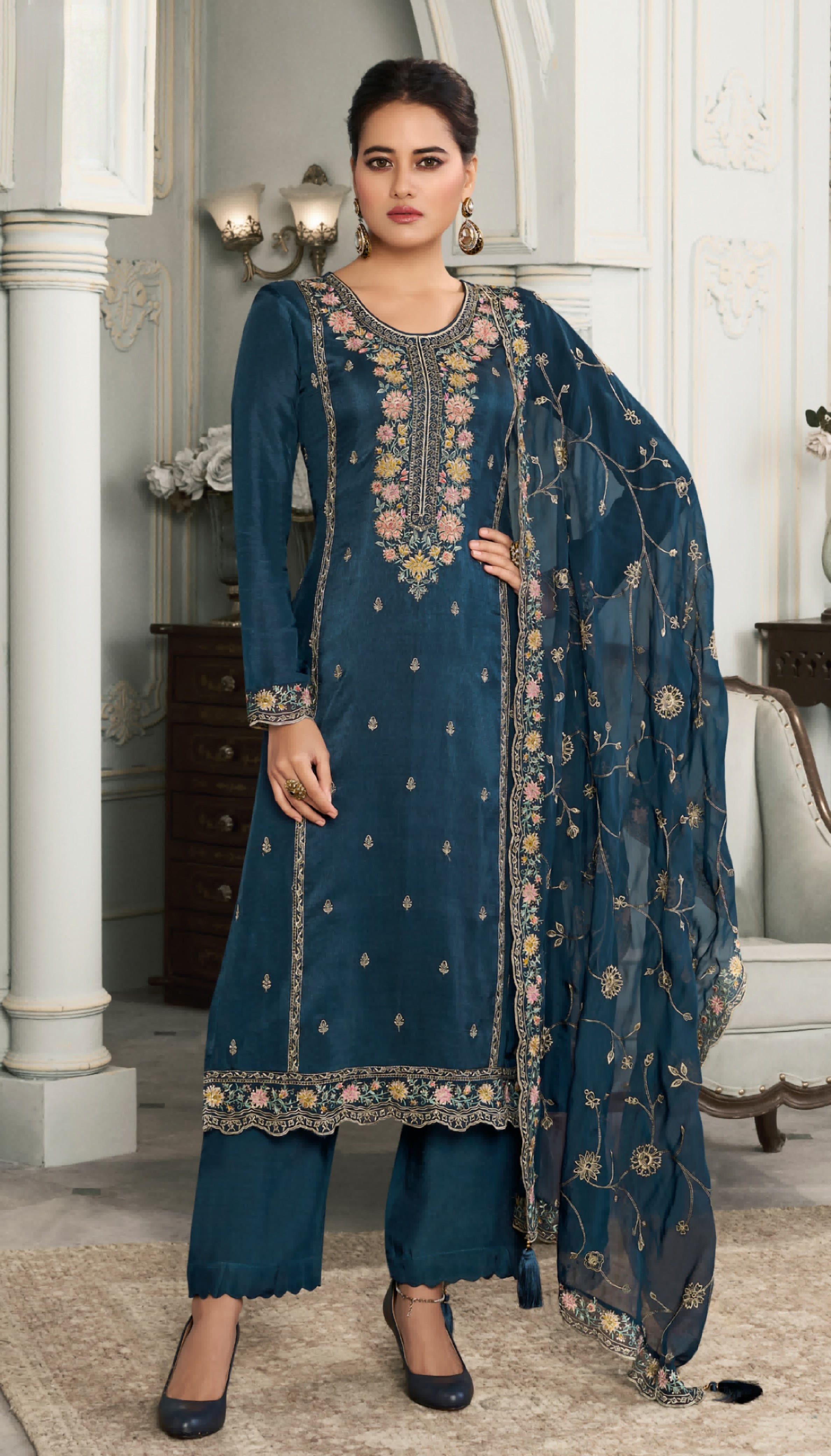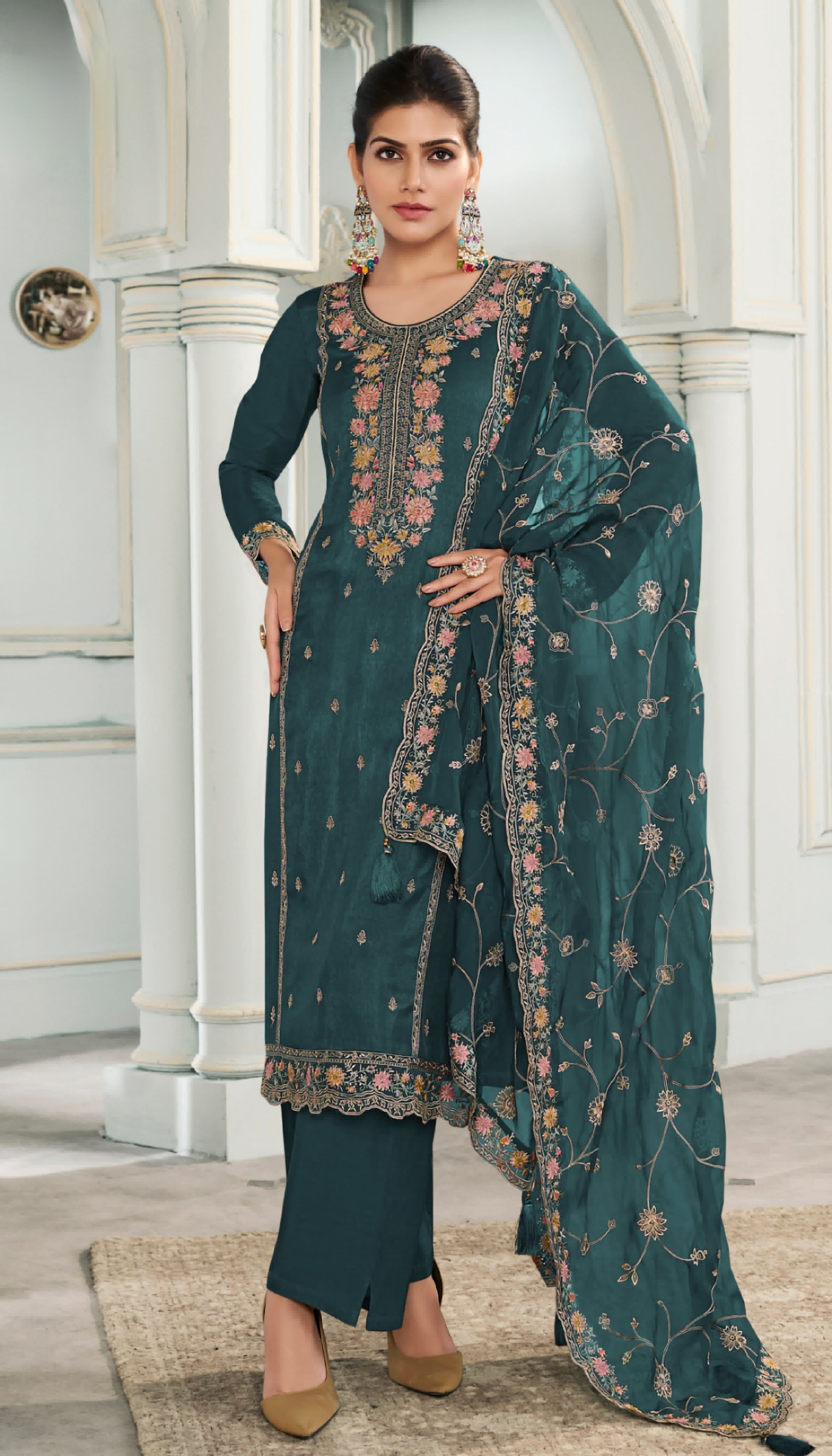 An elegant symphony of color and craft — this multithread embroidered suit in luxurious Moonga Silk is made to stand out with grace and sophistication.