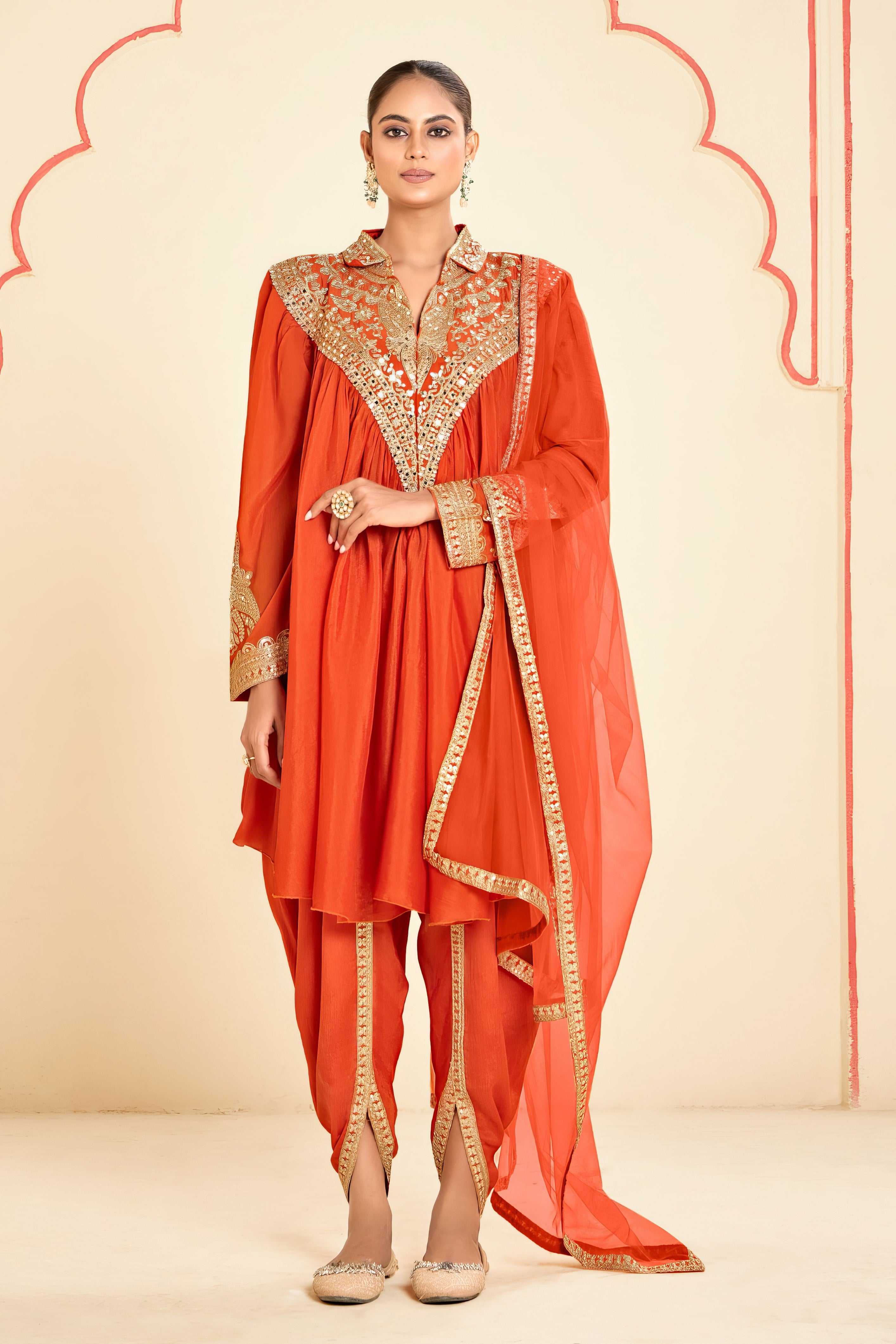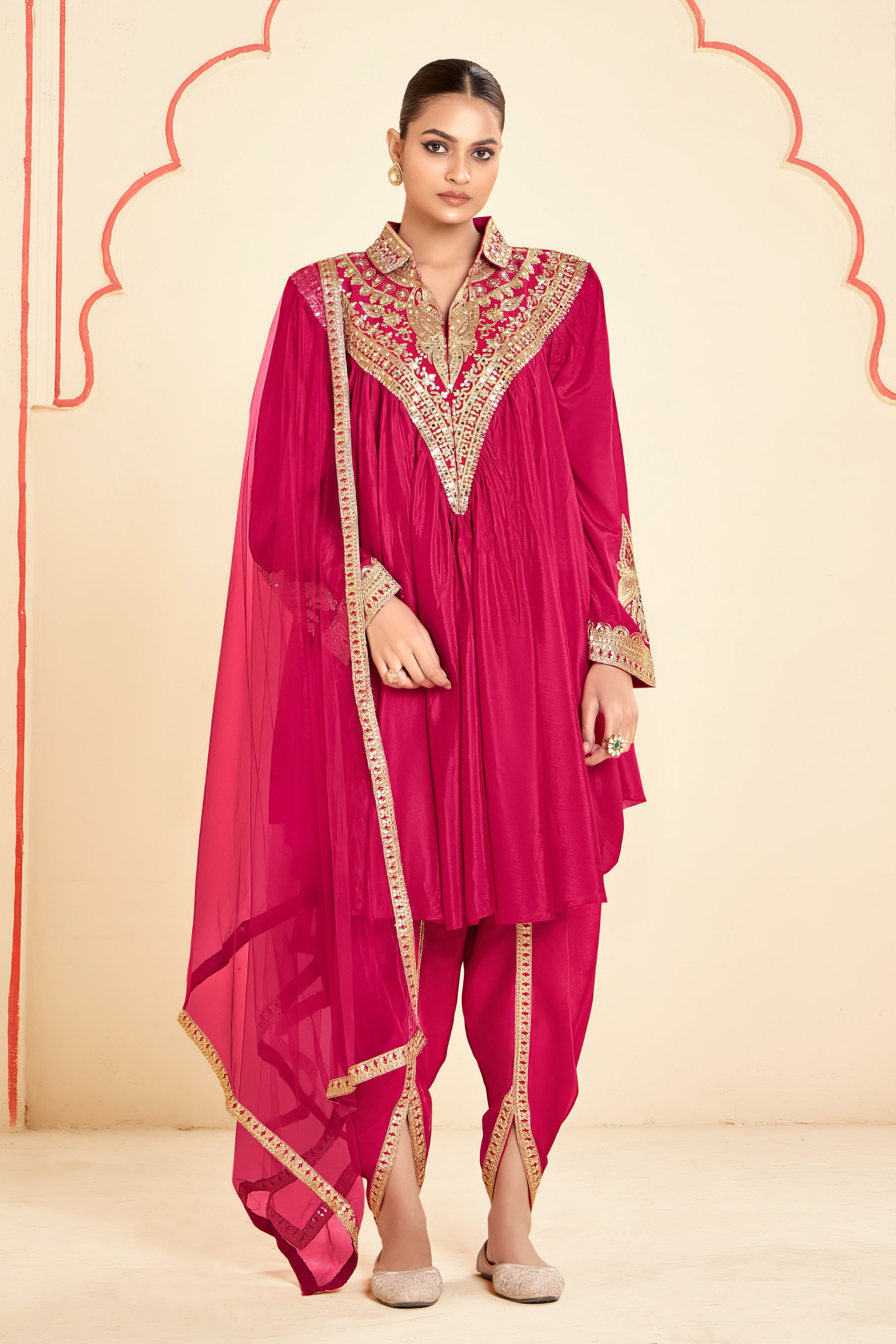 This coordinated set features a digitally printed Real Chinon top and plazoo that radiate modern elegance. The lightweight Real Chinon dupatta adds a graceful flow to the ensemble, making it perfect for festive outings and intimate gatherings.