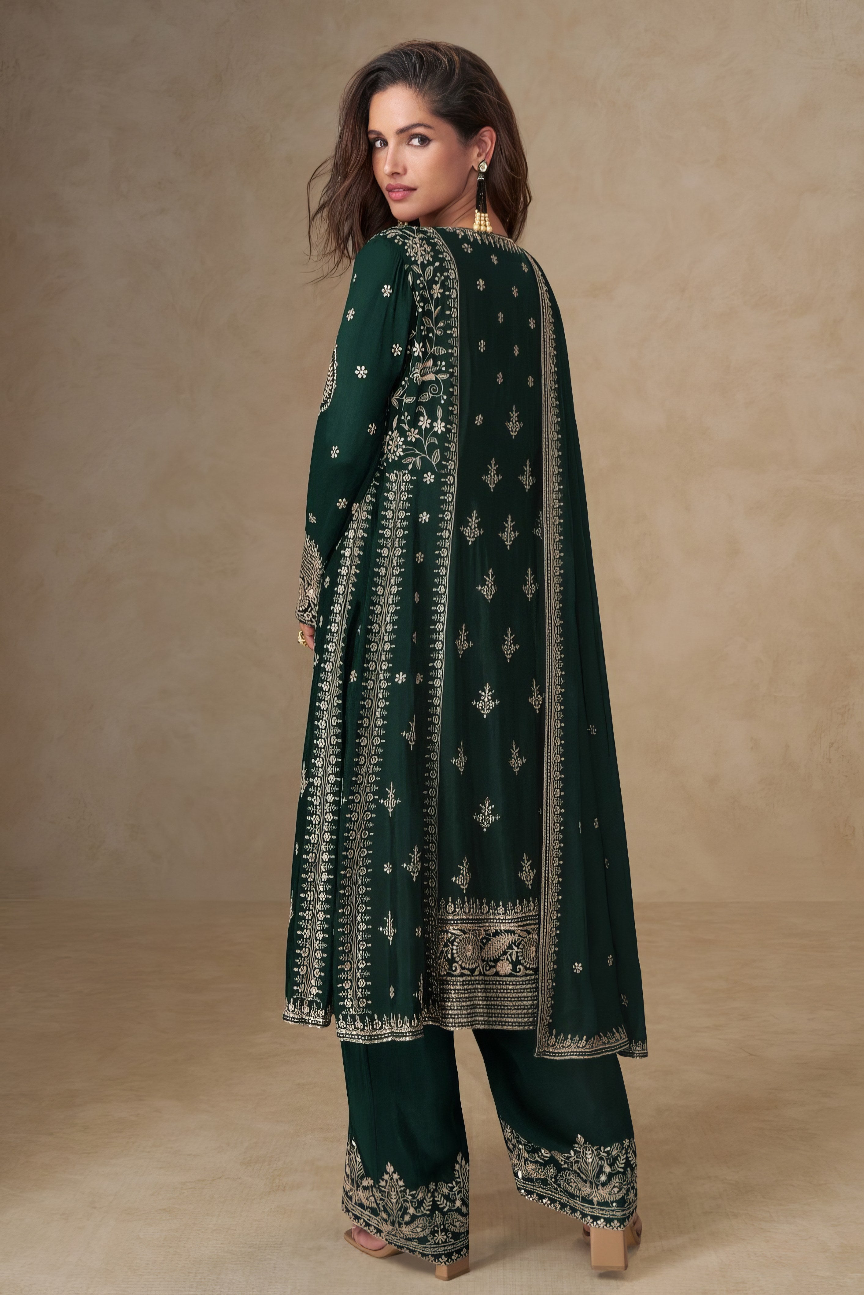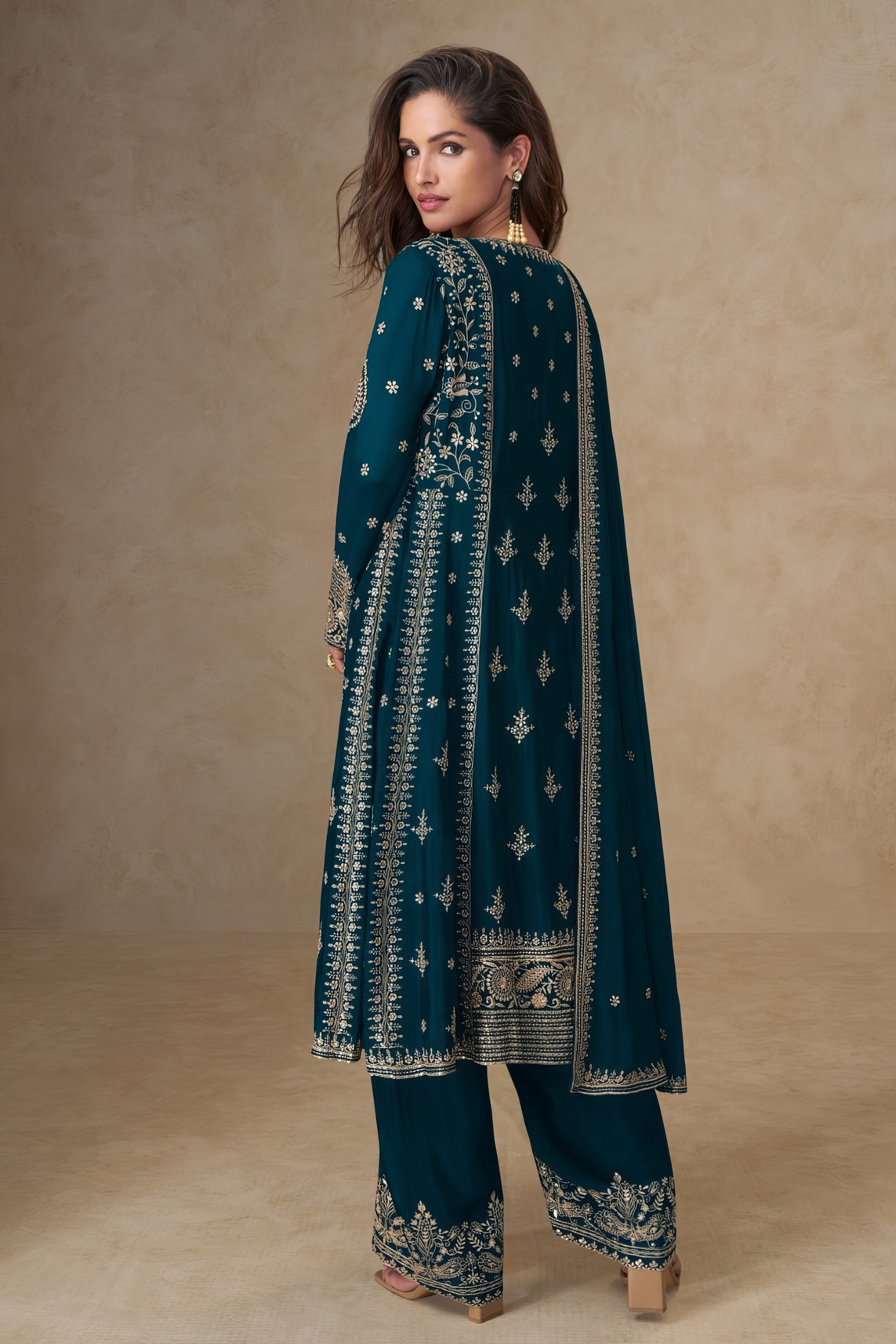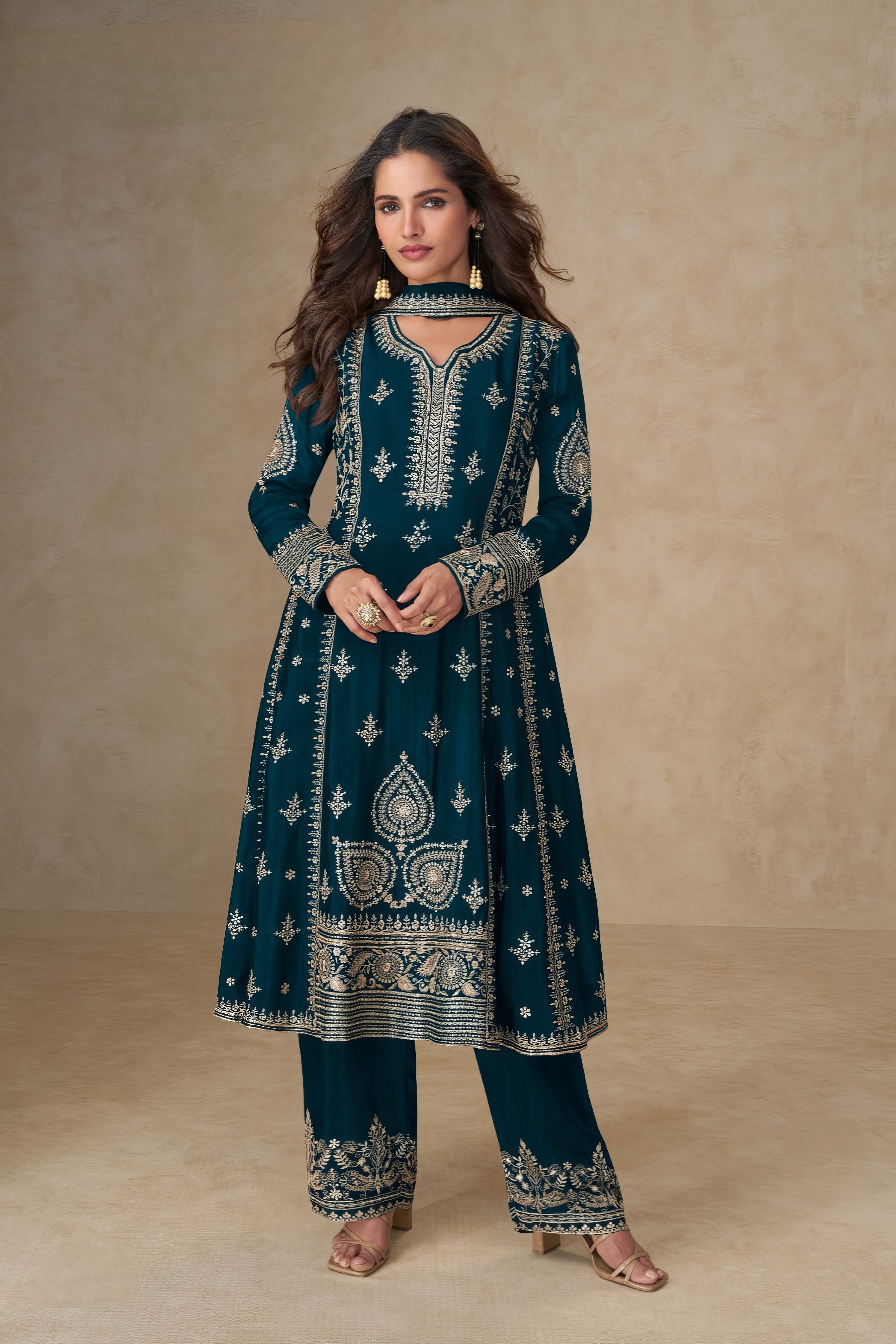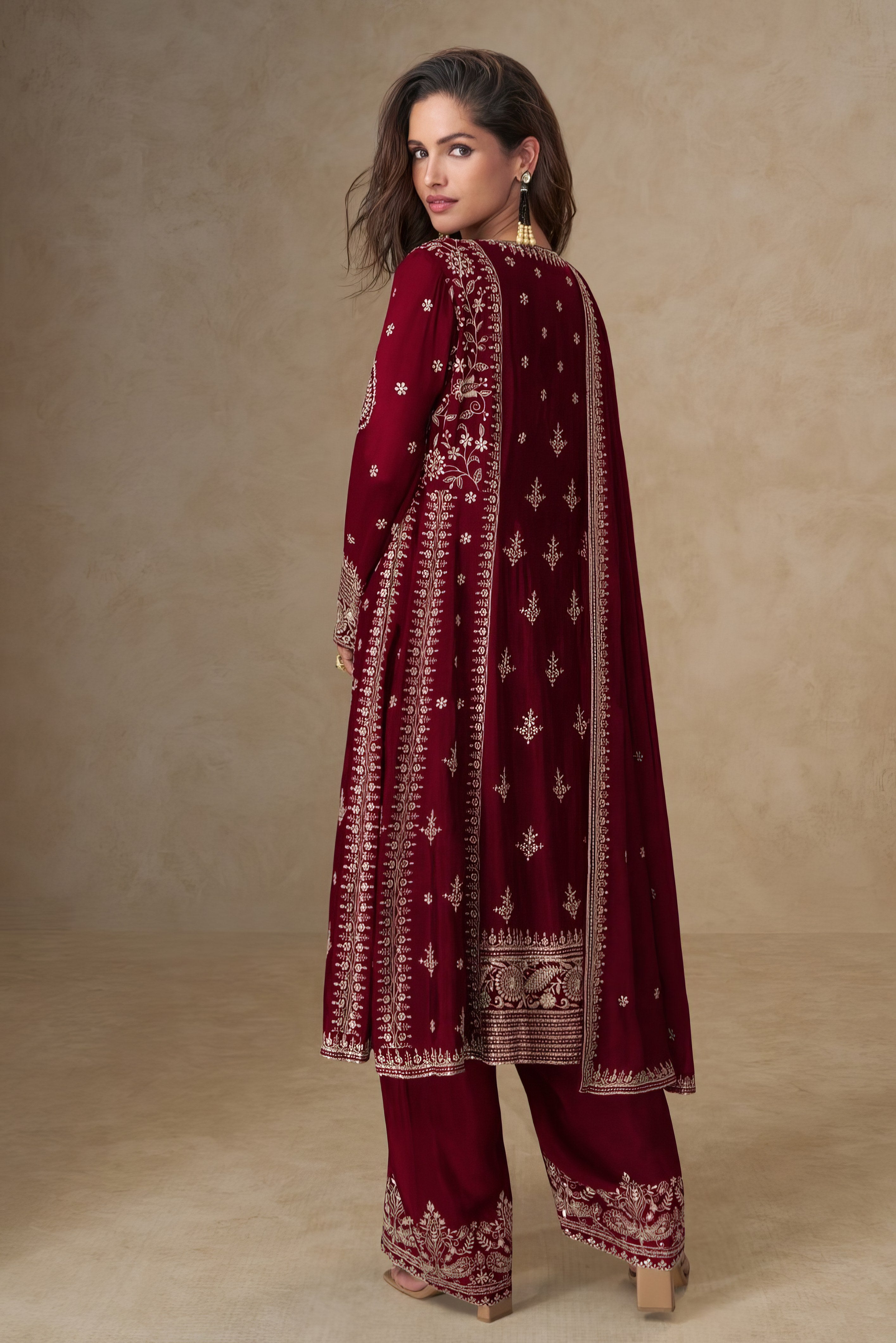 Crafted in luxurious premium Chinon silk, this elegant set features a coordinated top and plazzo that offer both comfort and sophistication. The matching dupatta in the same fabric adds fluidity and charm, making it a versatile pick for festive and semi-formal occasions.