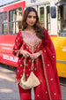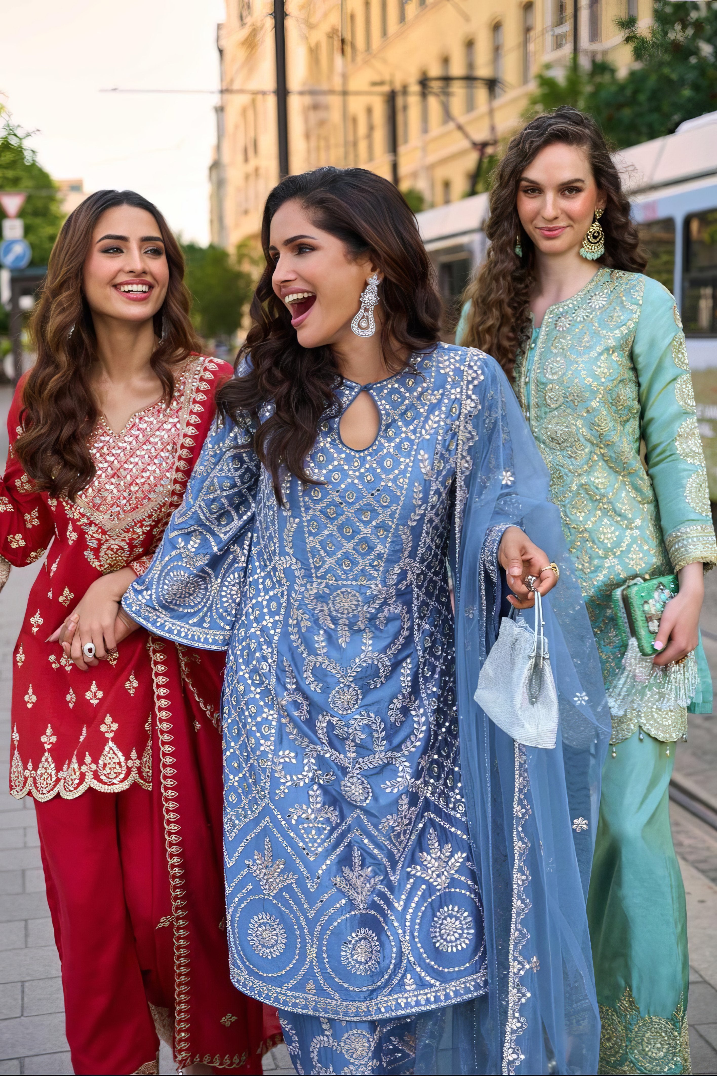 This exquisite ensemble is crafted from premium Simar Silk, featuring a heavily embroidered top enhanced with intricate hand-embellished mirror work. The embroidered plazzo pant in Simar Silk adds modern elegance while maintaining traditional charm. Completing the outfit is a richly embroidered silk or organza dupatta, making this attire a perfect choice for grand occasions.