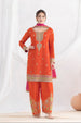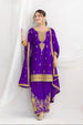 This elegant outfit features a premium Chinon kurti highlighted with delicate embroidery work on the sleeves and daman, adding a refined charm. It is paired with a traditional Farsi salwar adorned with graceful embroidery for a regal touch. The premium Chinon dupatta, finished with a 4-side zalar zari lace, enhances the richness of the ensemble. Intricate dabka dori, sequin, and handwork details further elevate its luxurious appeal.