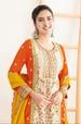 This luxurious set is crafted from the finest Chinnon fabric, adorned with intricate dabka dori and sequin embroidery, enhanced with delicate handmade mirror work. The top radiates elegance with its detailed craftsmanship, while the embroidered plazo ensures a graceful flow. The premium dupatta, finished with four-side embroidery lace, adds a regal charm, completing this timeless ensemble.