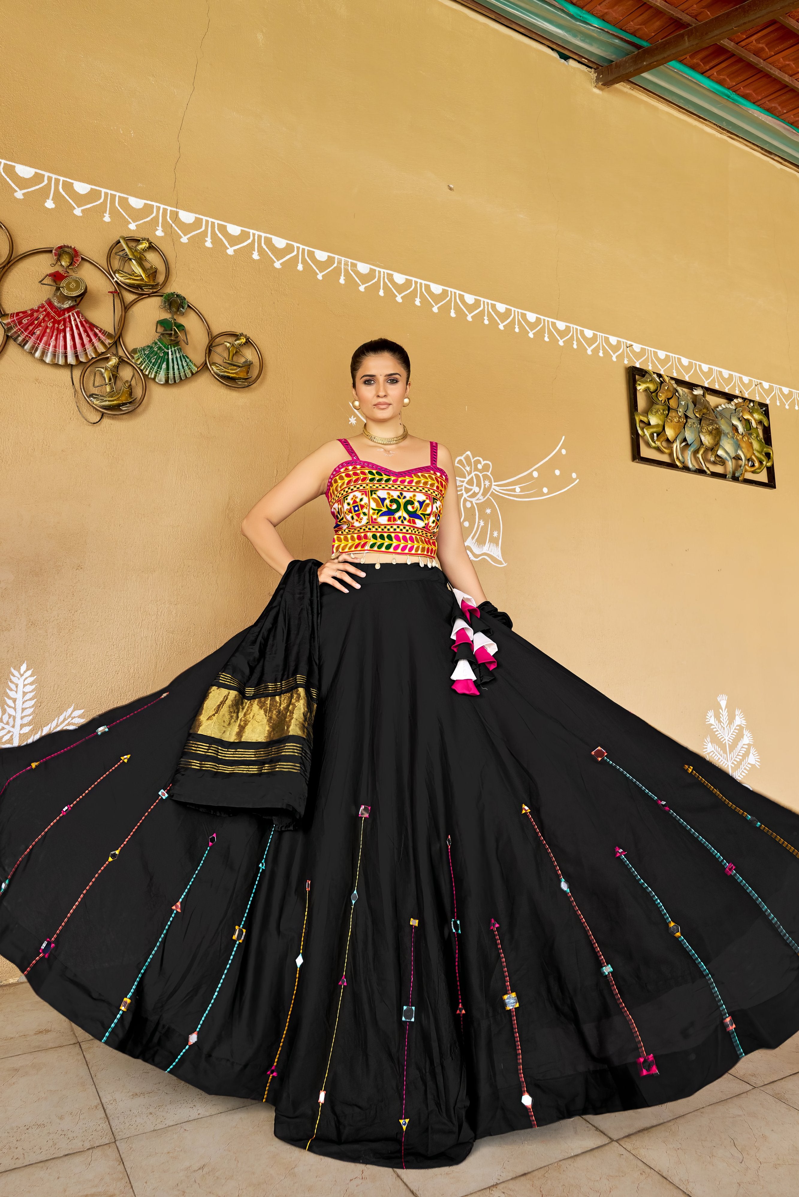 This exquisite lehenga set showcases authentic craftsmanship with a perfect fusion of tradition and elegance. The blouse is crafted in cotton fabric adorned with Kutchi handwork and original mirror embellishments. The lehenga, made in soft cotton, features Kali Mundi design with intricate mirror detailing, stitched with can-can, canvas, and a full inner for volume and structure. It comes with a micro cotton lining for comfort. The dupatta in luxurious Gaji silk is beautifully dyed with Lagadi Patta work, adding a regal charm. With a 6-meter flair and a length of 41–42 inches, this ensemble radiates grace and festive vibrance.
