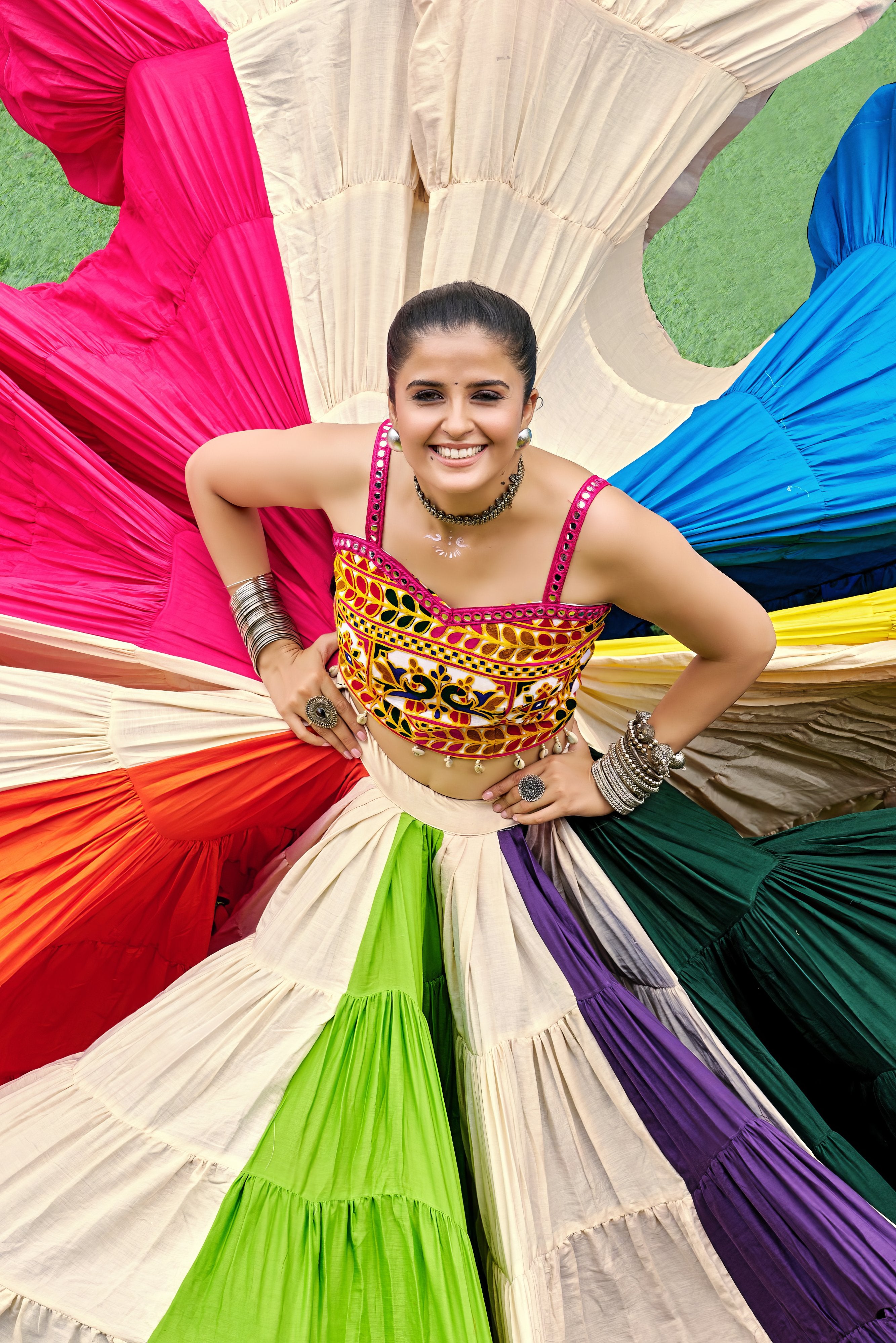 This grand lehenga set is crafted with authentic traditional artistry. The blouse, made of cotton, is adorned with intricate Kutchi handwork and original mirror embellishments, giving it a festive charm. The lehenga, in pure cotton with dyeing work, features an extraordinary flair of 25–26 meters, stitched with canvas and a full inner for a voluminous royal look. The micro cotton lining ensures comfort while maintaining structure. Completing the set is a luxurious Gaji silk dupatta, dyed with Lagadi Patta work for a graceful ethnic finish. With a 41–42 inch length and a waist fit up to 44 inches, this lehenga set is a true showstopper for festive occasions.
