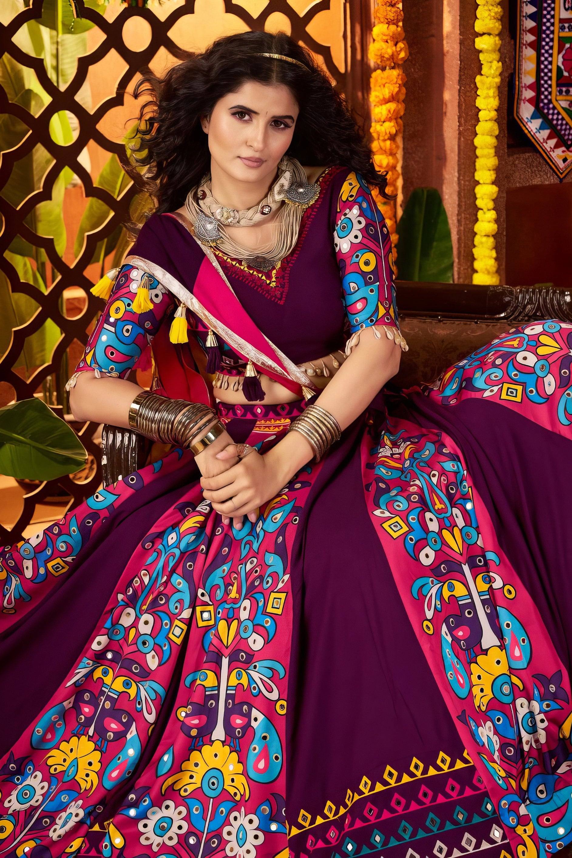 The lehenga is stitched at 40" length with a 42" waist and a 9-meter flair. The blouse is stitched in size M (38"), customizable up to 44". Please refer to the size chart before placing your order.