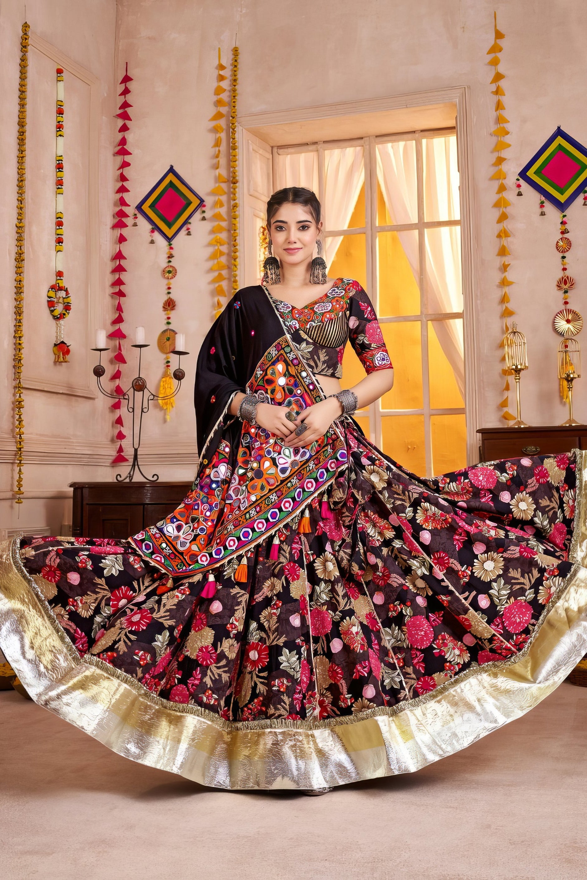 The lehenga is stitched at 40" length with a 42" waist and a 9-meter flair. The blouse is size M (38"), customizable up to 44". Please refer to the size chart before ordering.